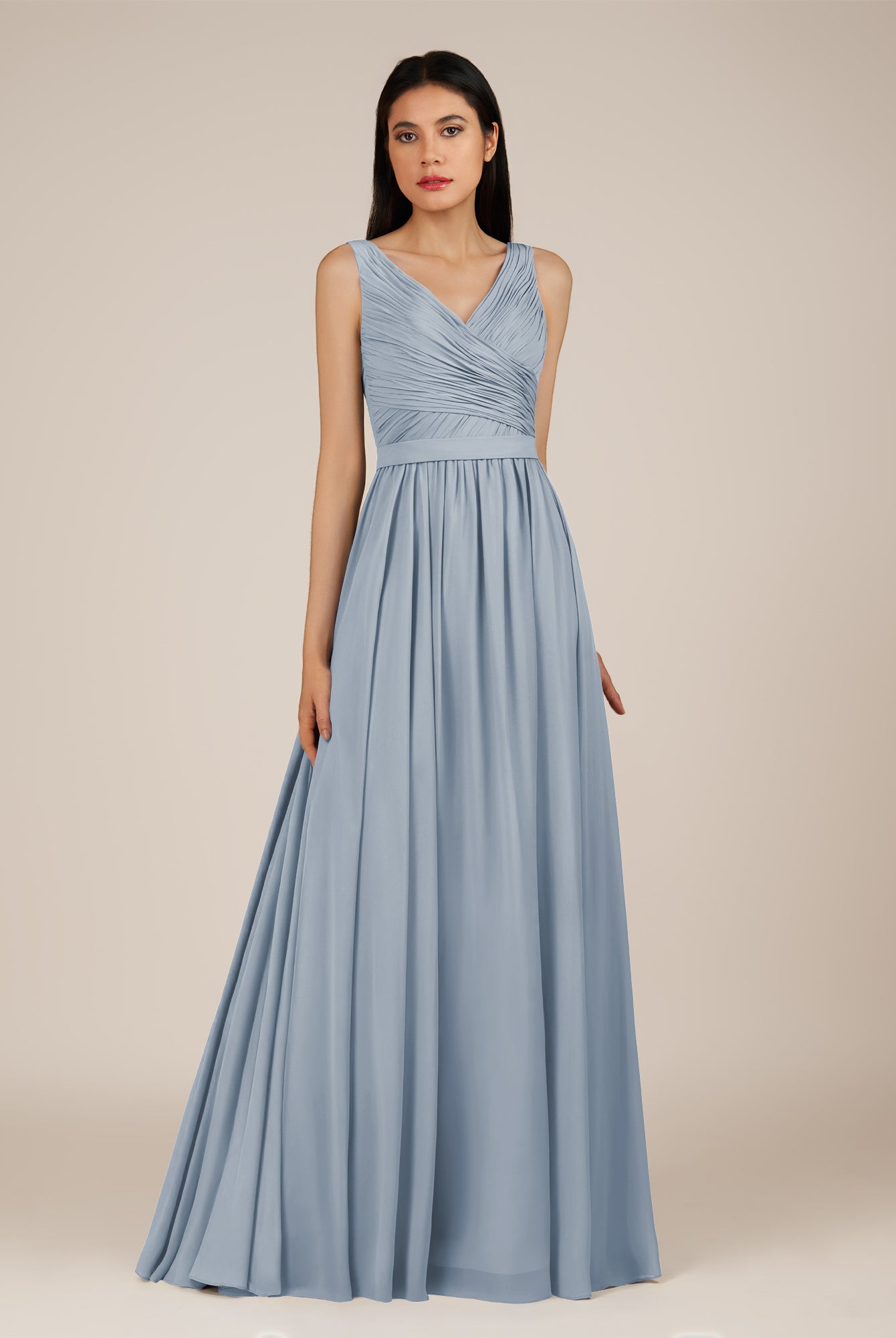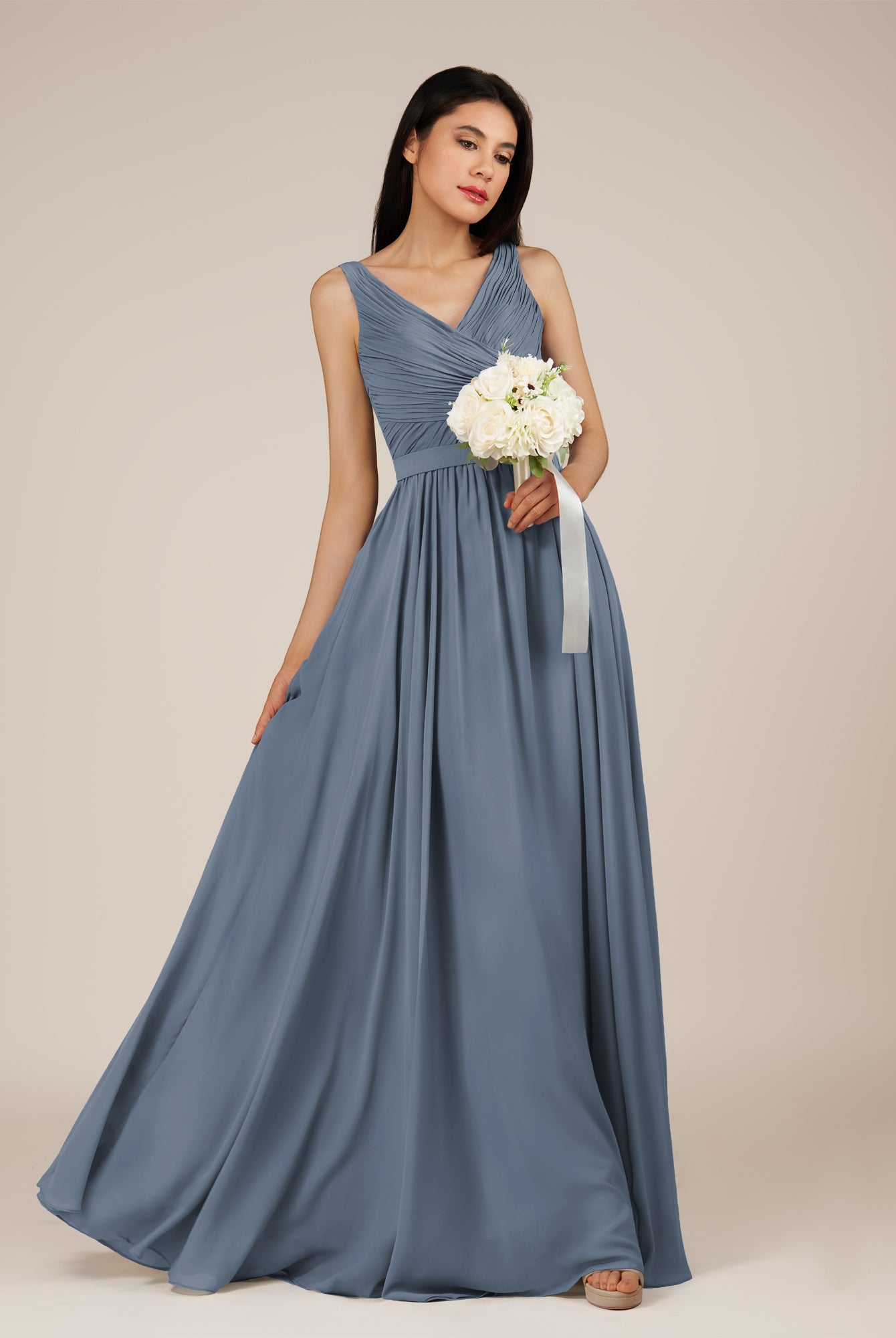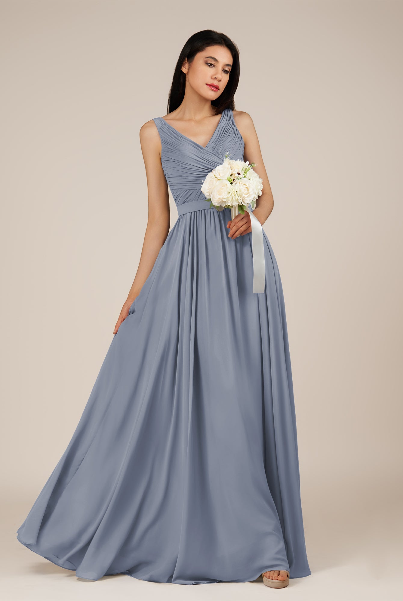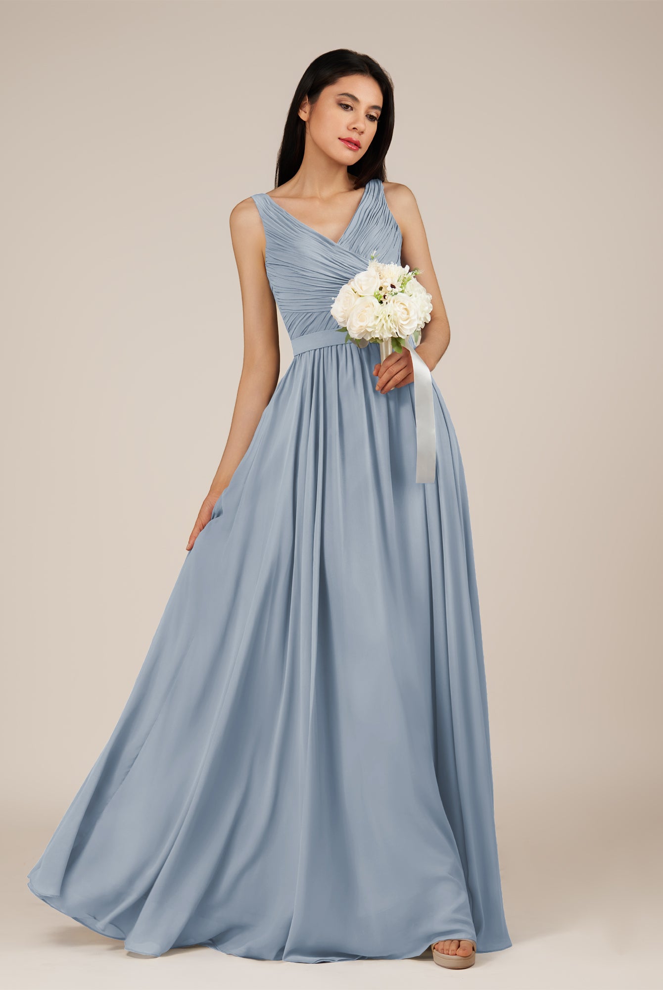 Lysander | Dusty Blue - A Line Chiffon V Neck Pleated Long Bridesmaid Dress