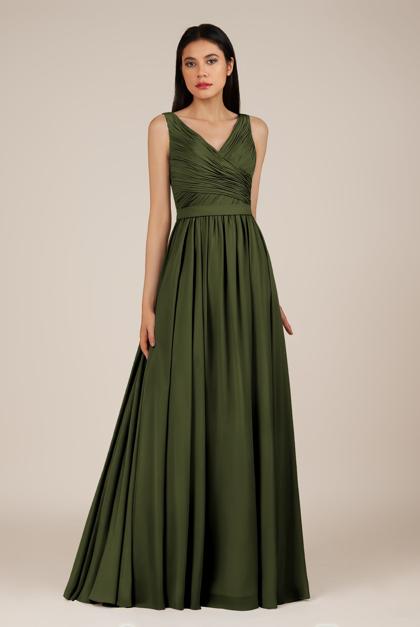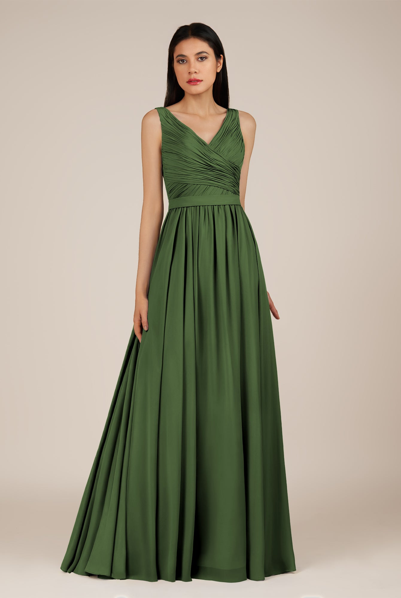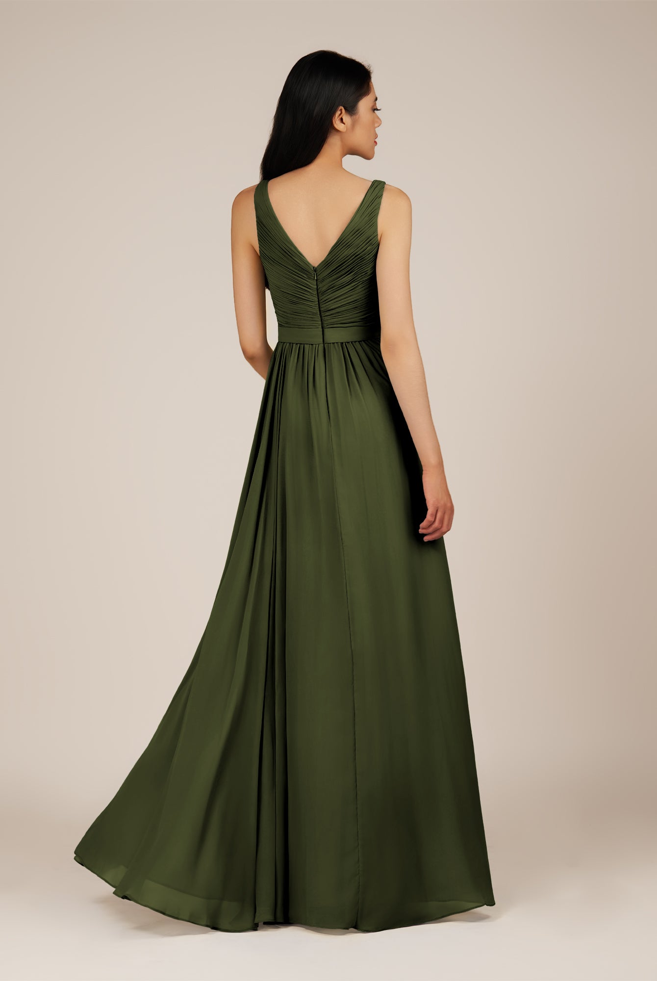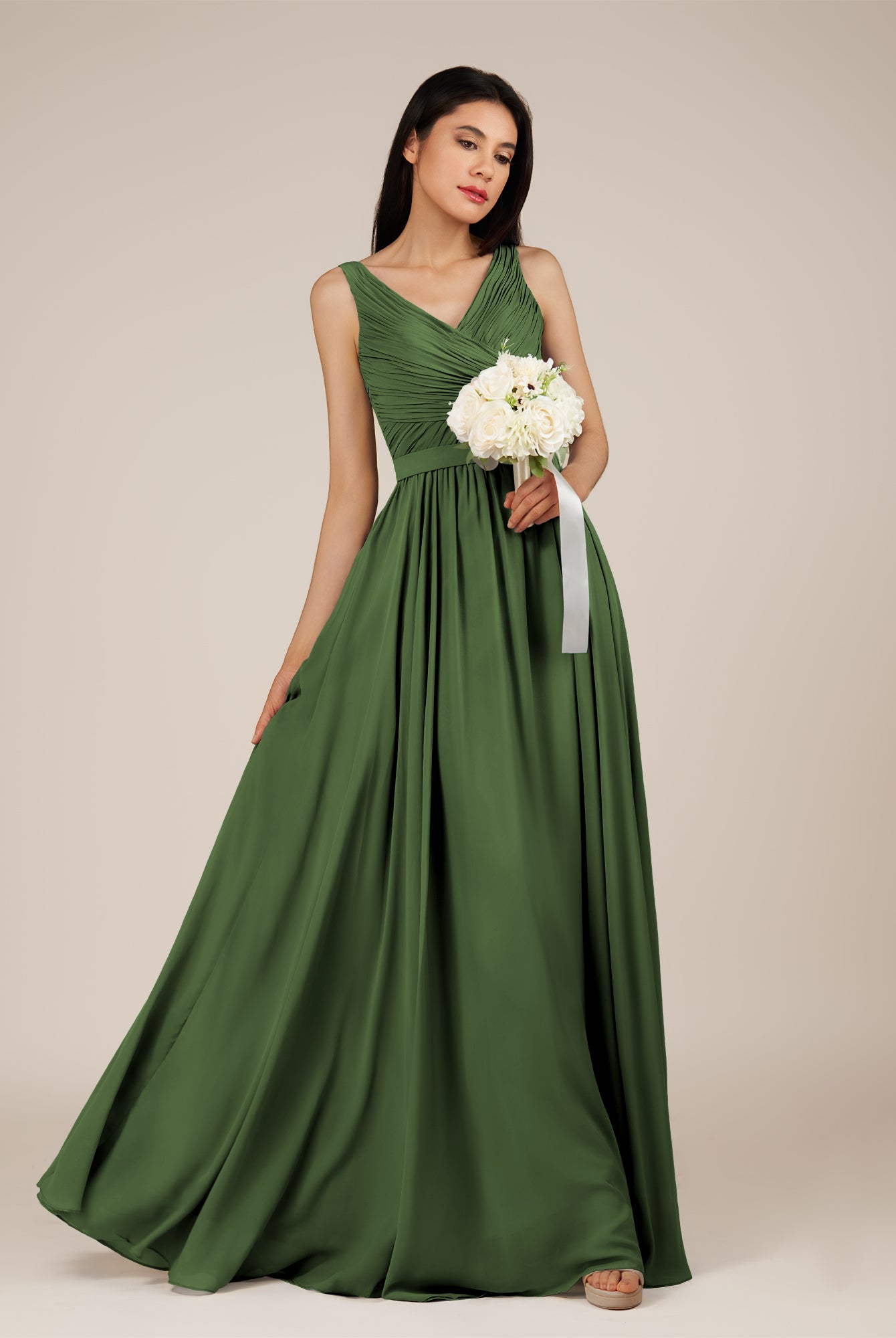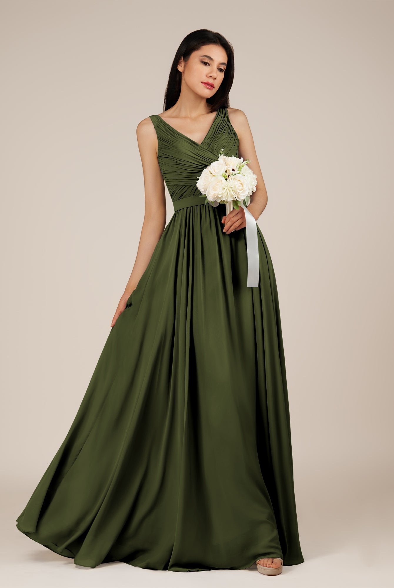 Lysander | Olive - A Line Chiffon V Neck Pleated Long Bridesmaid Dress