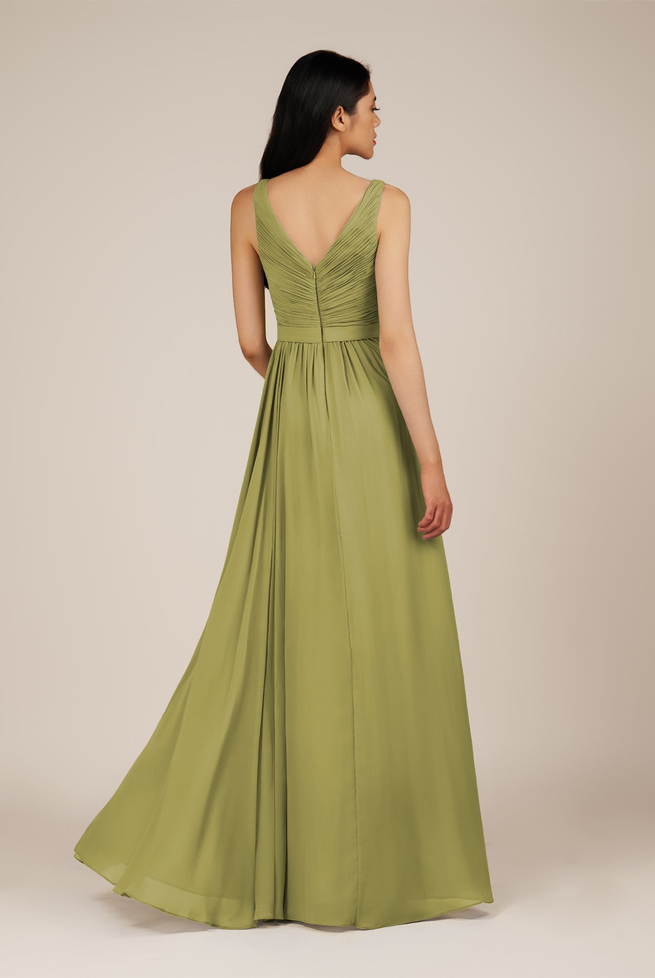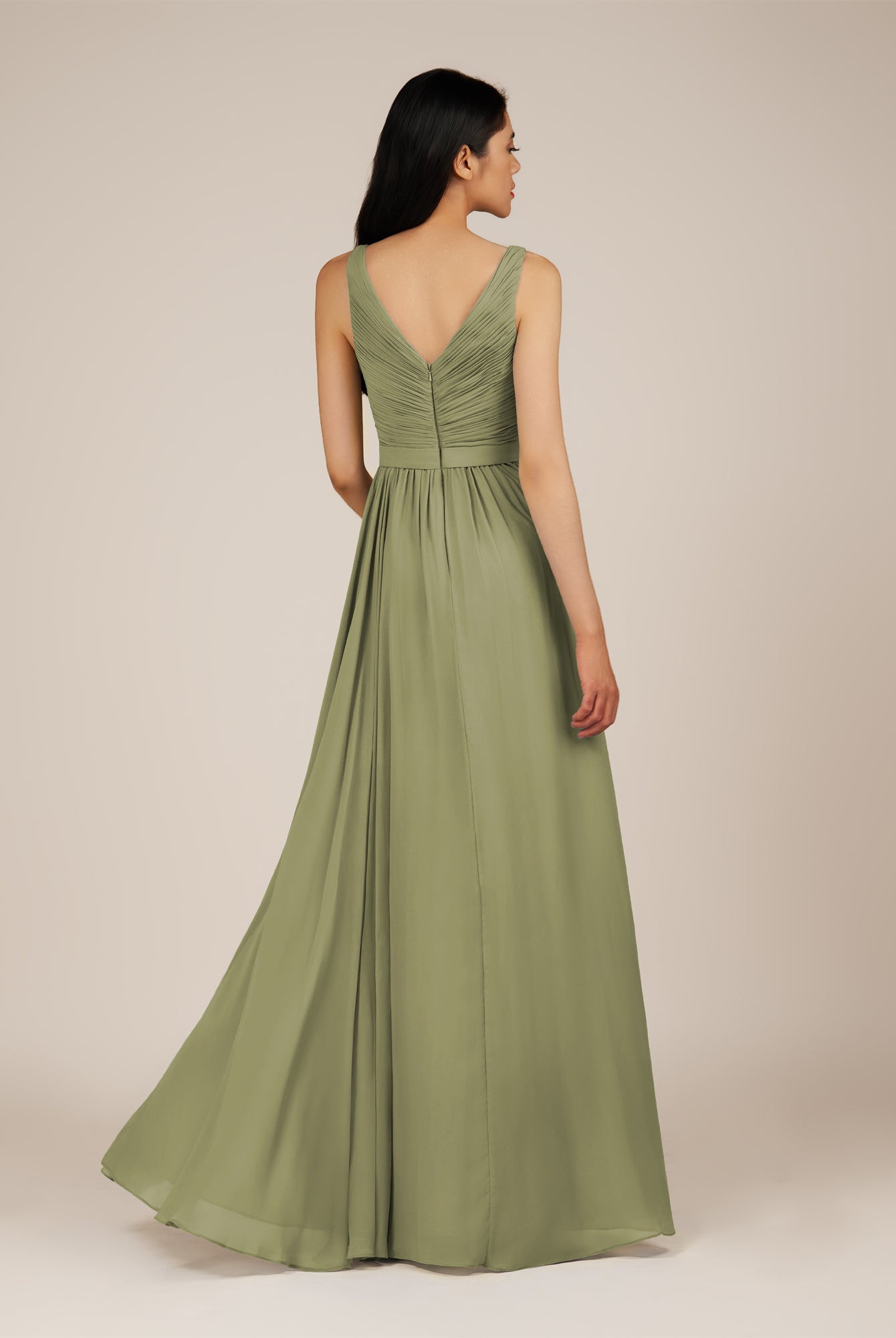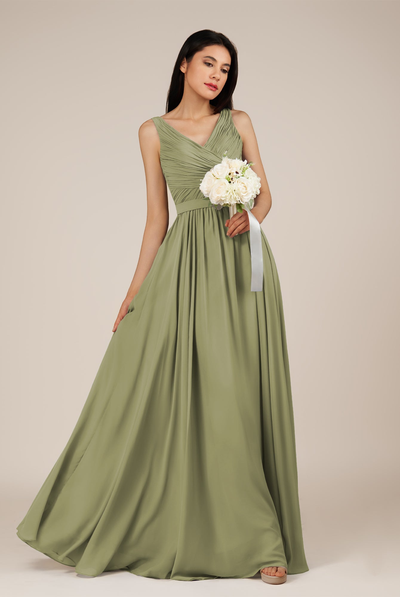 Lysander | Thyme - A Line Chiffon V Neck Pleated Long Bridesmaid Dress