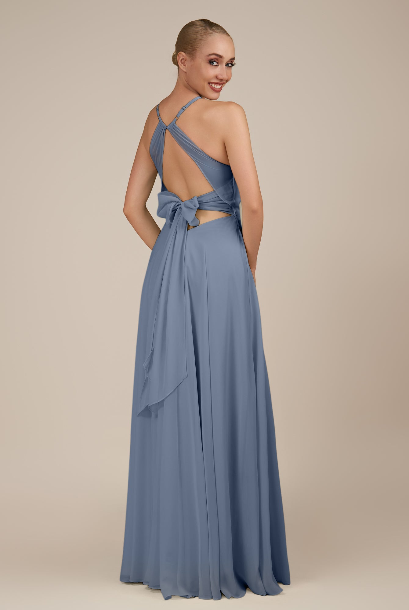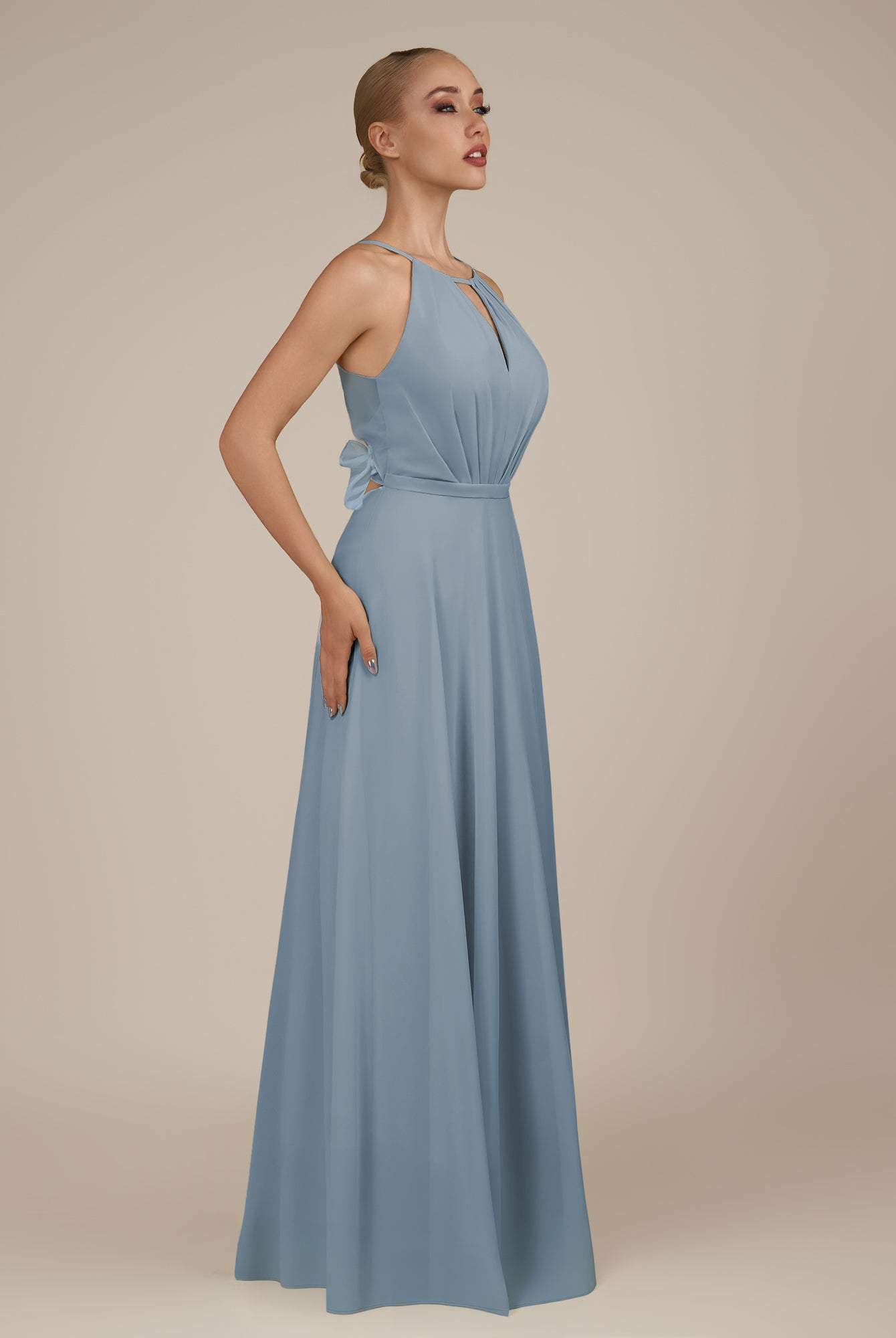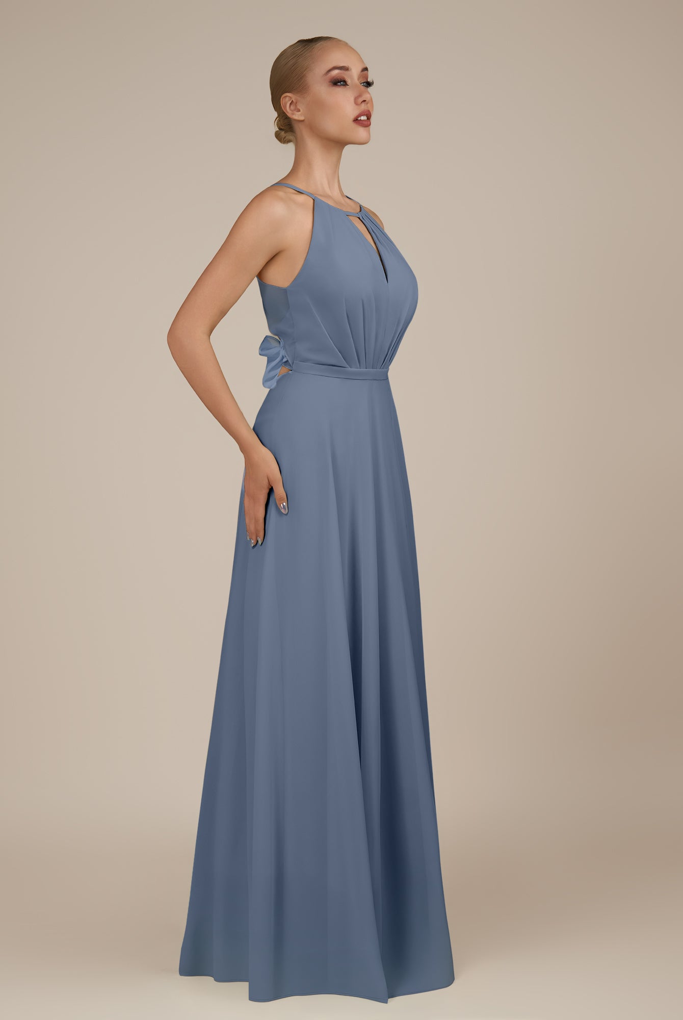 Illyria | Dusk Blue - A Line Chiffon Halter Neck Long Bridesmaid Dress with Cut Out