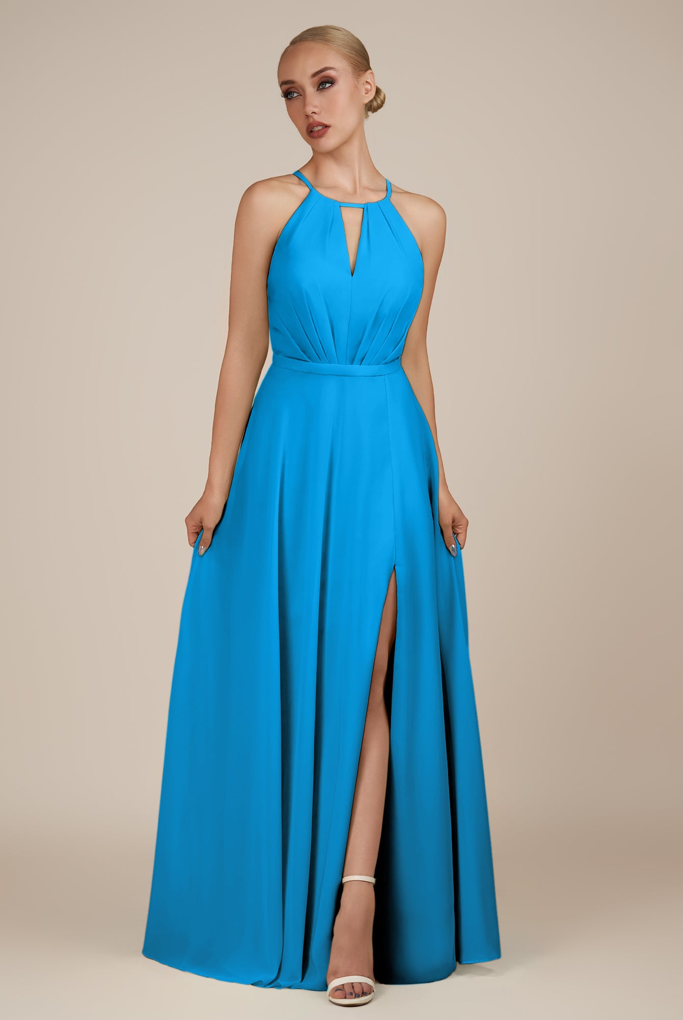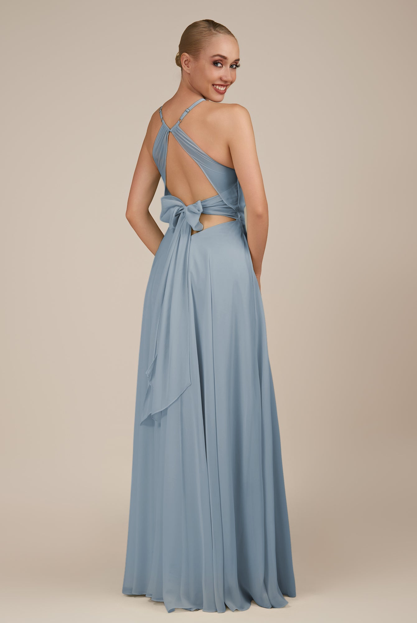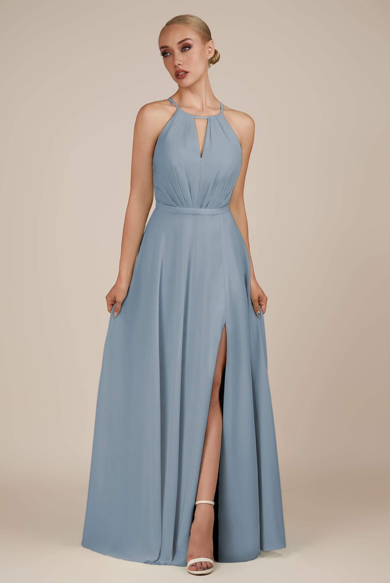 Illyria | Dusk Blue - A Line Chiffon Halter Neck Long Bridesmaid Dress with Cut Out