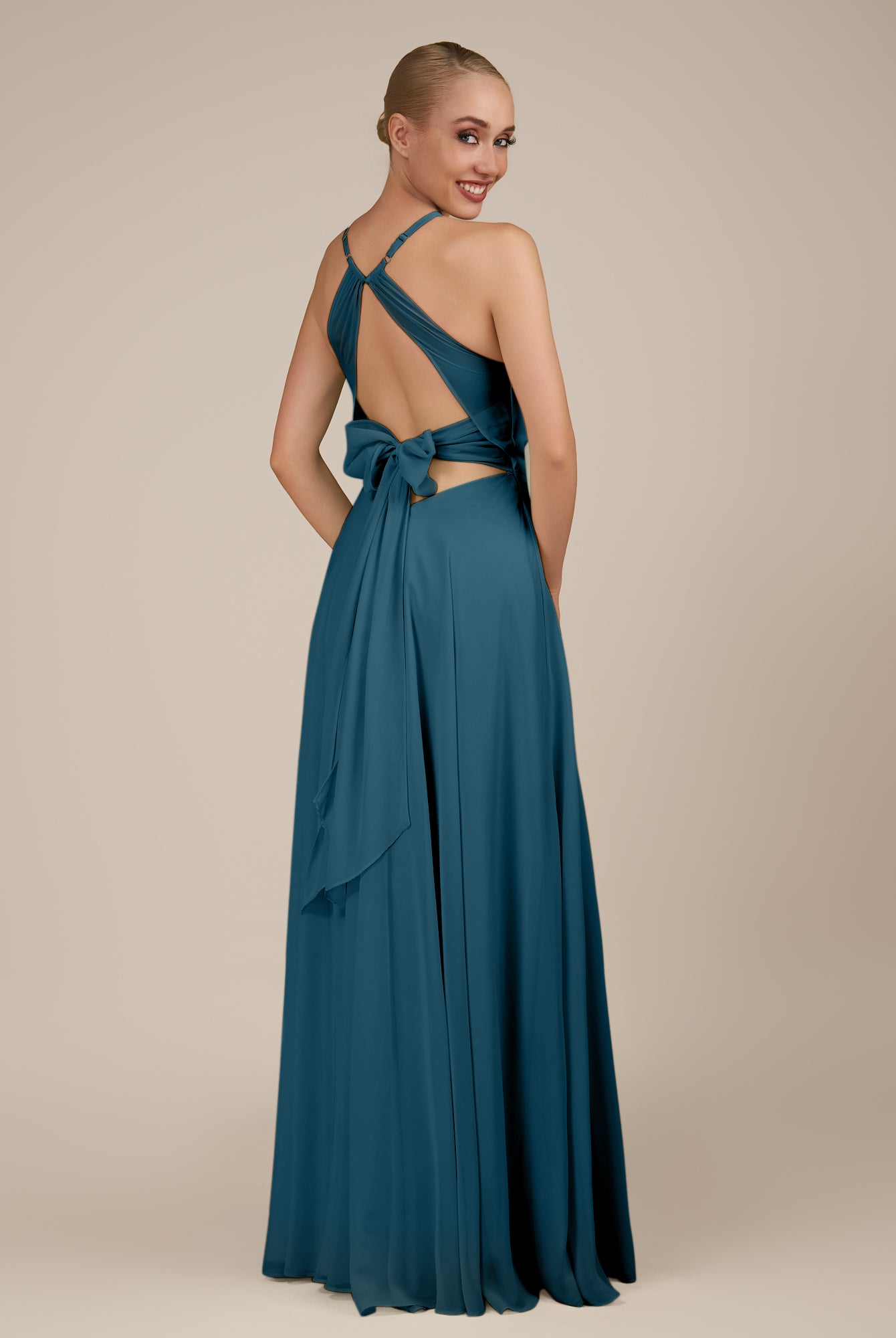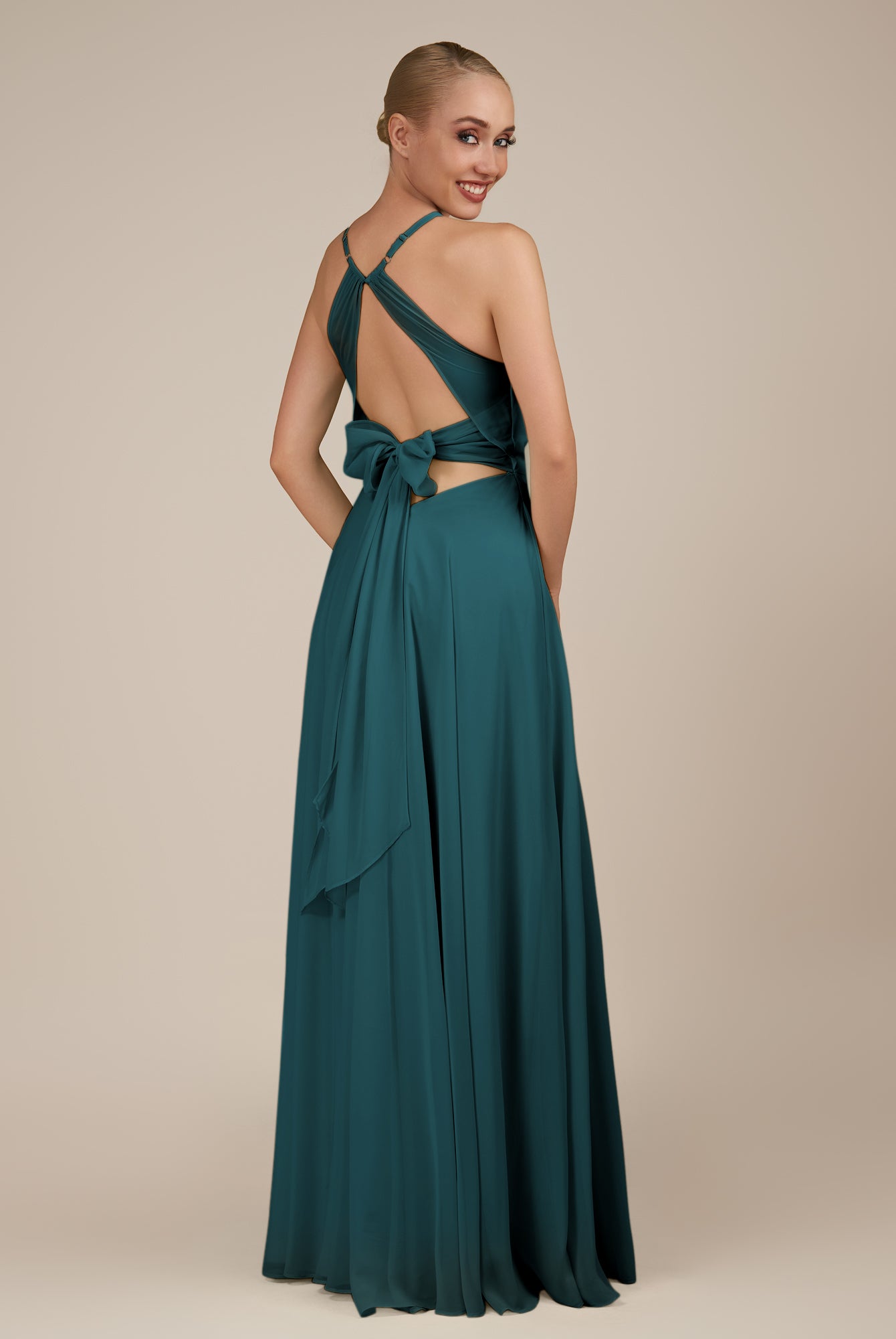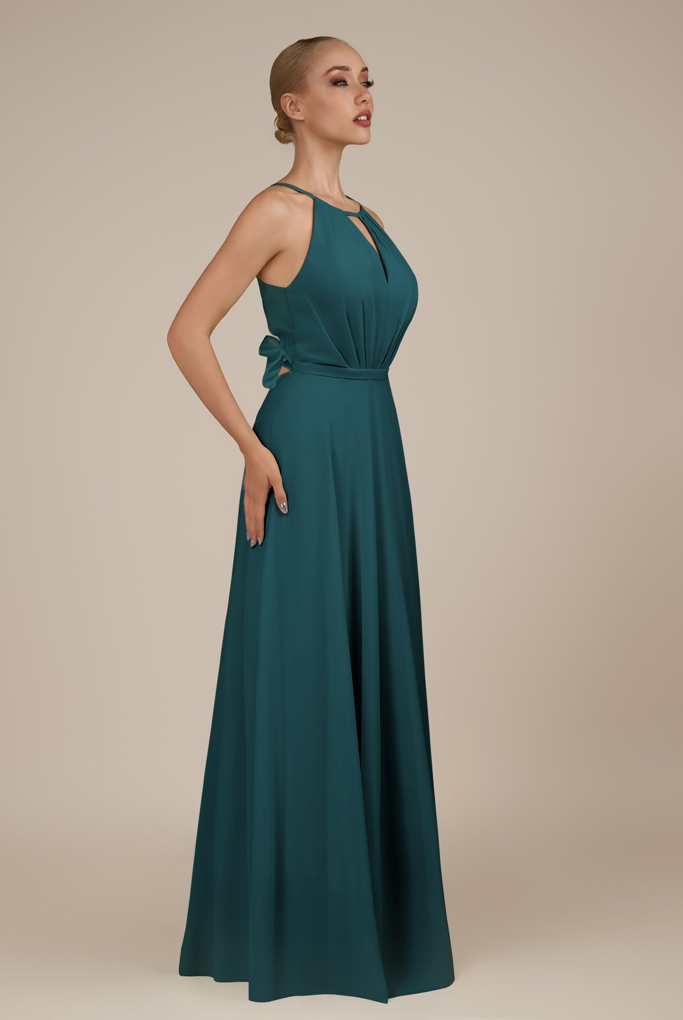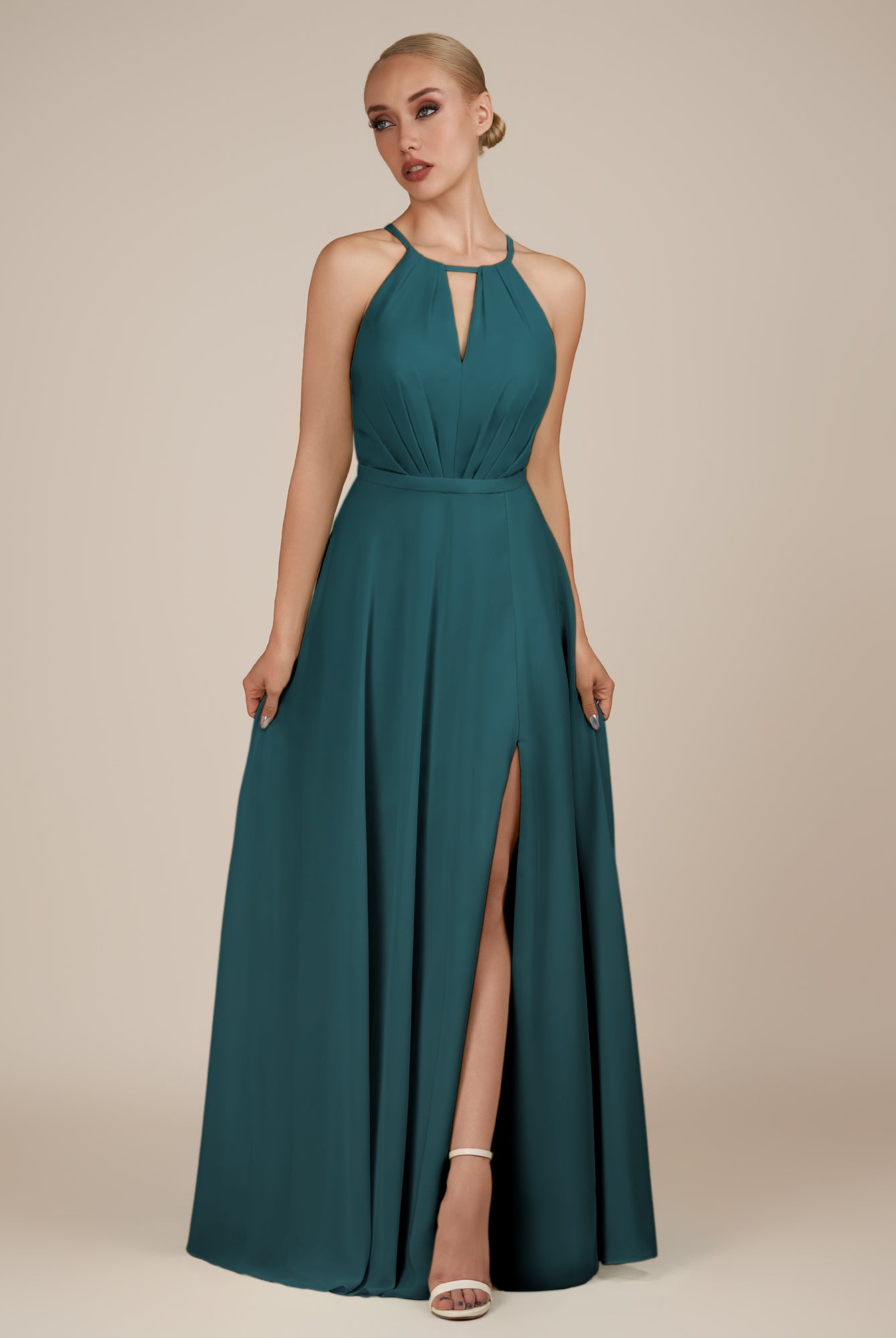 Illyria | Dark Teal - A Line Chiffon Halter Neck Long Bridesmaid Dress with Cut Out