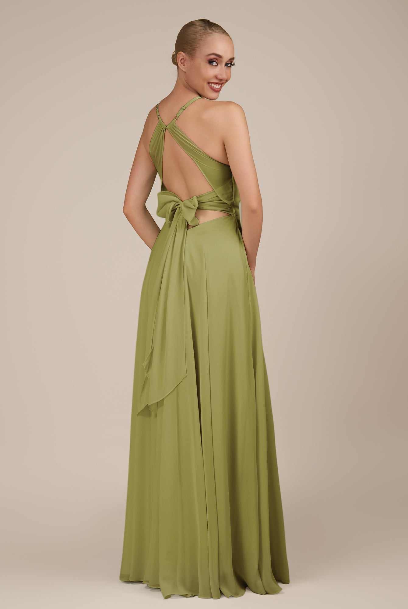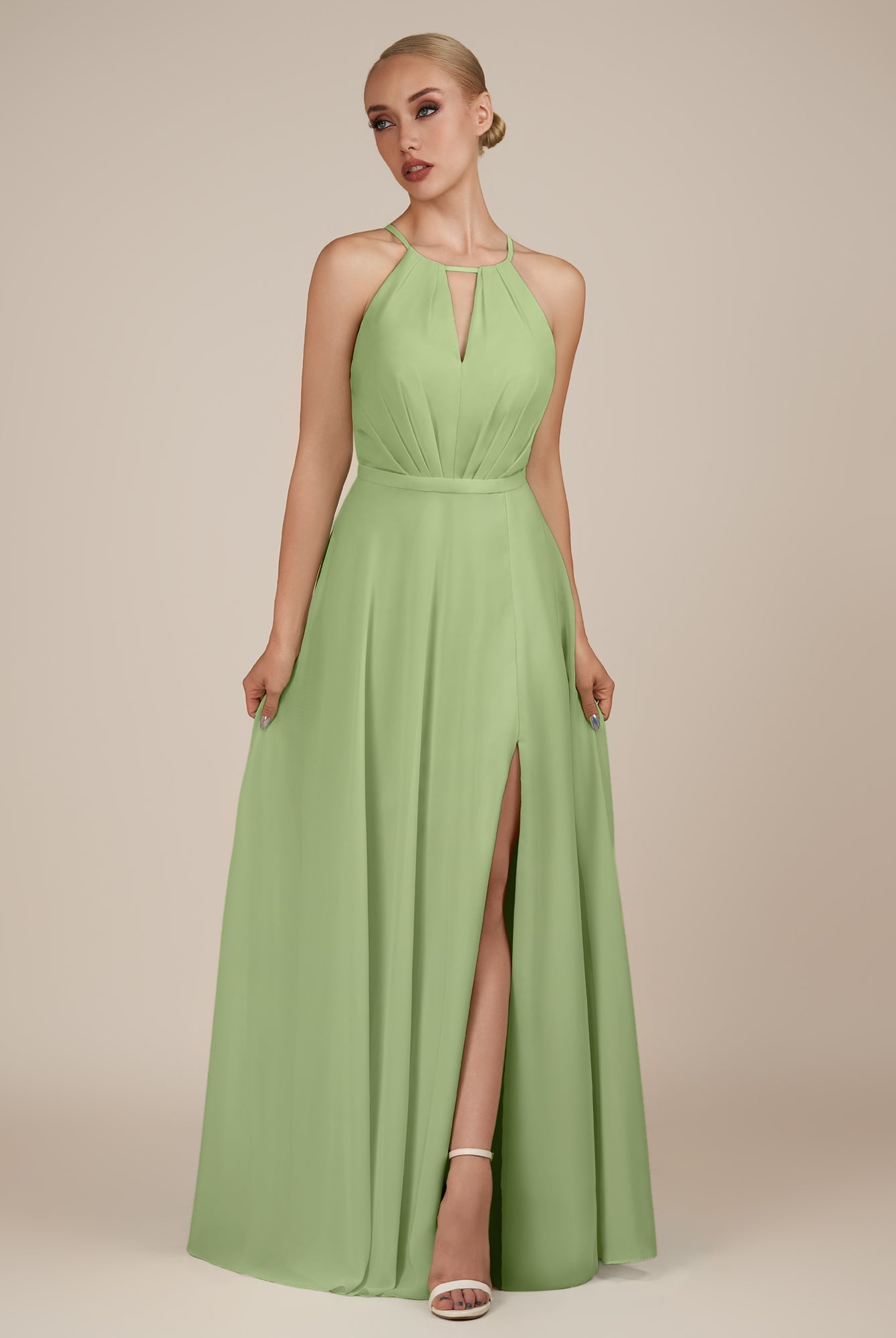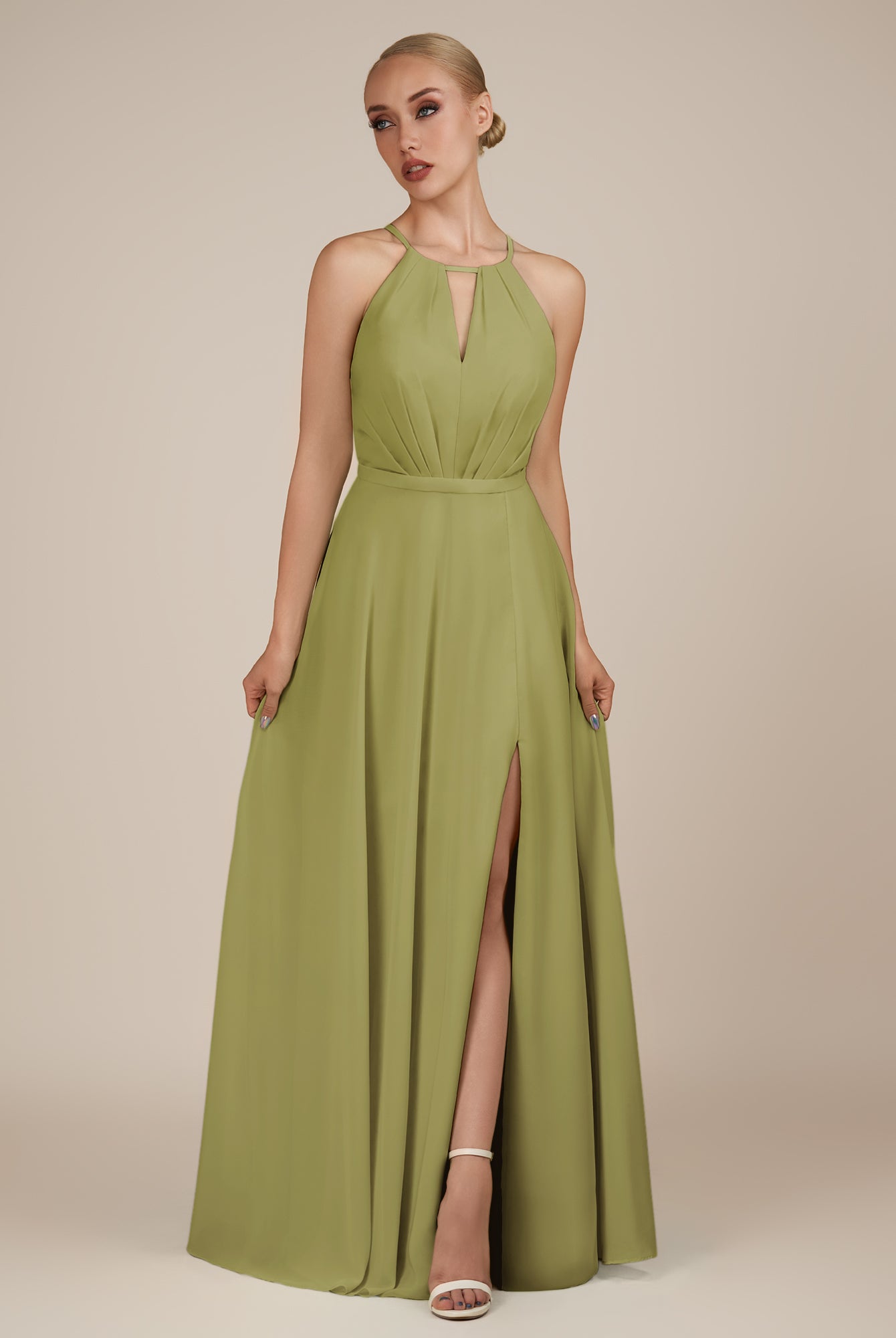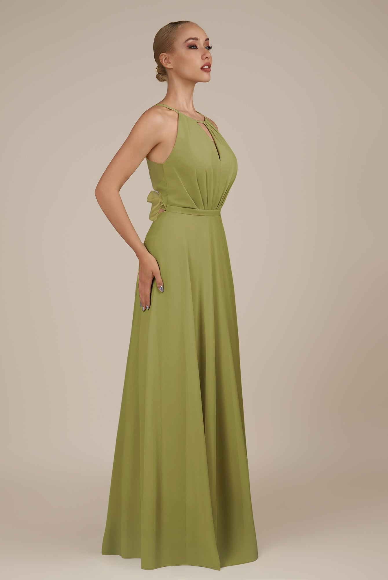 Illyria | Matcha - A Line Chiffon Halter Neck Long Bridesmaid Dress with Cut Out