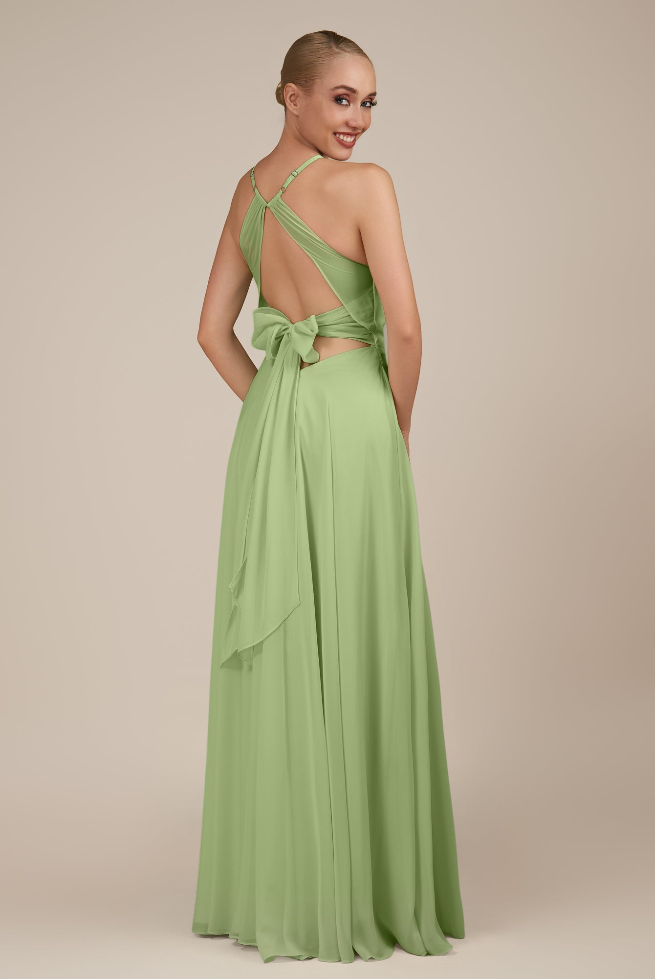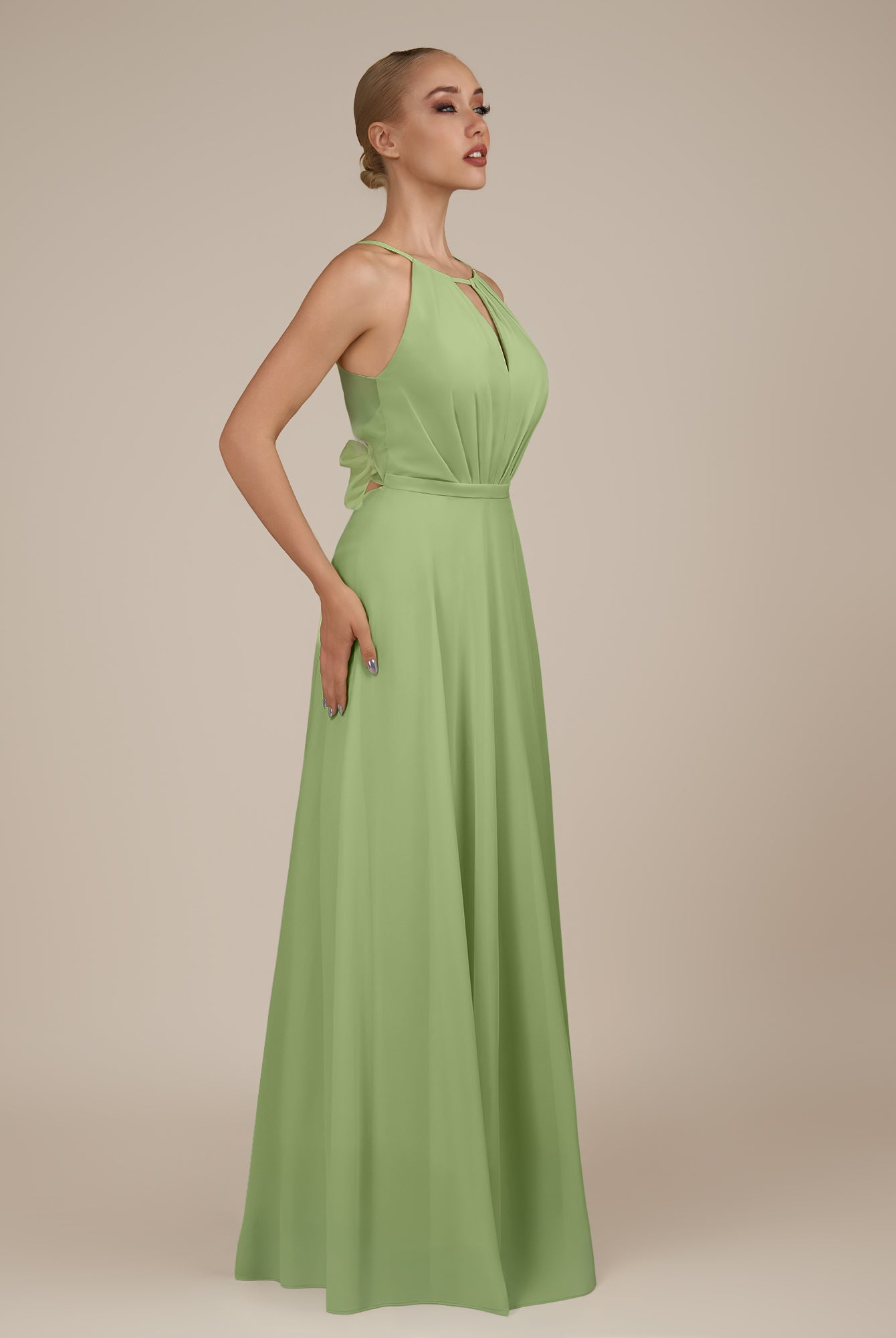 Illyria | Sage - A Line Chiffon Halter Neck Long Bridesmaid Dress with Cut Out
