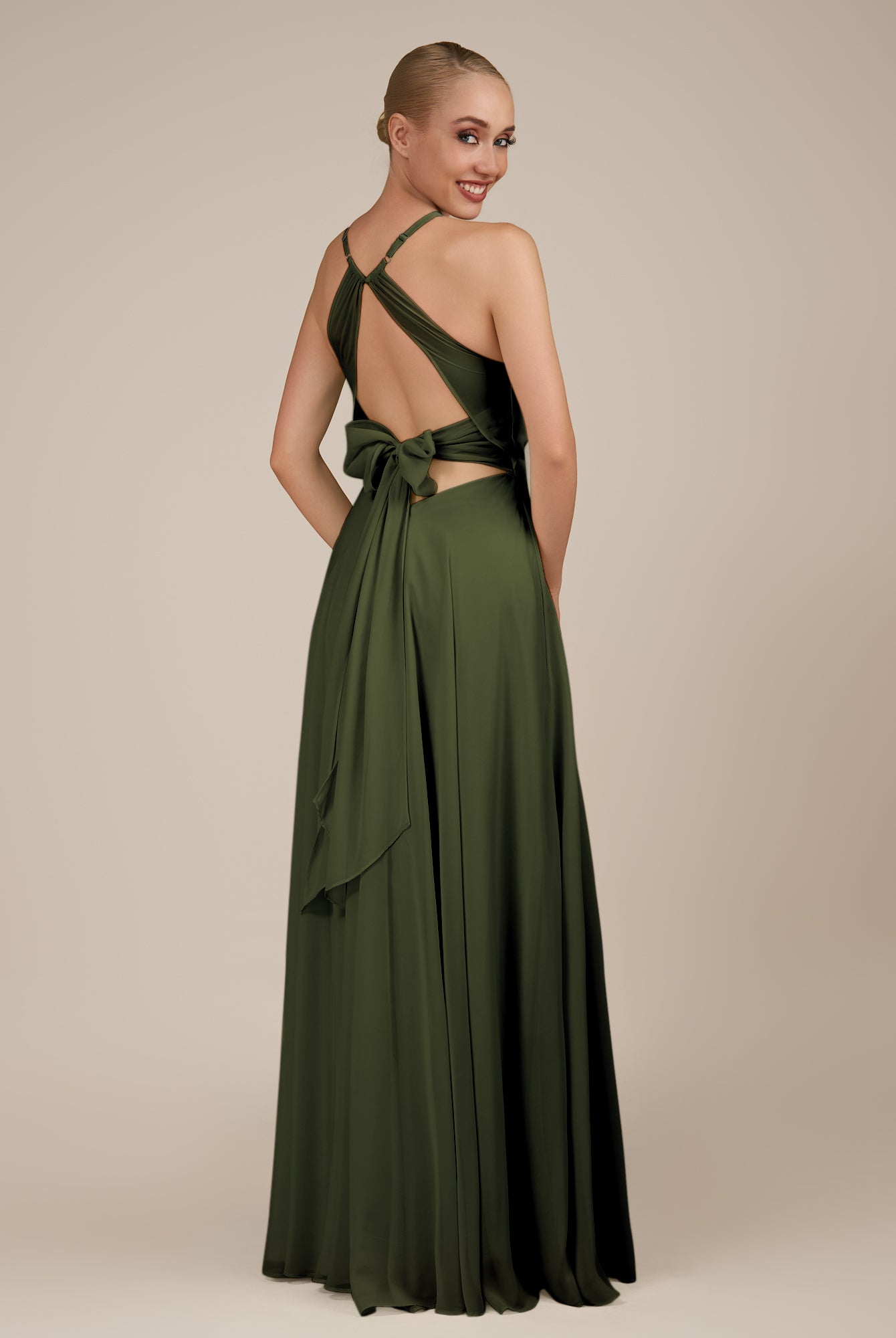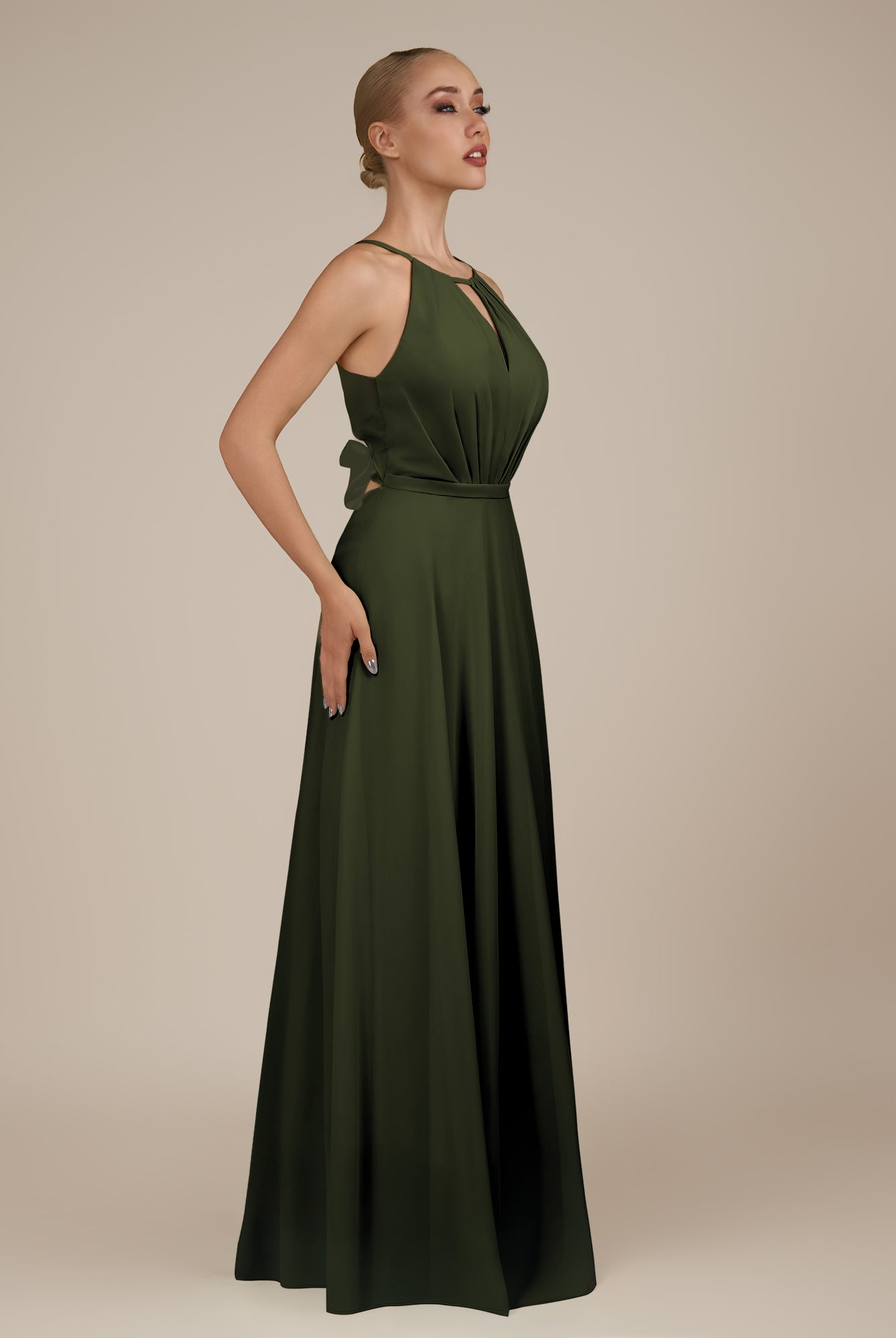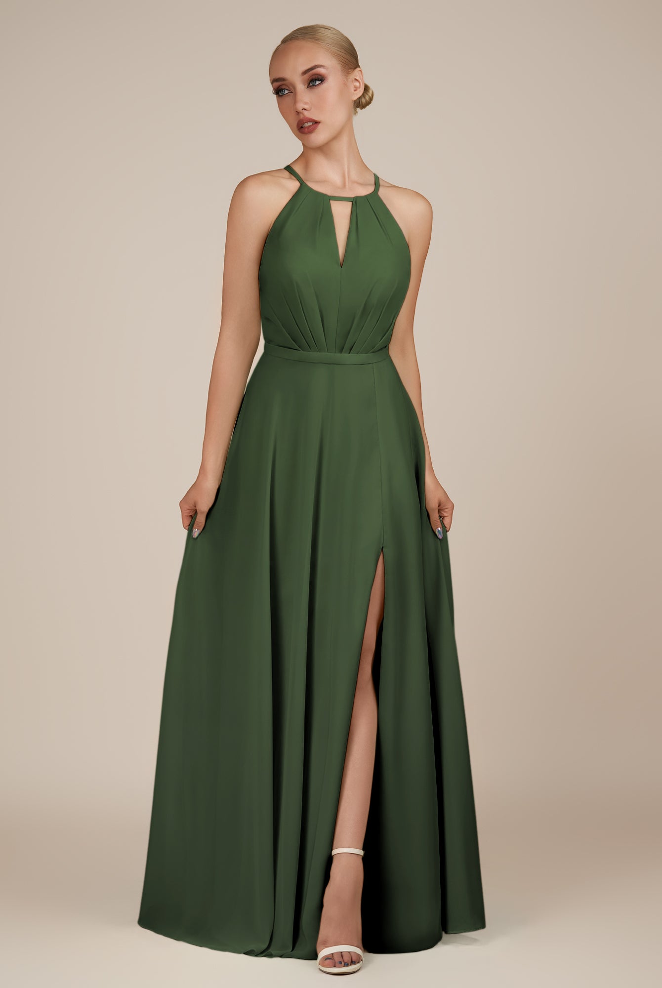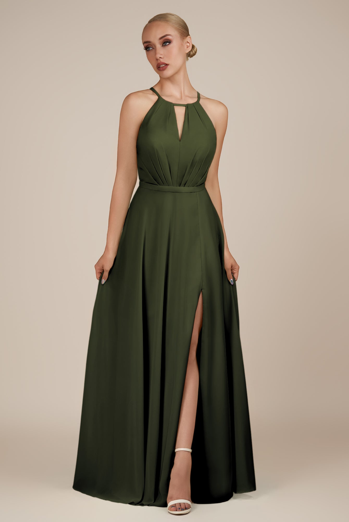 Illyria | Olive - A Line Chiffon Halter Neck Long Bridesmaid Dress with Cut Out