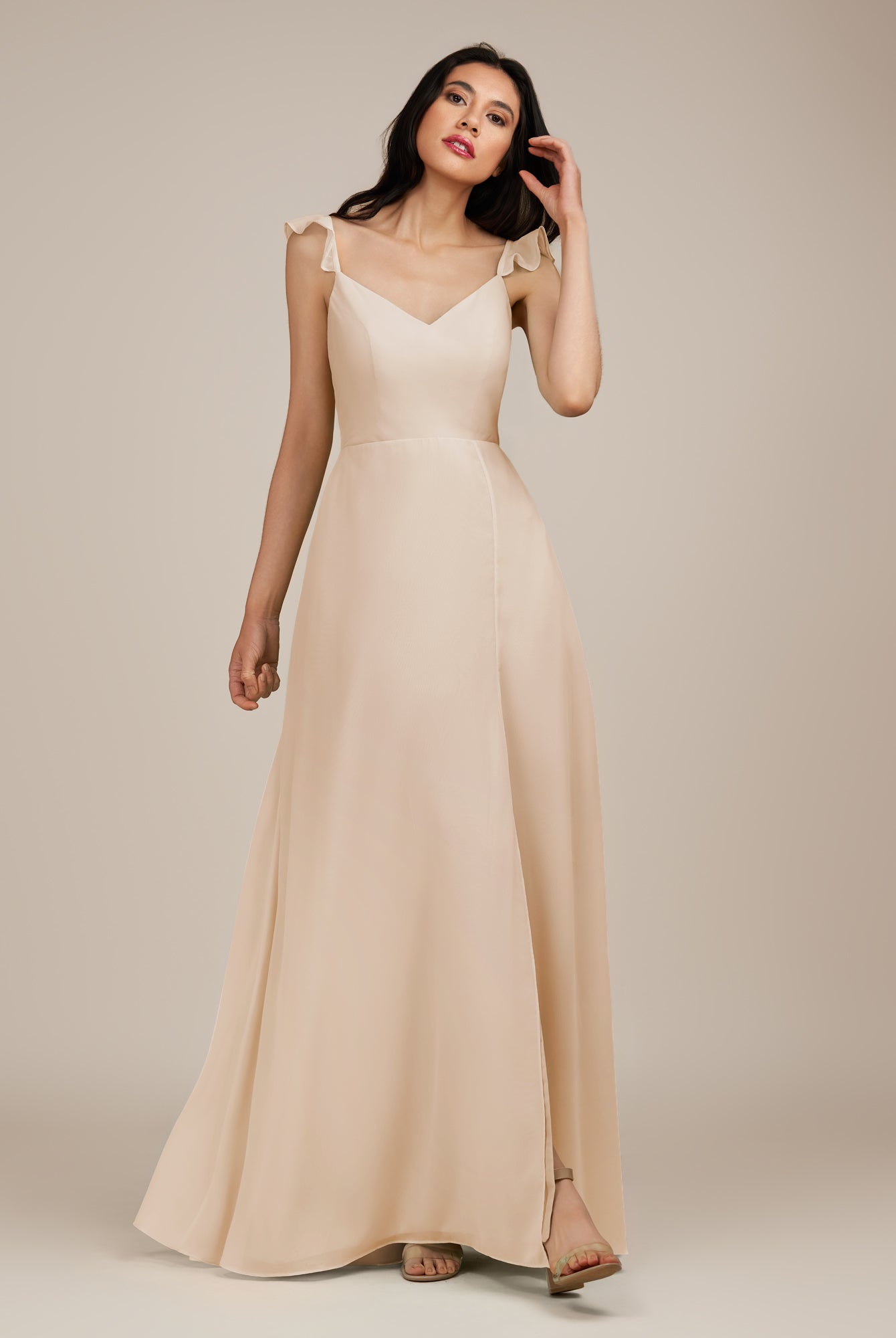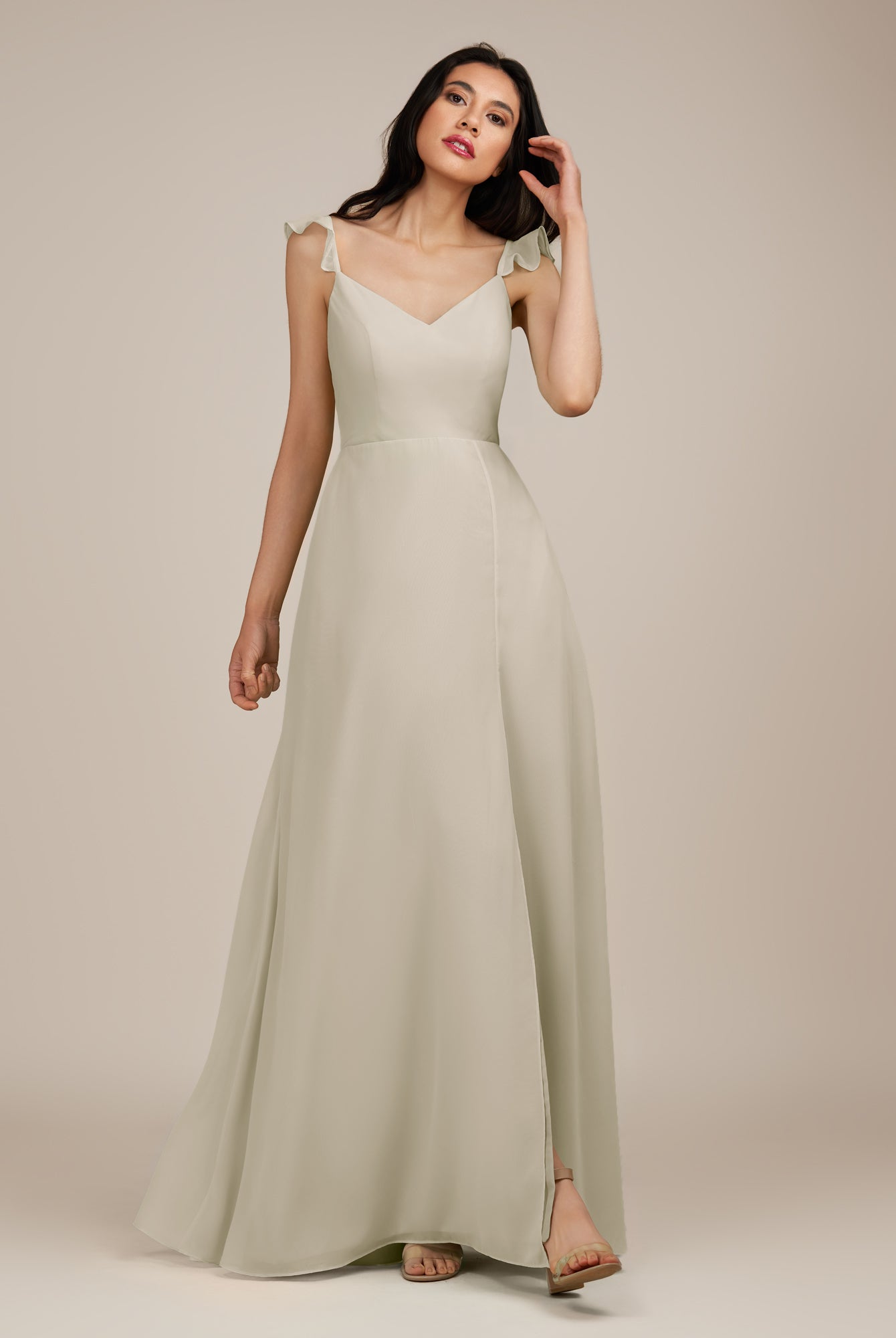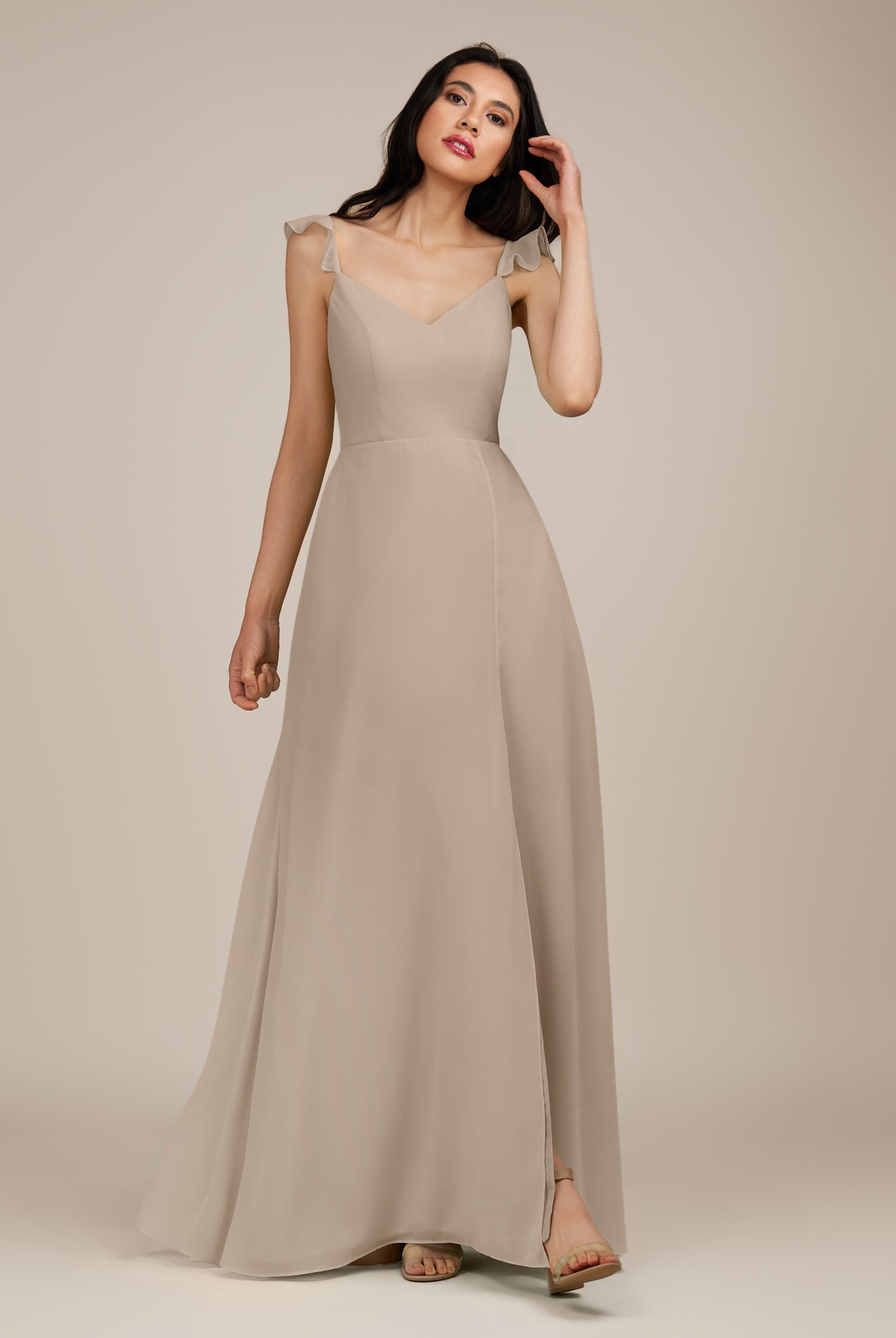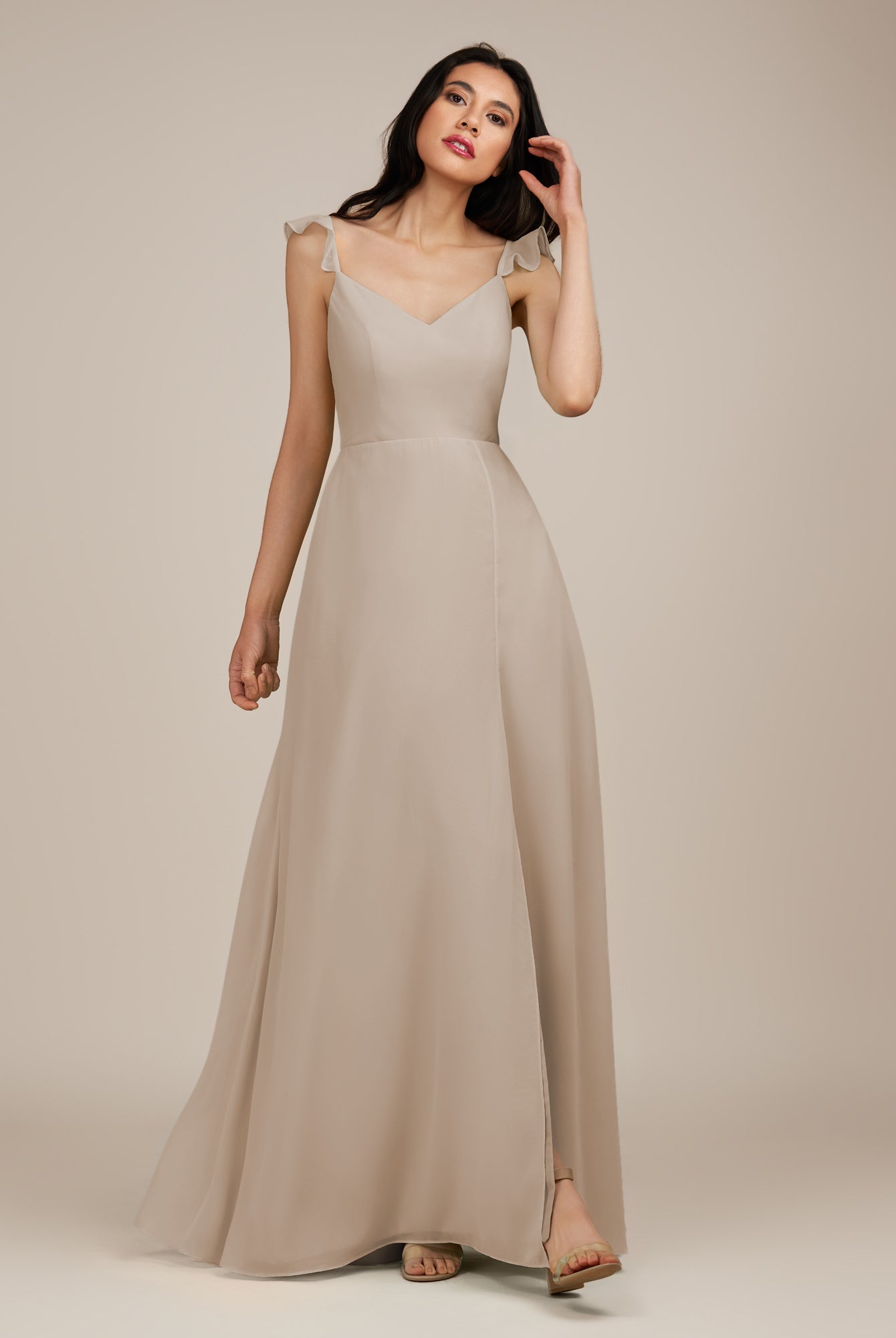 Citrine | Almond - A Line V Neck Chiffon Ruffled Long Bridesmaid Dress with Slit