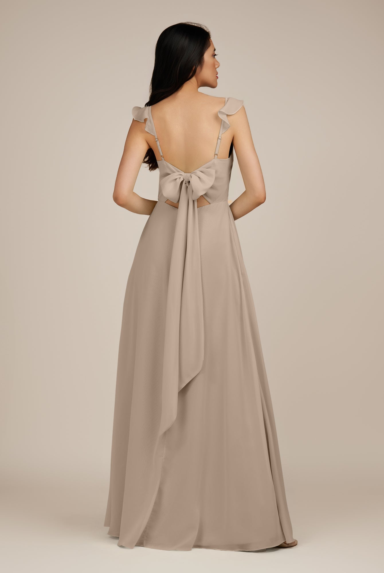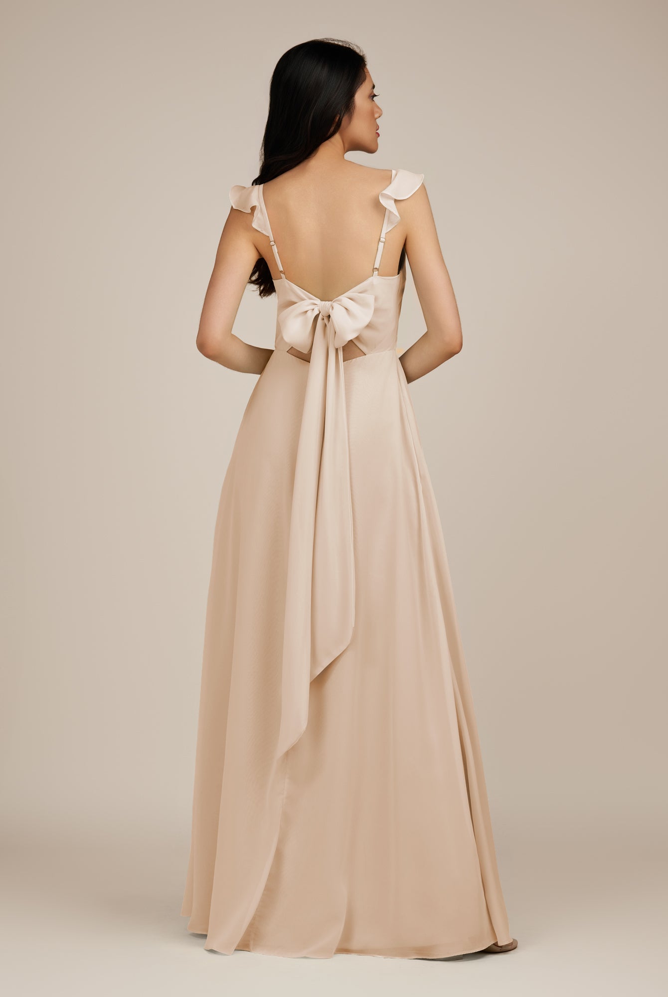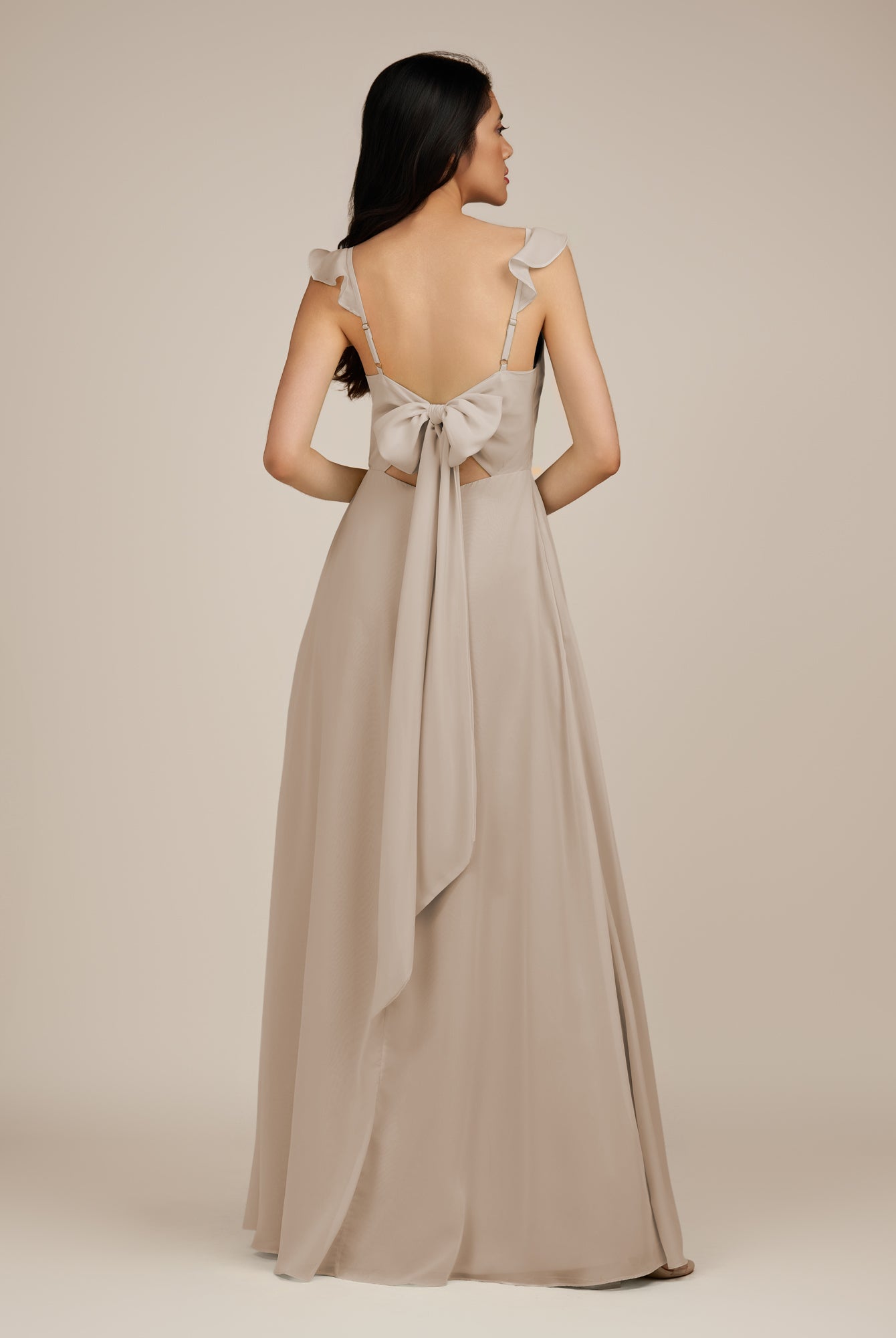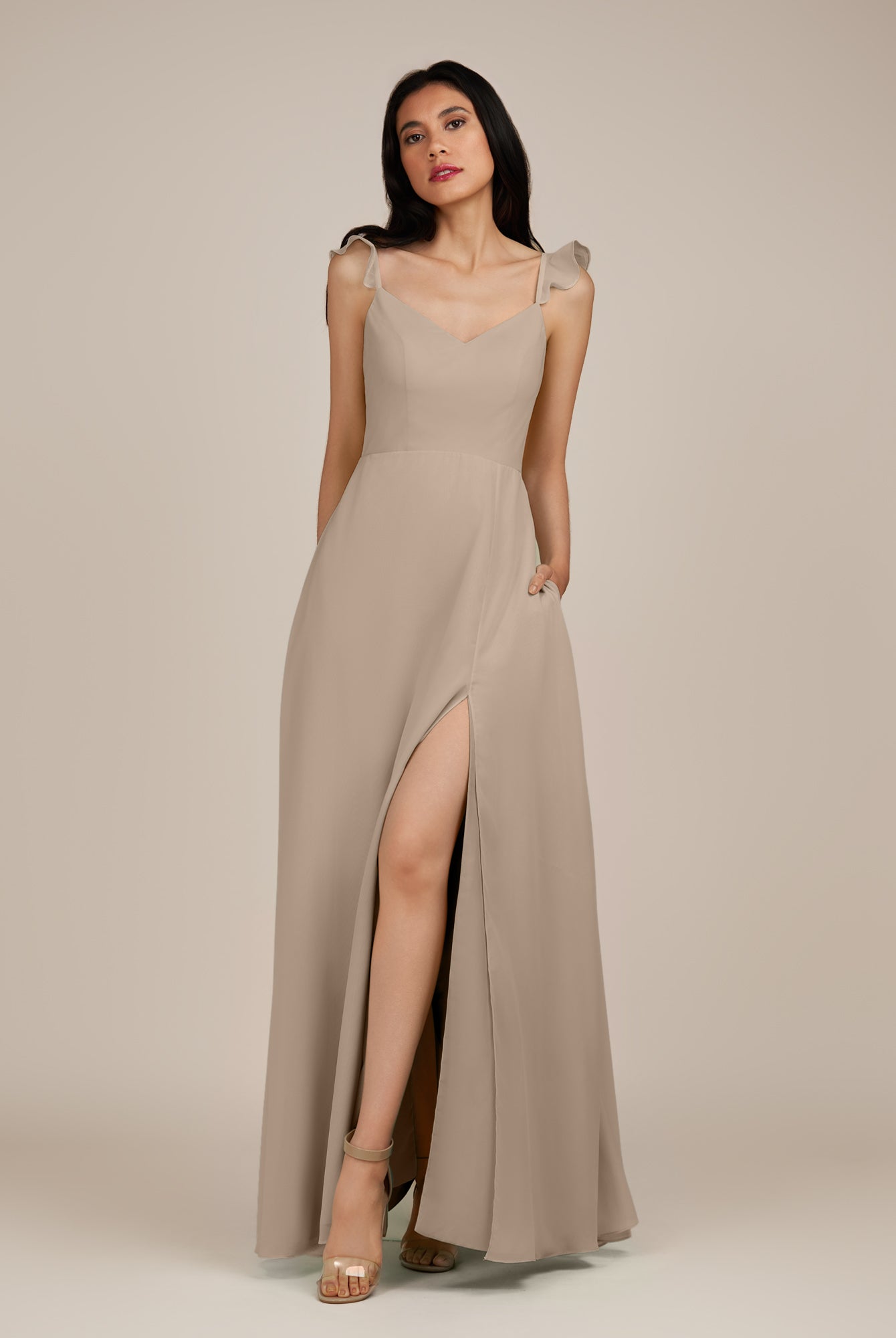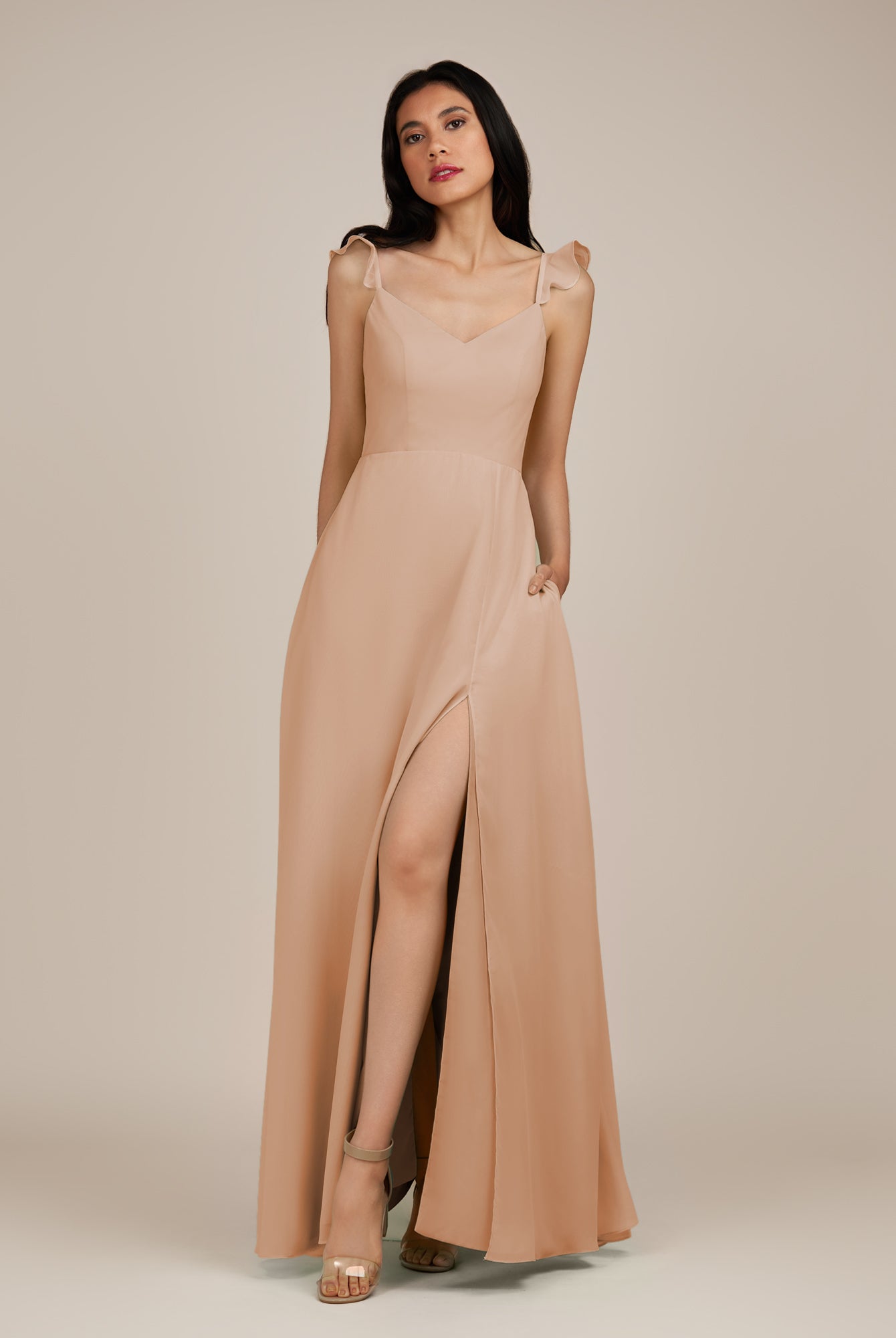 Citrine | Almond - A Line V Neck Chiffon Ruffled Long Bridesmaid Dress with Slit
