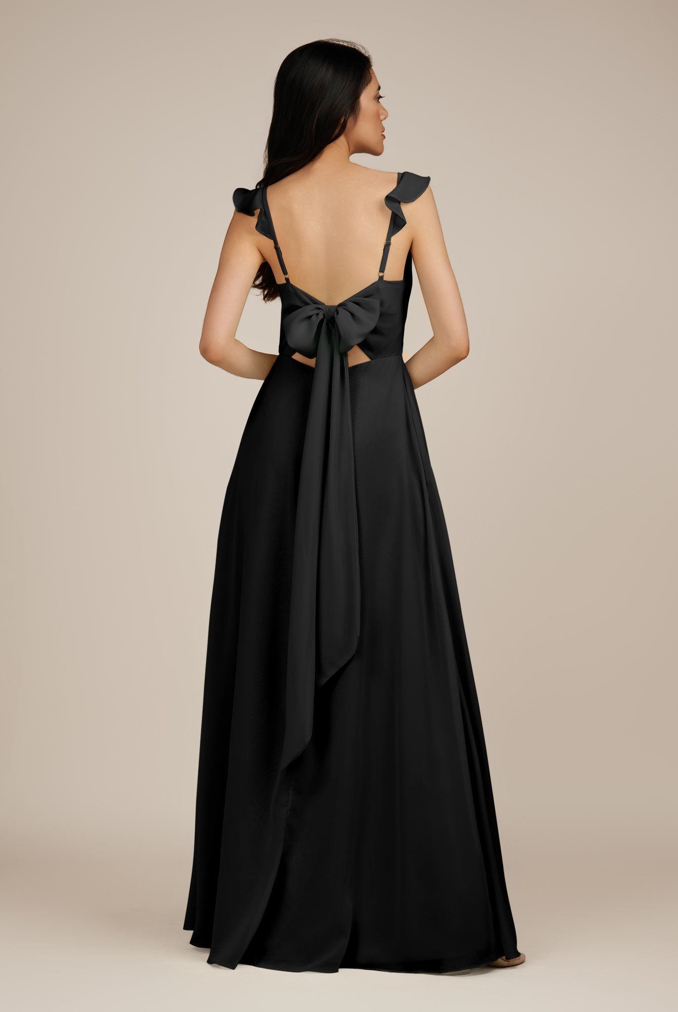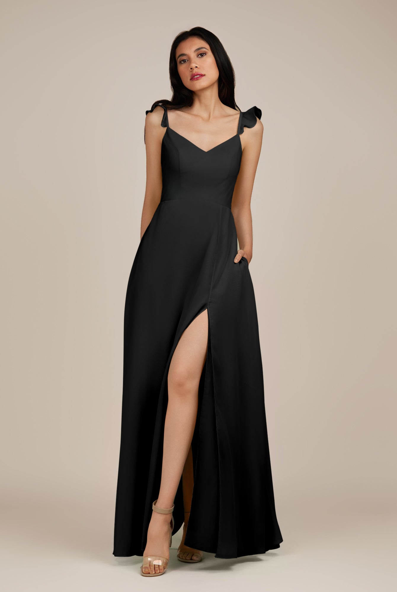 Citrine | Black - A Line V Neck Chiffon Ruffled Long Bridesmaid Dress with Slit