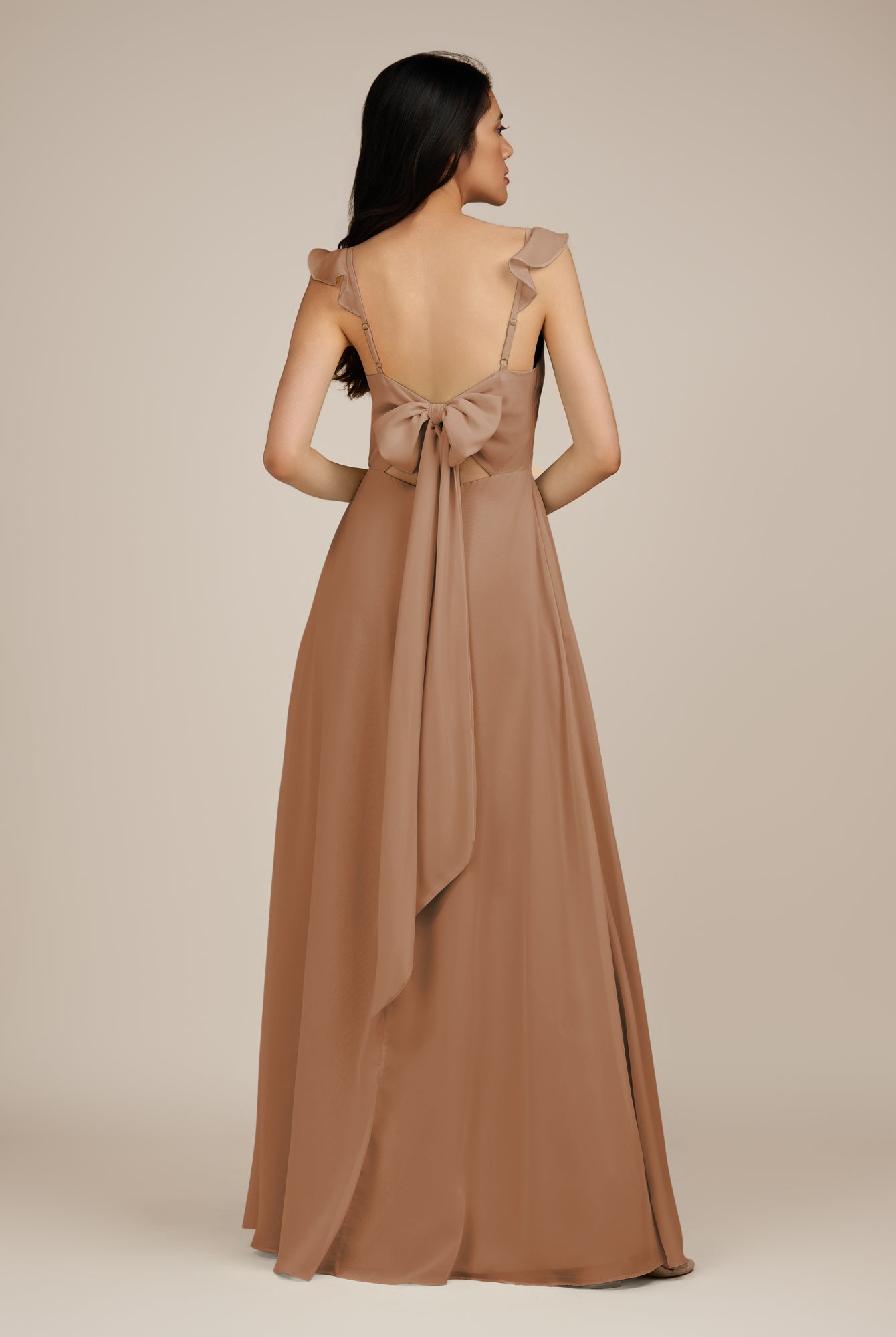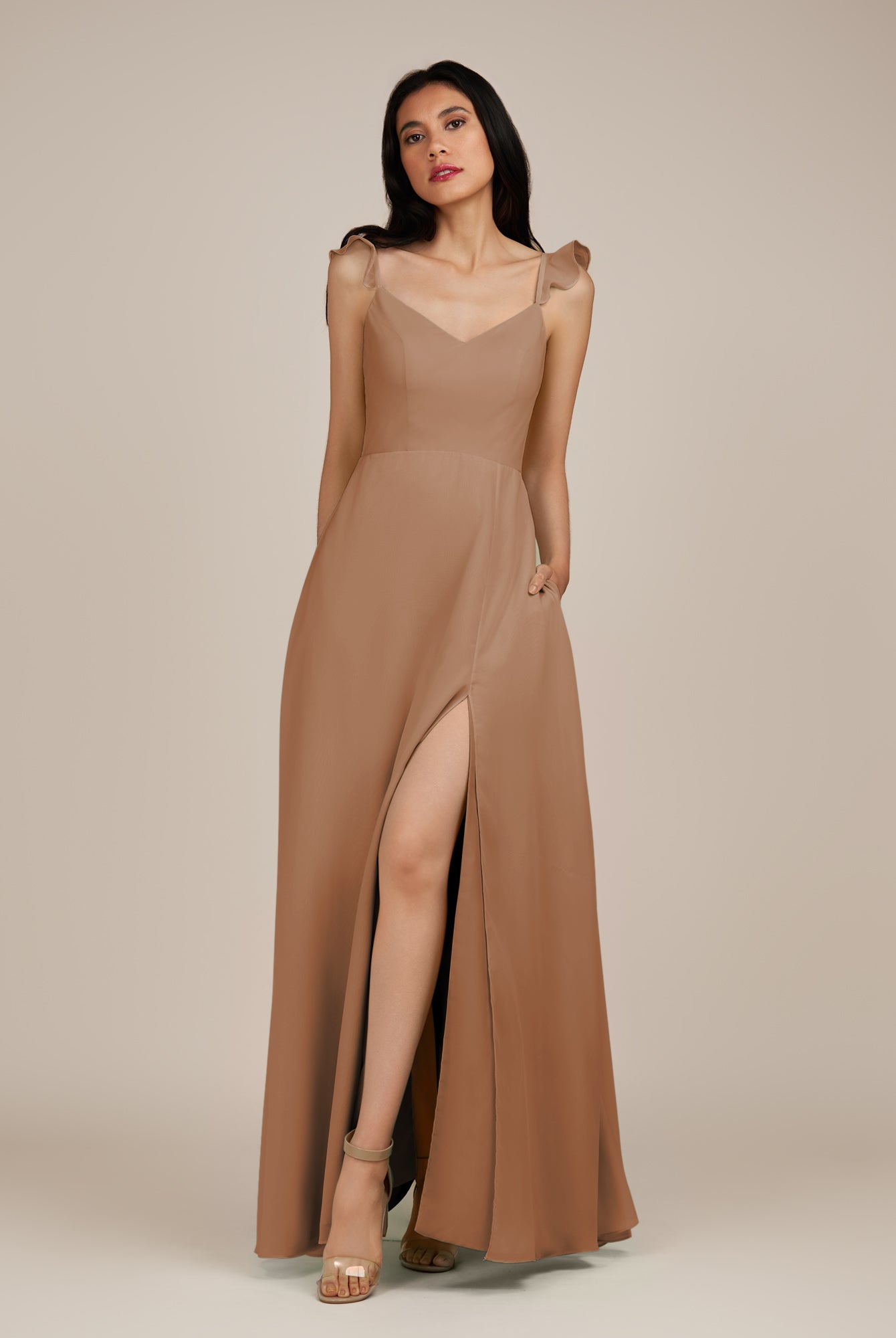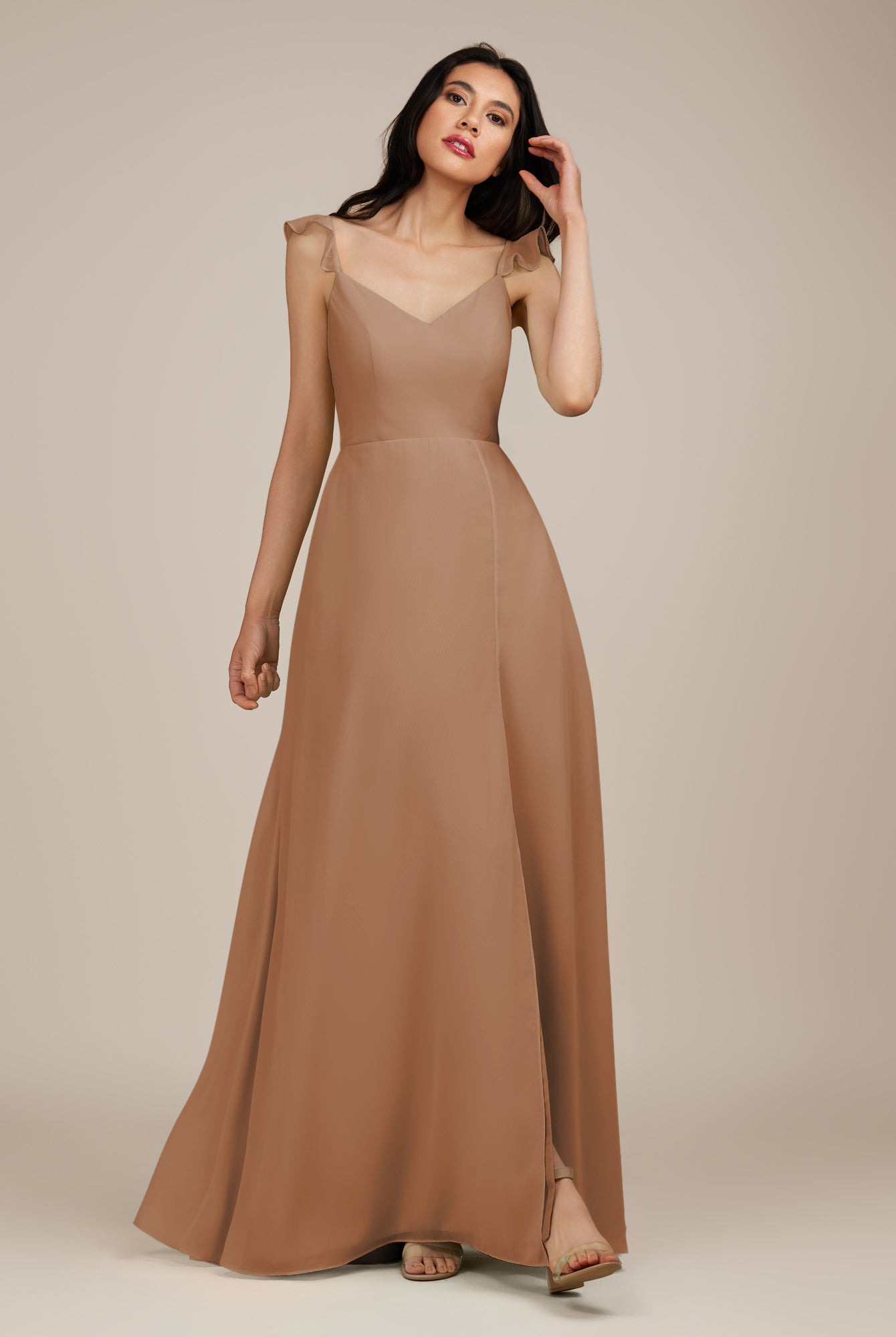 Citrine | Toffee - A Line V Neck Chiffon Ruffled Long Bridesmaid Dress with Slit
