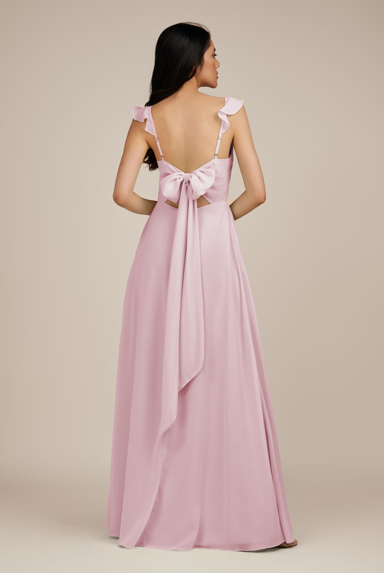 Citrine | Rose Petal - A Line V Neck Chiffon Ruffled Long Bridesmaid Dress with Slit