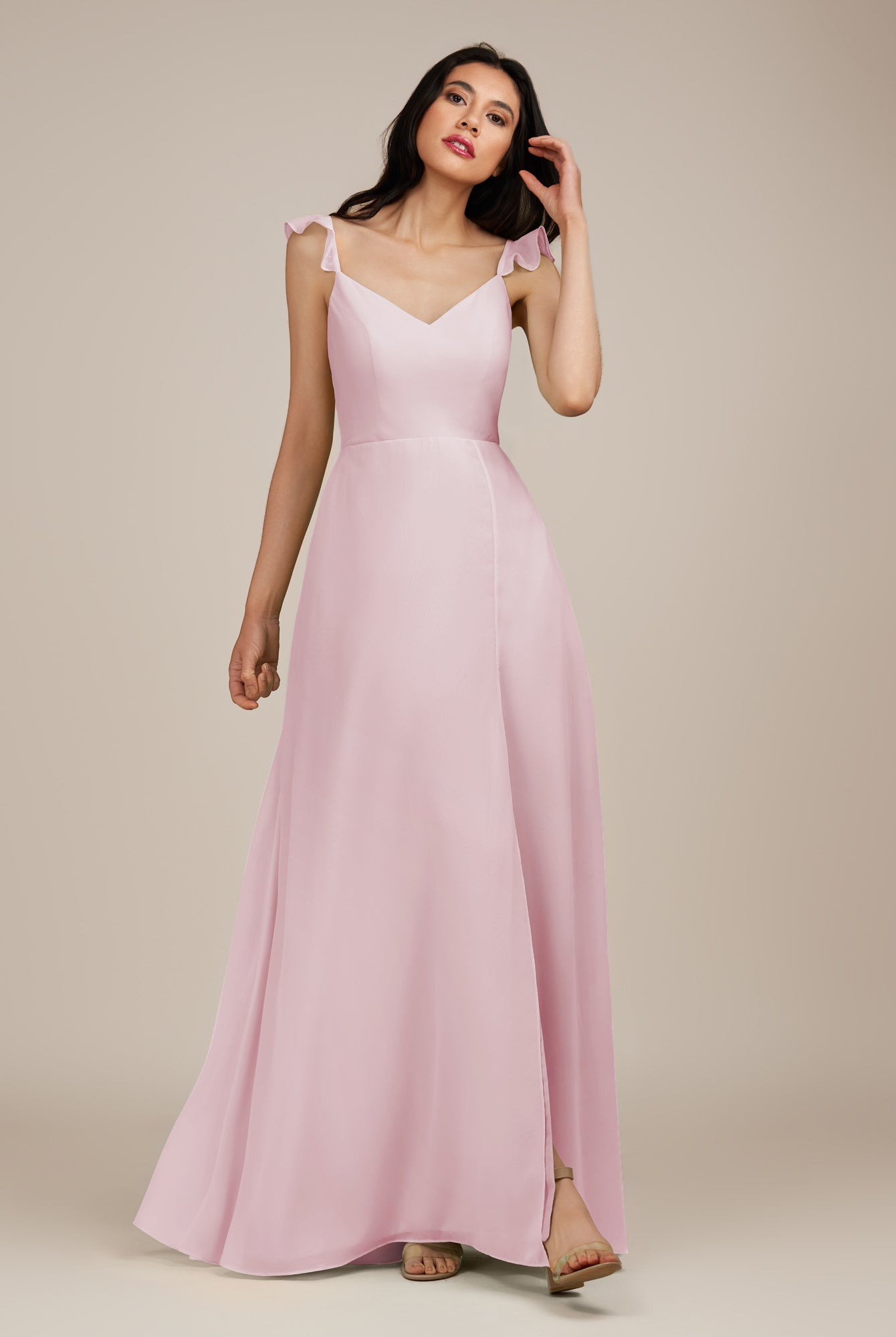 Citrine | Pale Blush - A Line V Neck Chiffon Ruffled Long Bridesmaid Dress with Slit