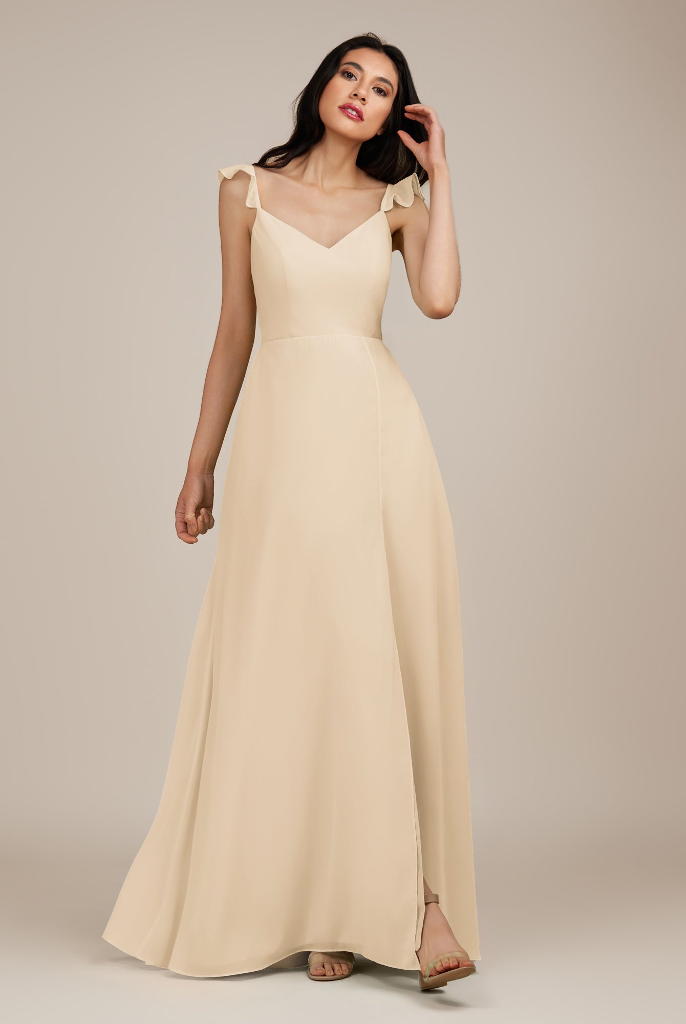Citrine | Champagne - A Line V Neck Chiffon Ruffled Long Bridesmaid Dress with Slit