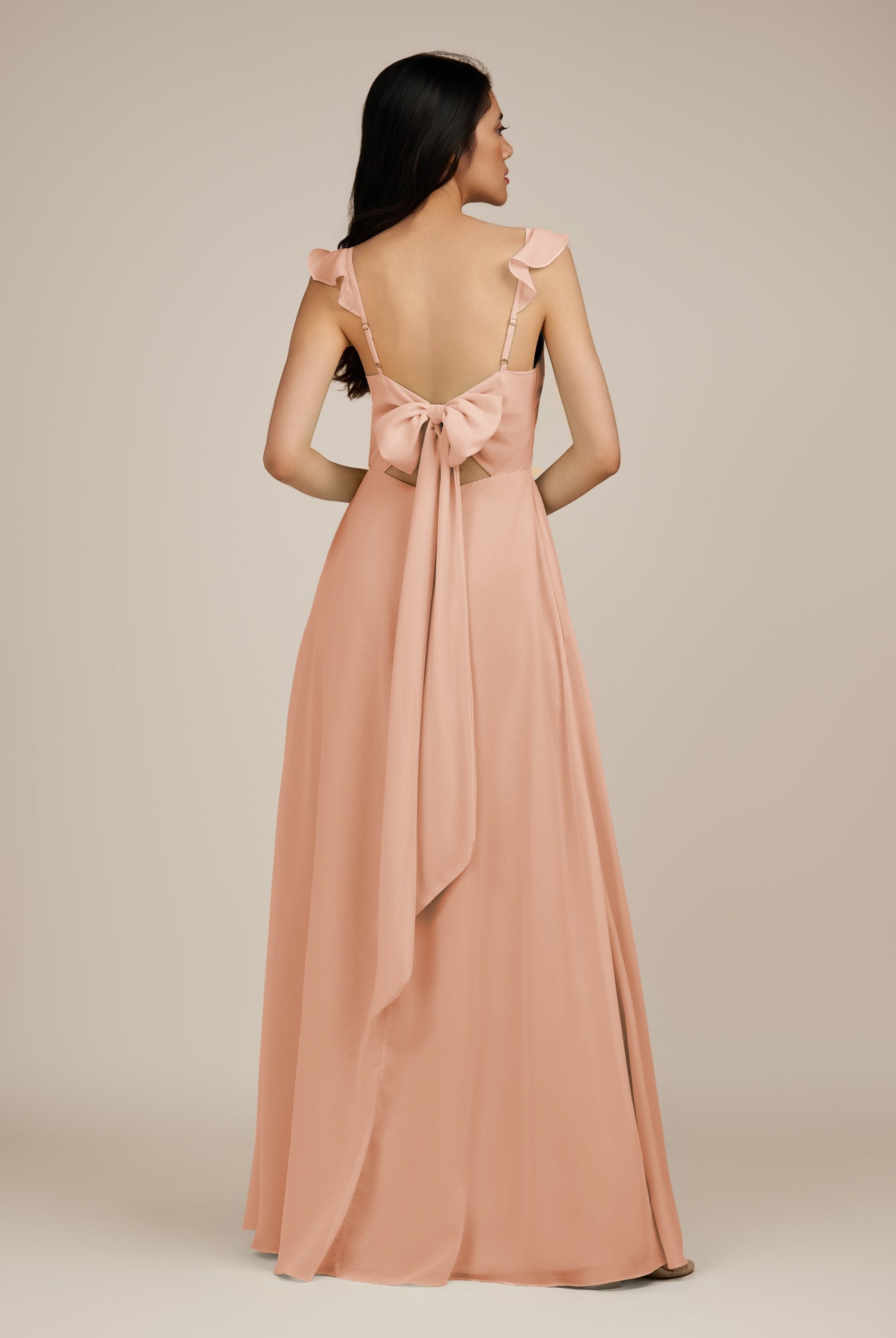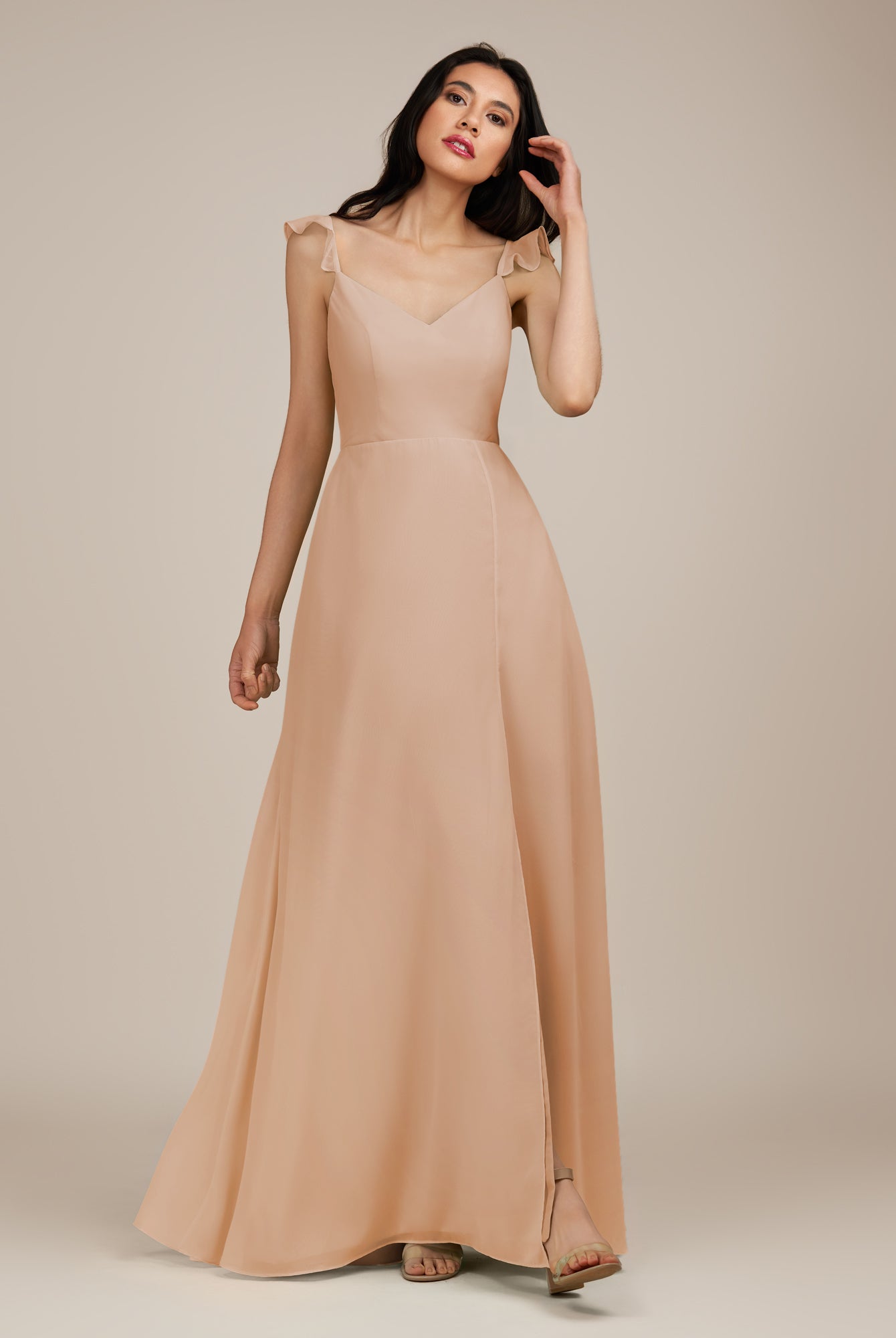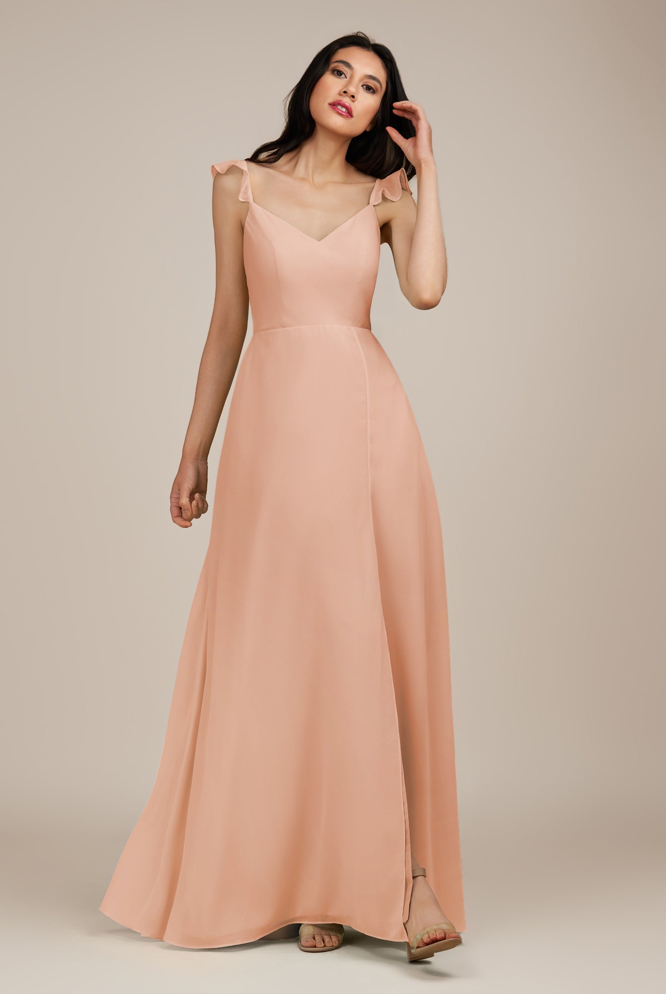 Citrine | Champagne Rose - A Line V Neck Chiffon Ruffled Long Bridesmaid Dress with Slit