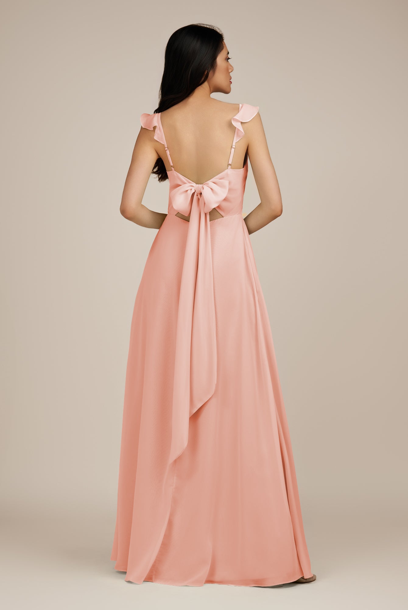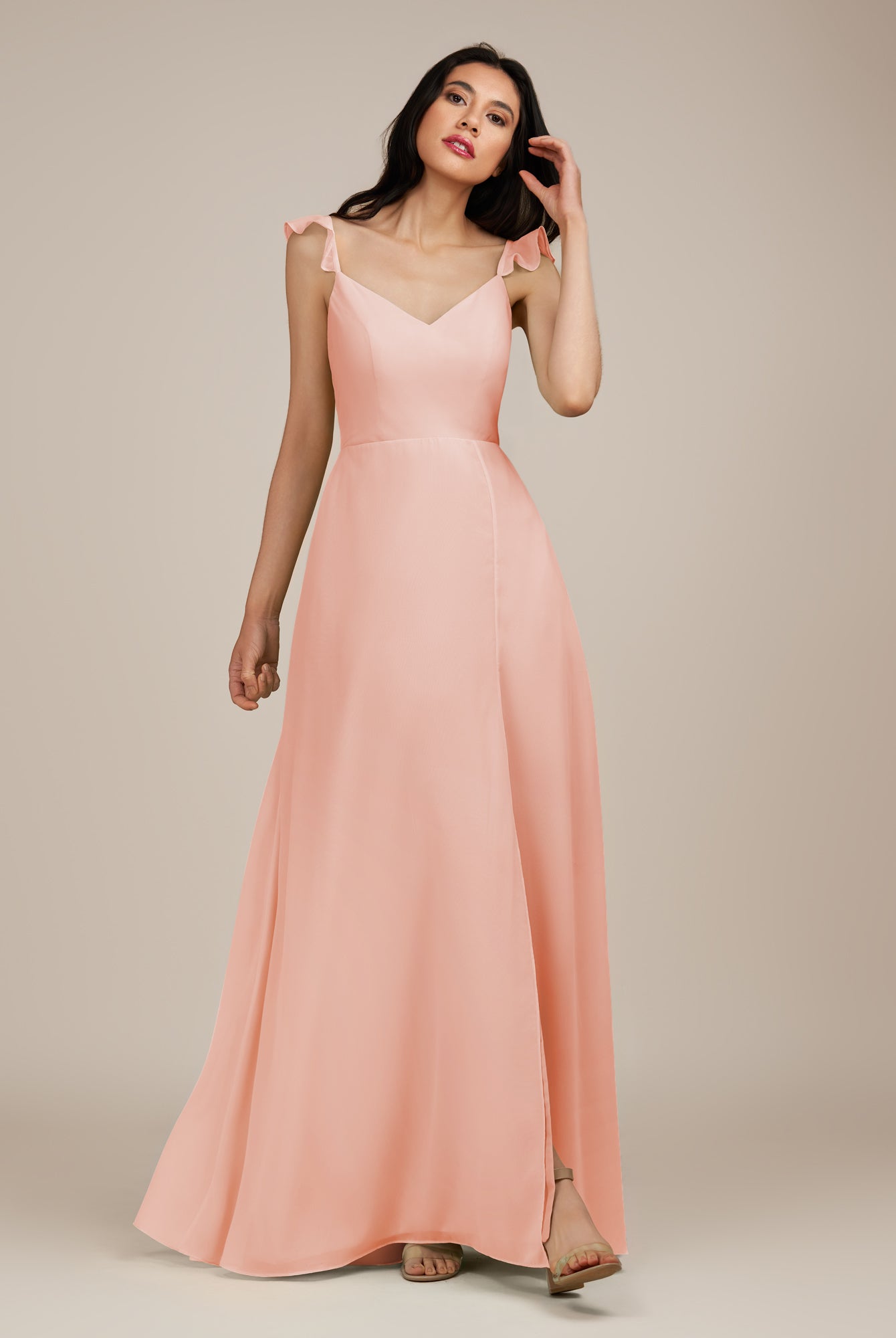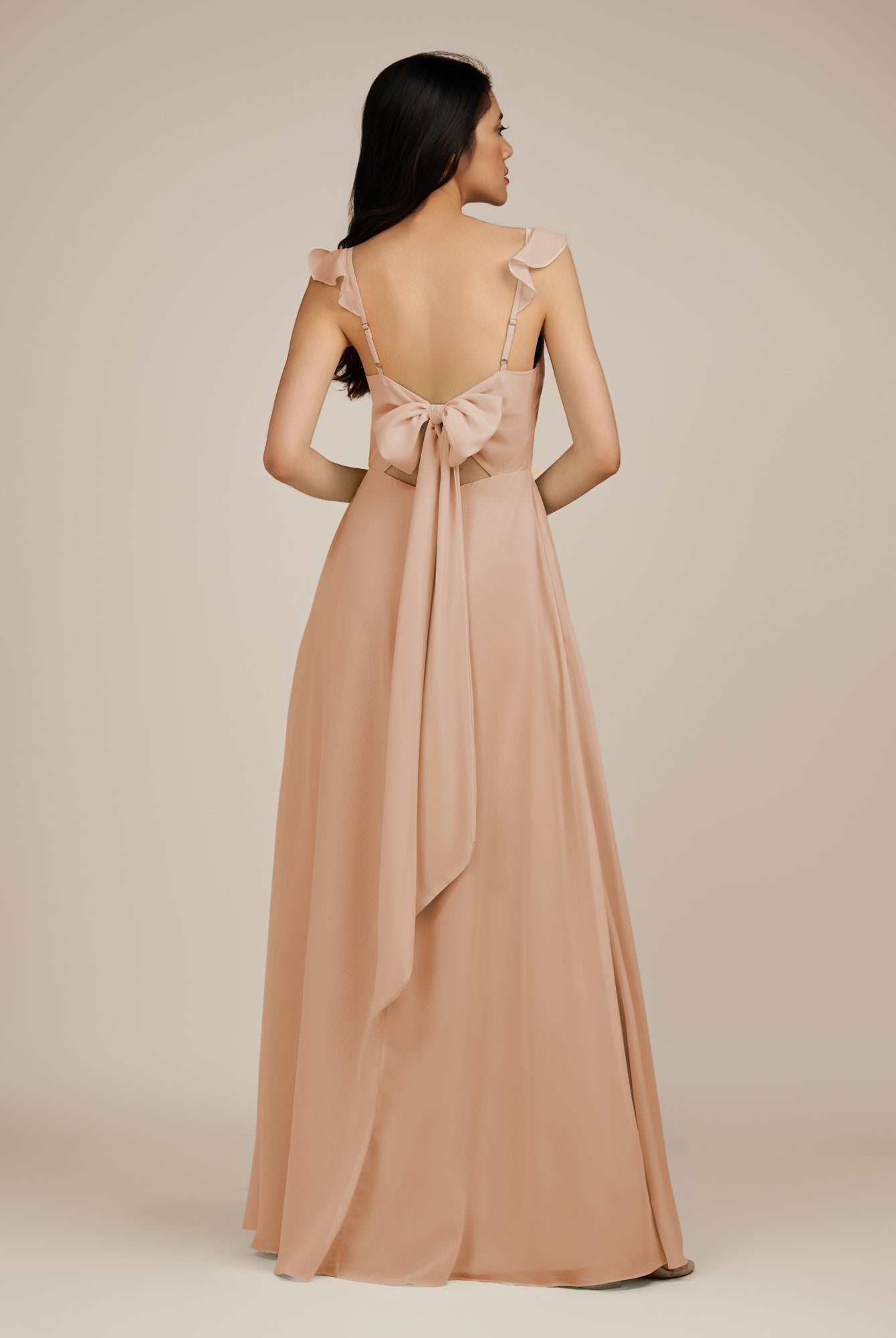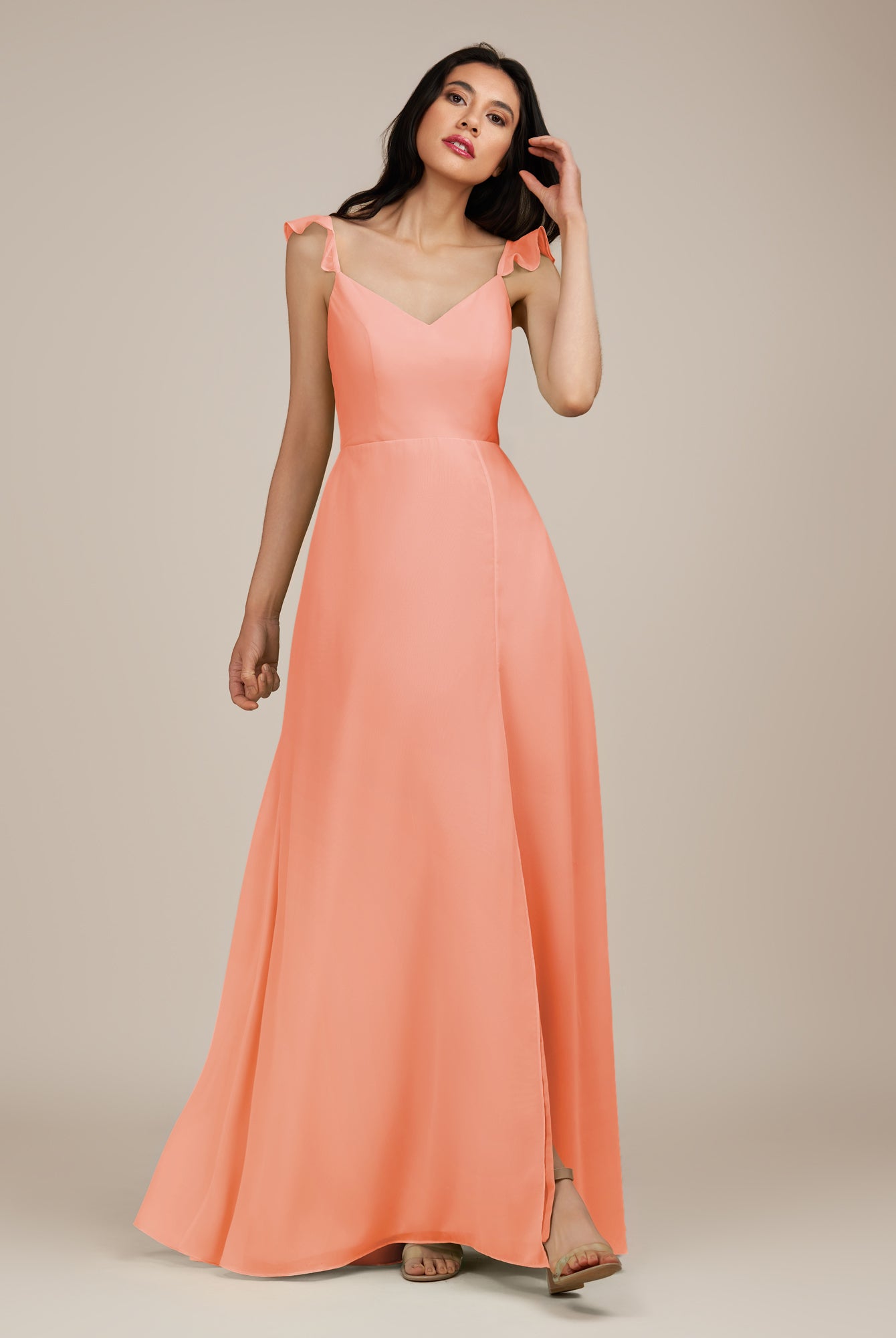 Citrine | Champagne Rose - A Line V Neck Chiffon Ruffled Long Bridesmaid Dress with Slit
