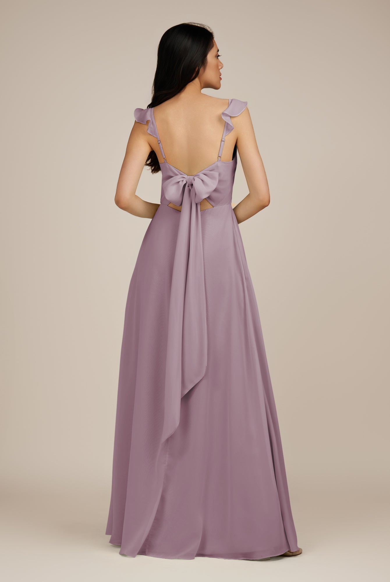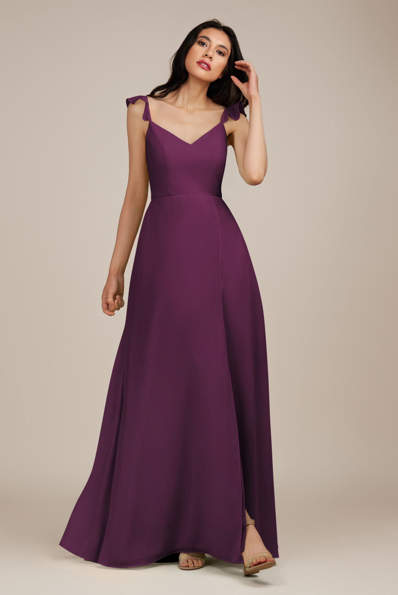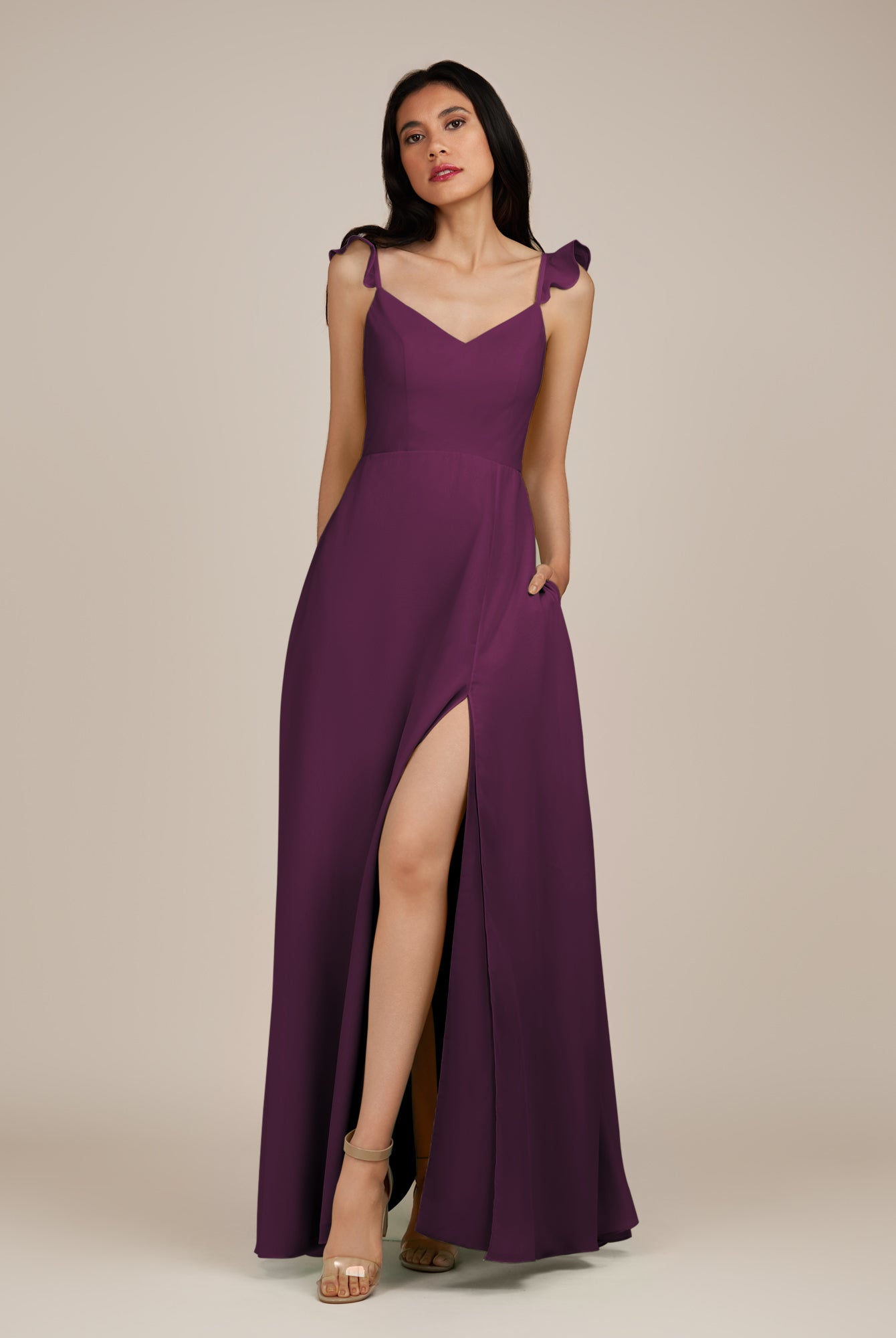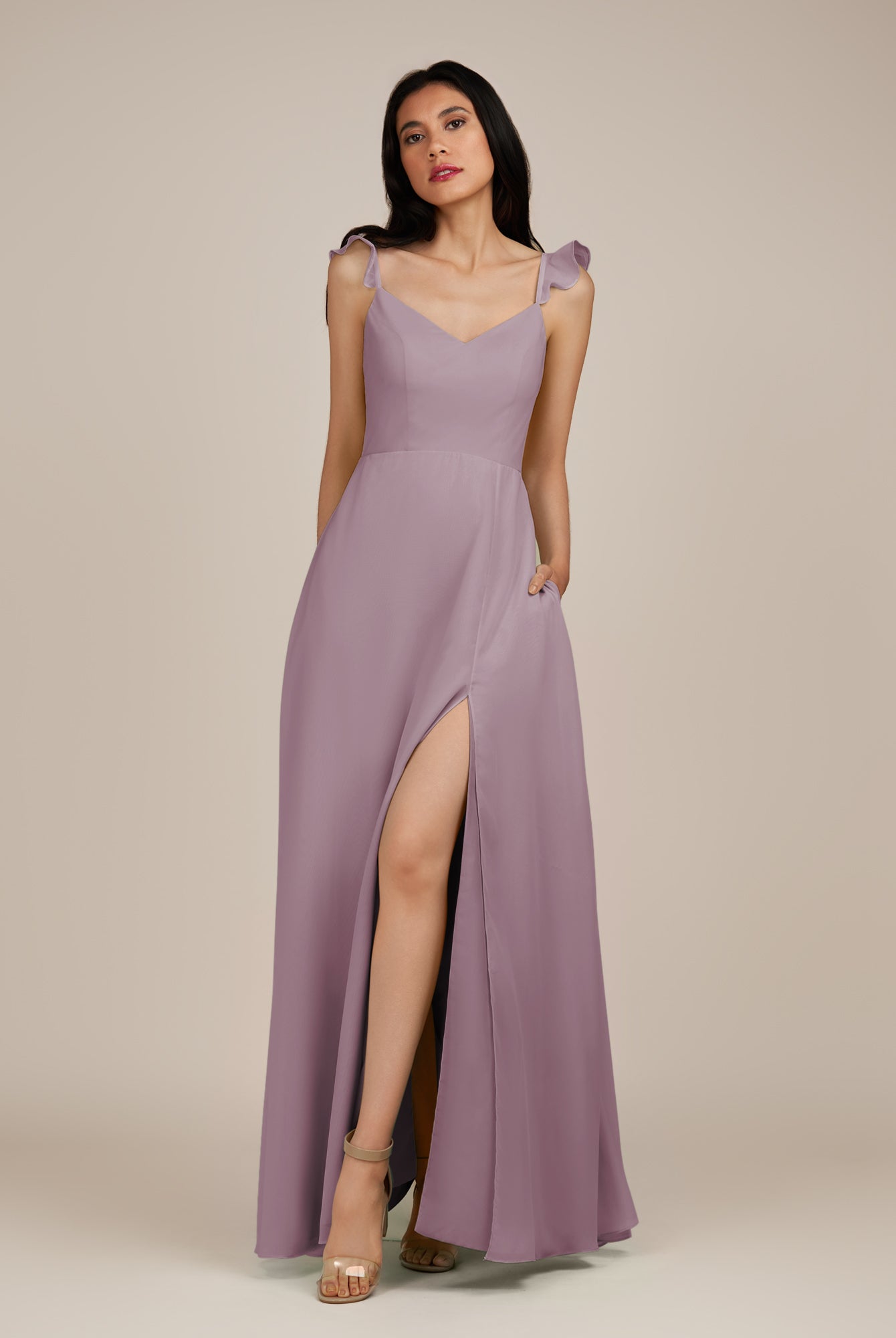 Citrine | Fig - A Line V Neck Chiffon Ruffled Long Bridesmaid Dress with Slit