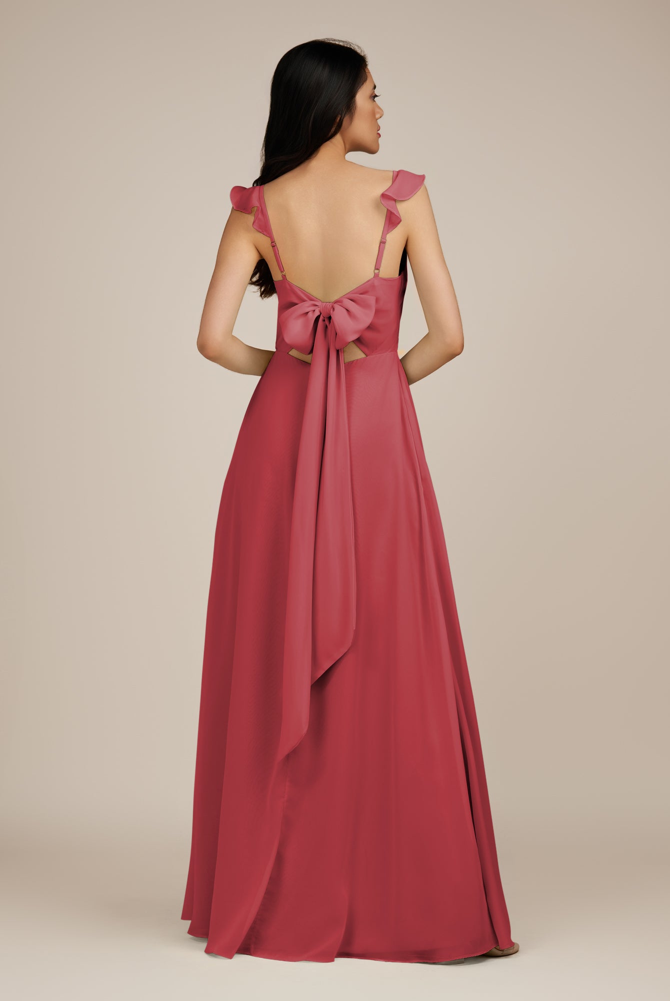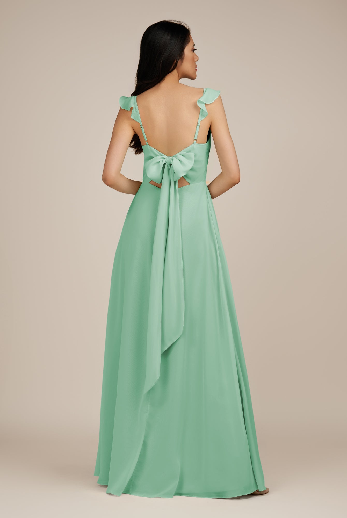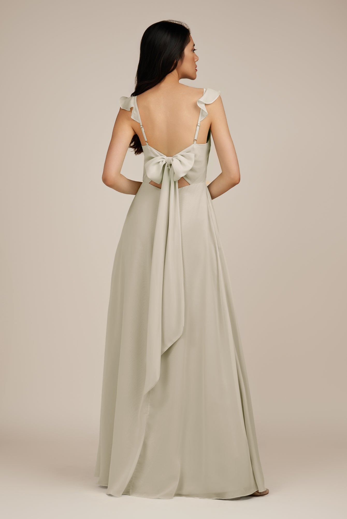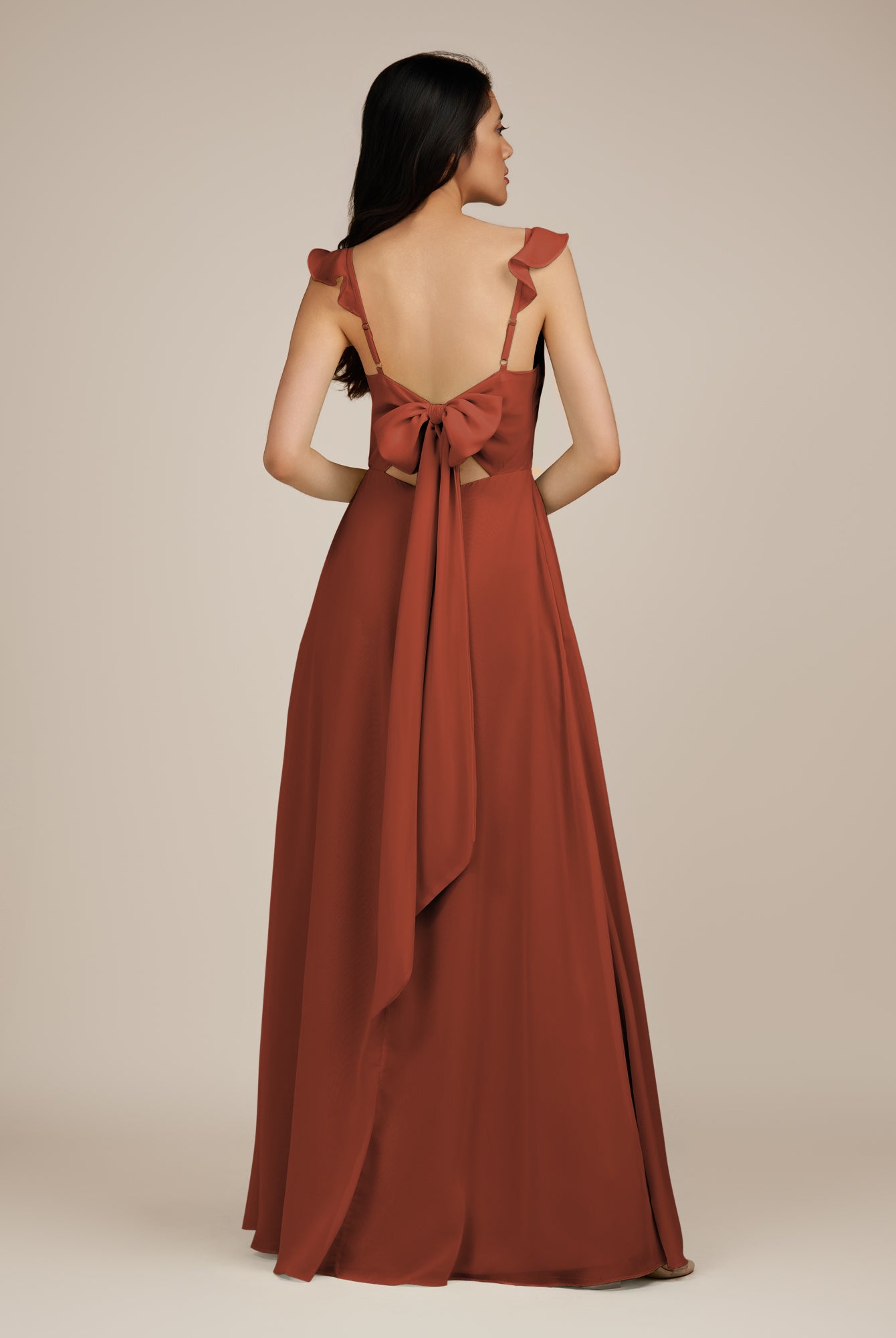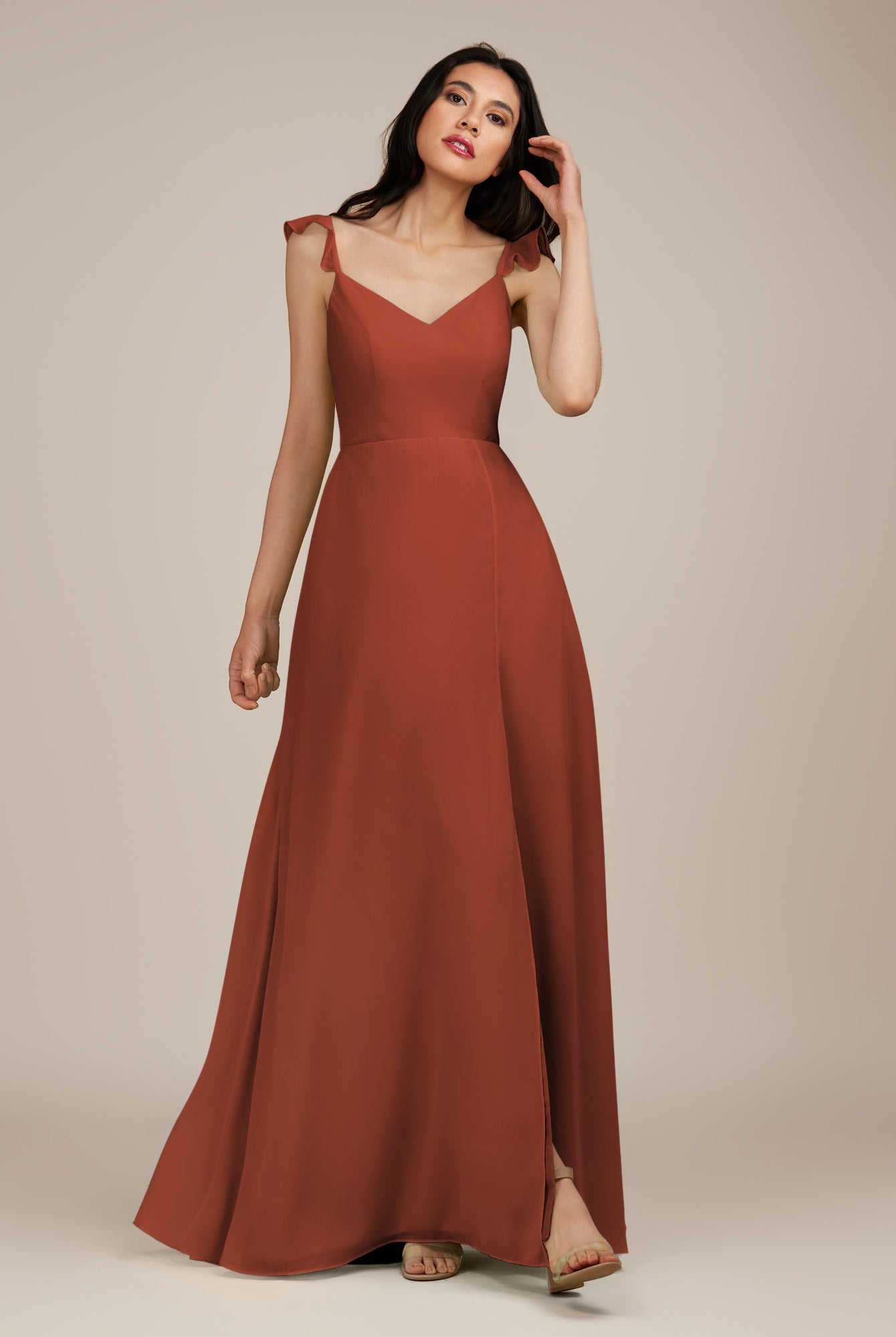 Citrine | Fig - A Line V Neck Chiffon Ruffled Long Bridesmaid Dress with Slit