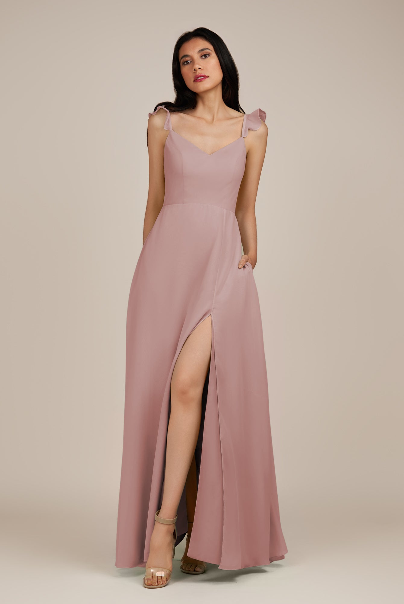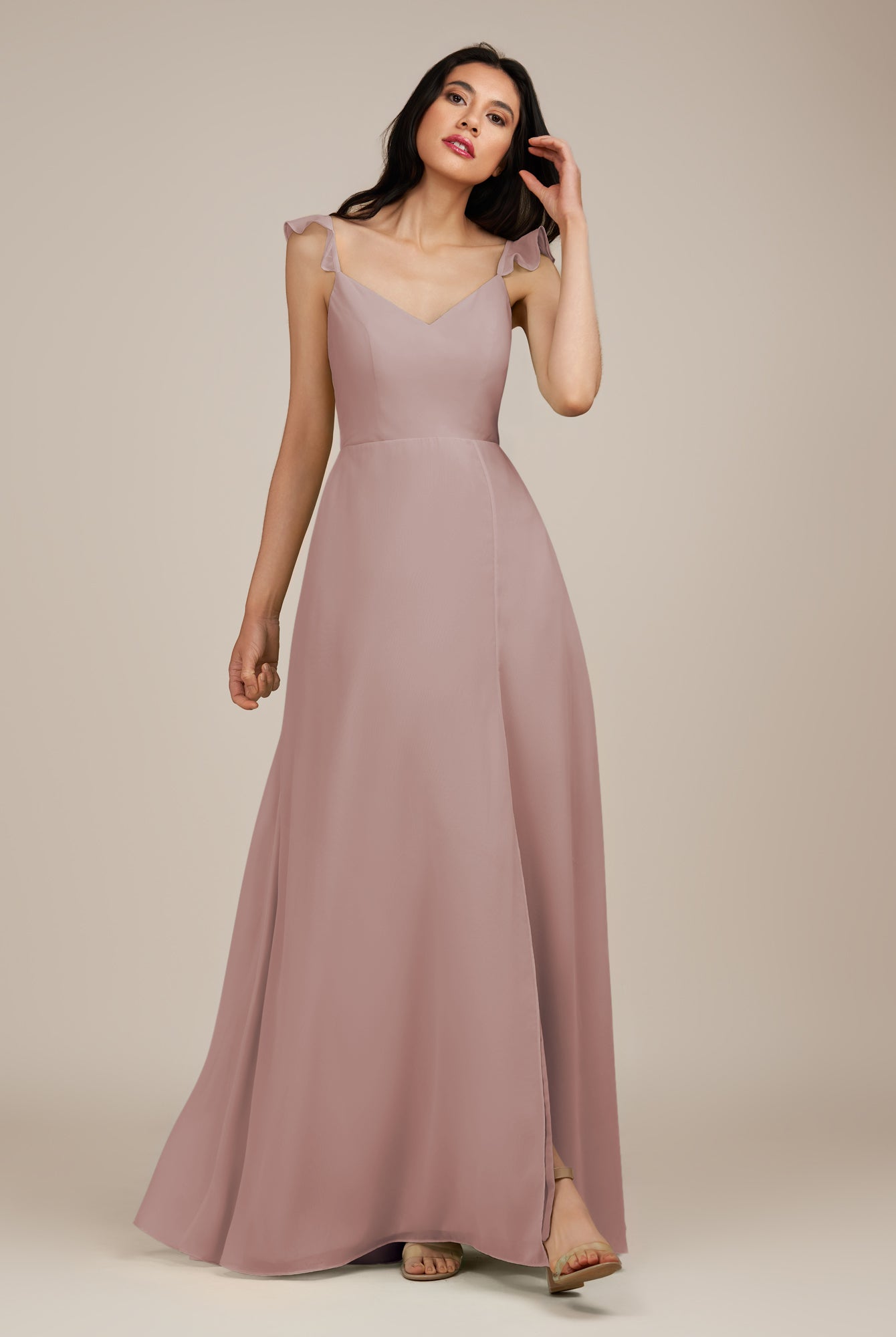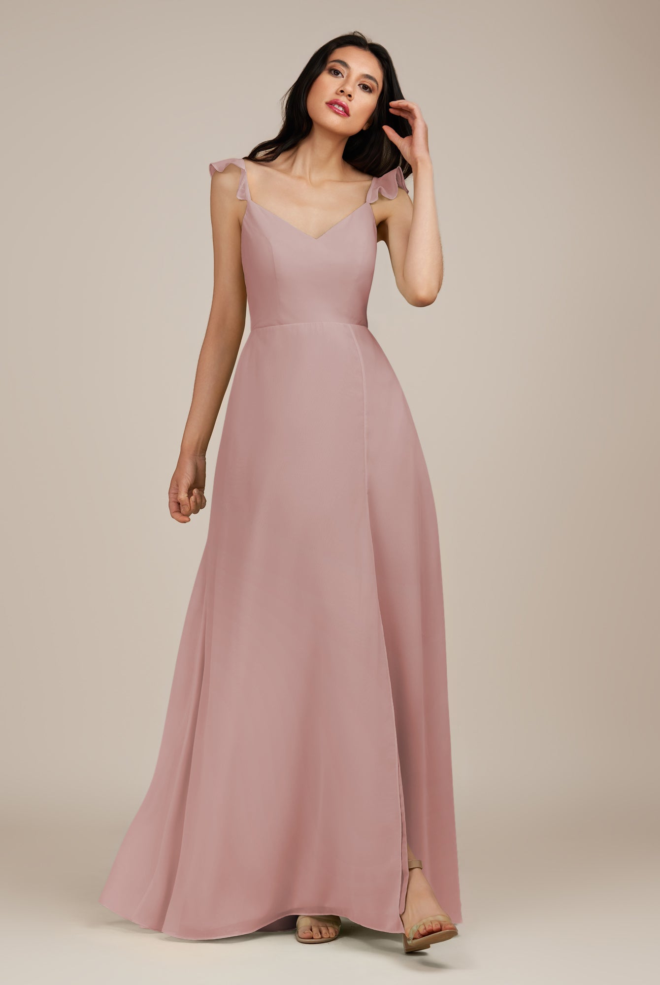 Citrine | Dusty Rose - A Line V Neck Chiffon Ruffled Long Bridesmaid Dress with Slit