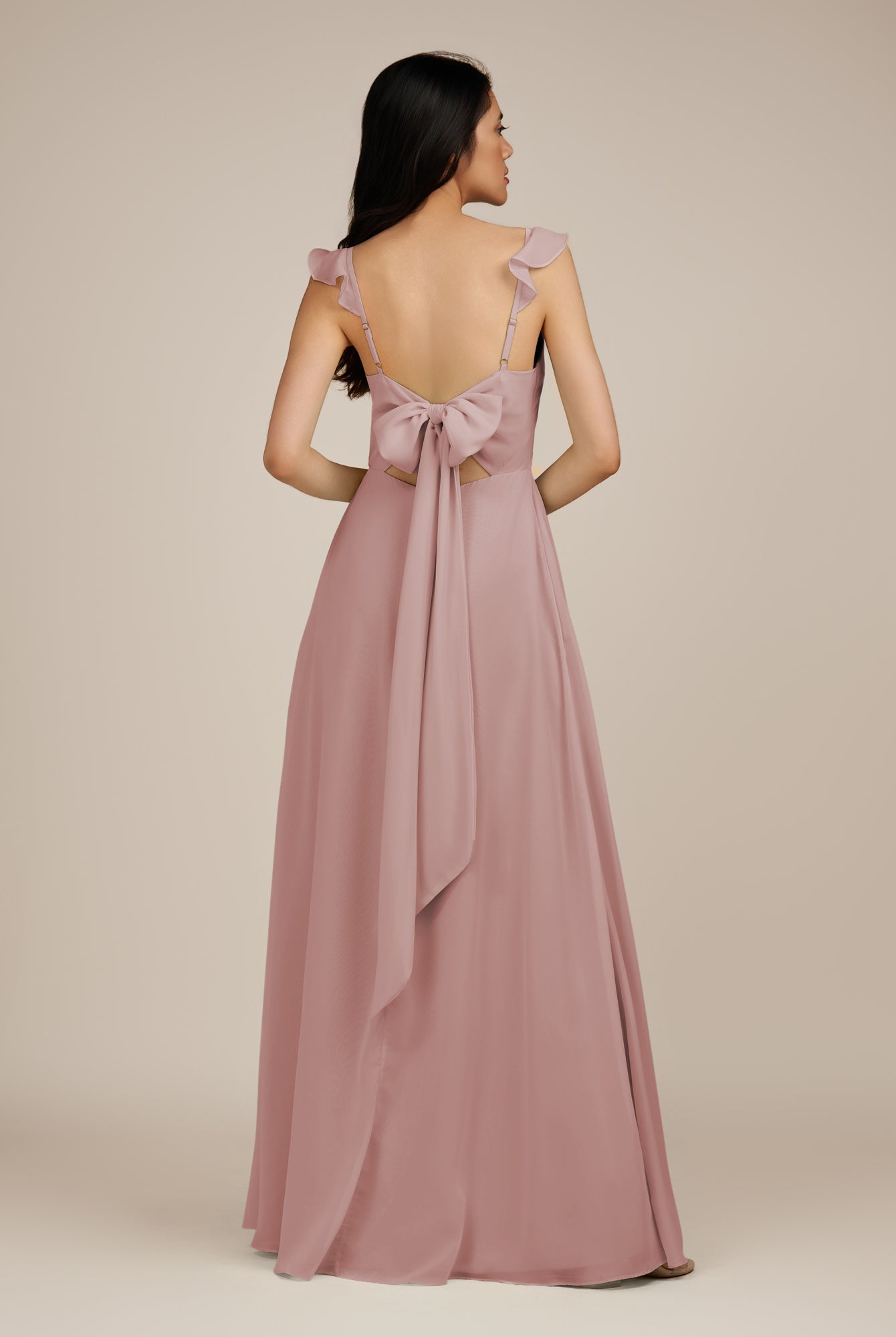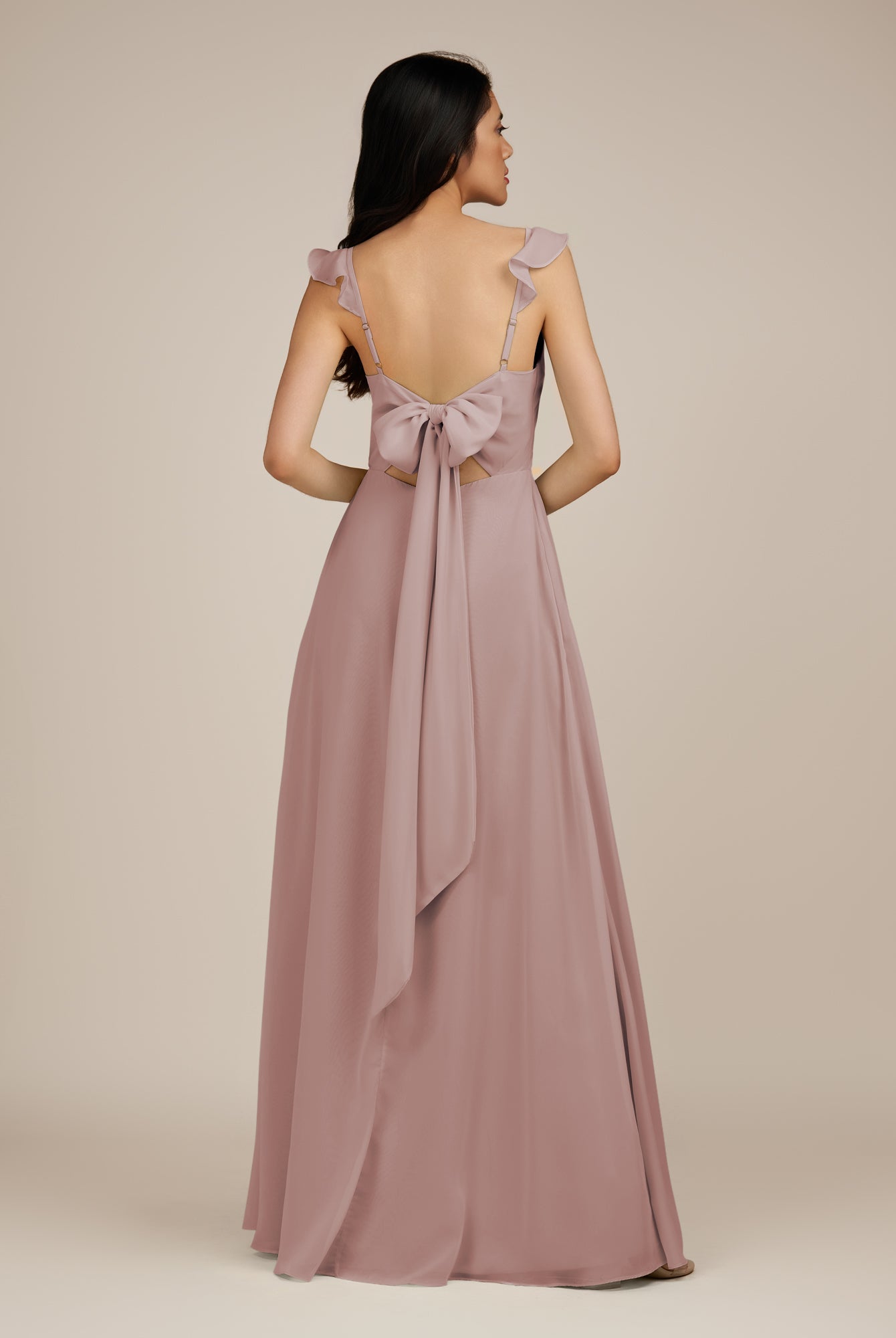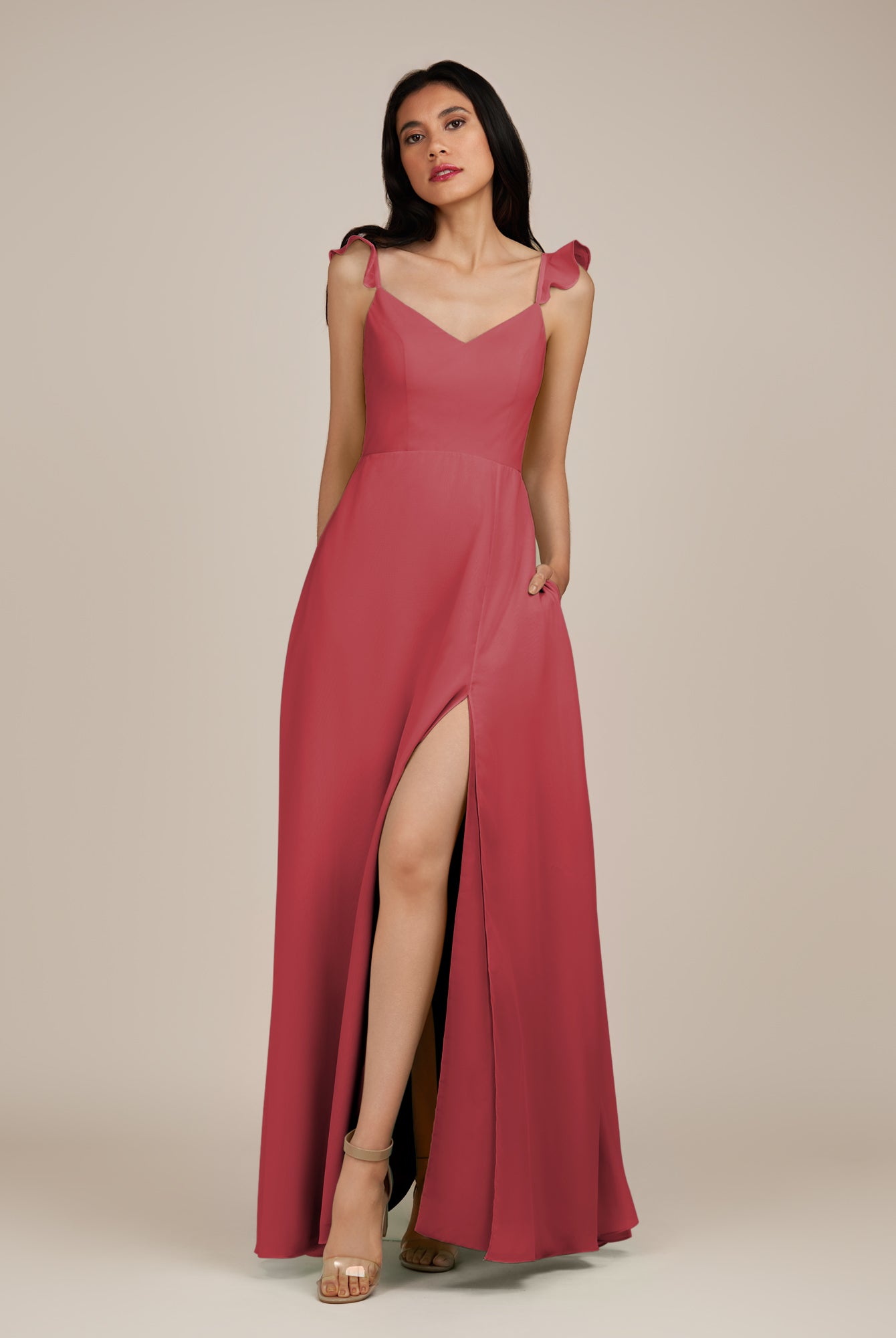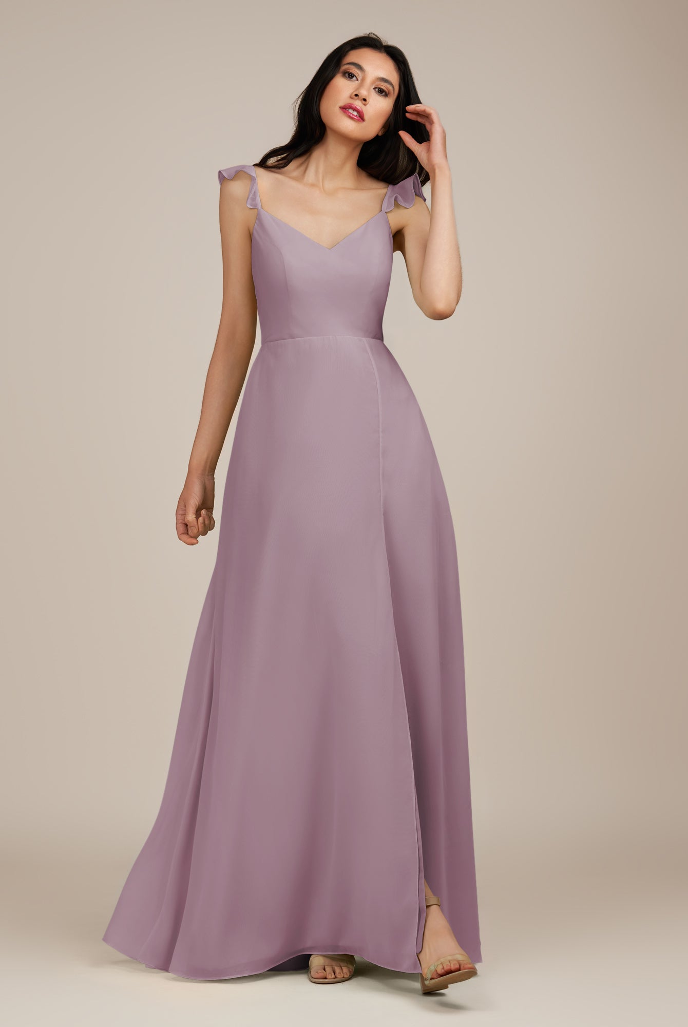 Citrine | Dusty Rose - A Line V Neck Chiffon Ruffled Long Bridesmaid Dress with Slit