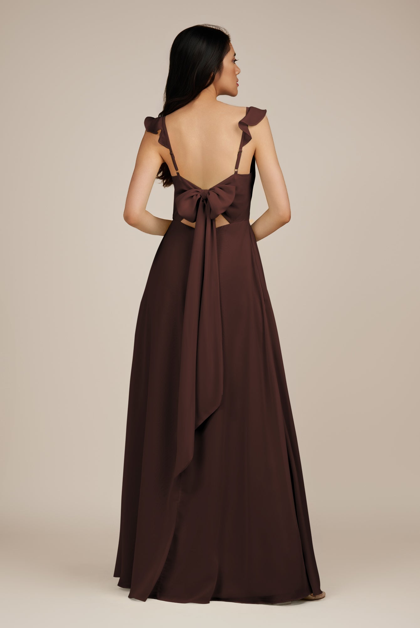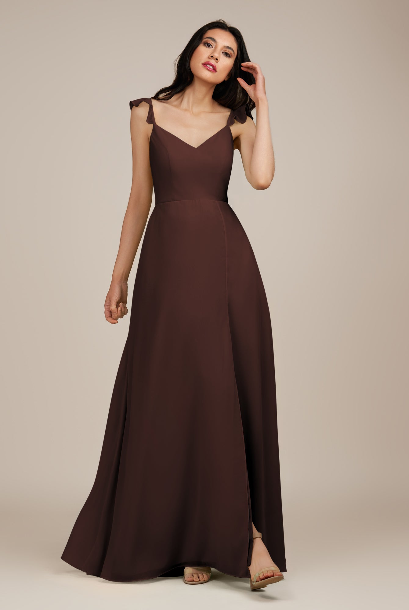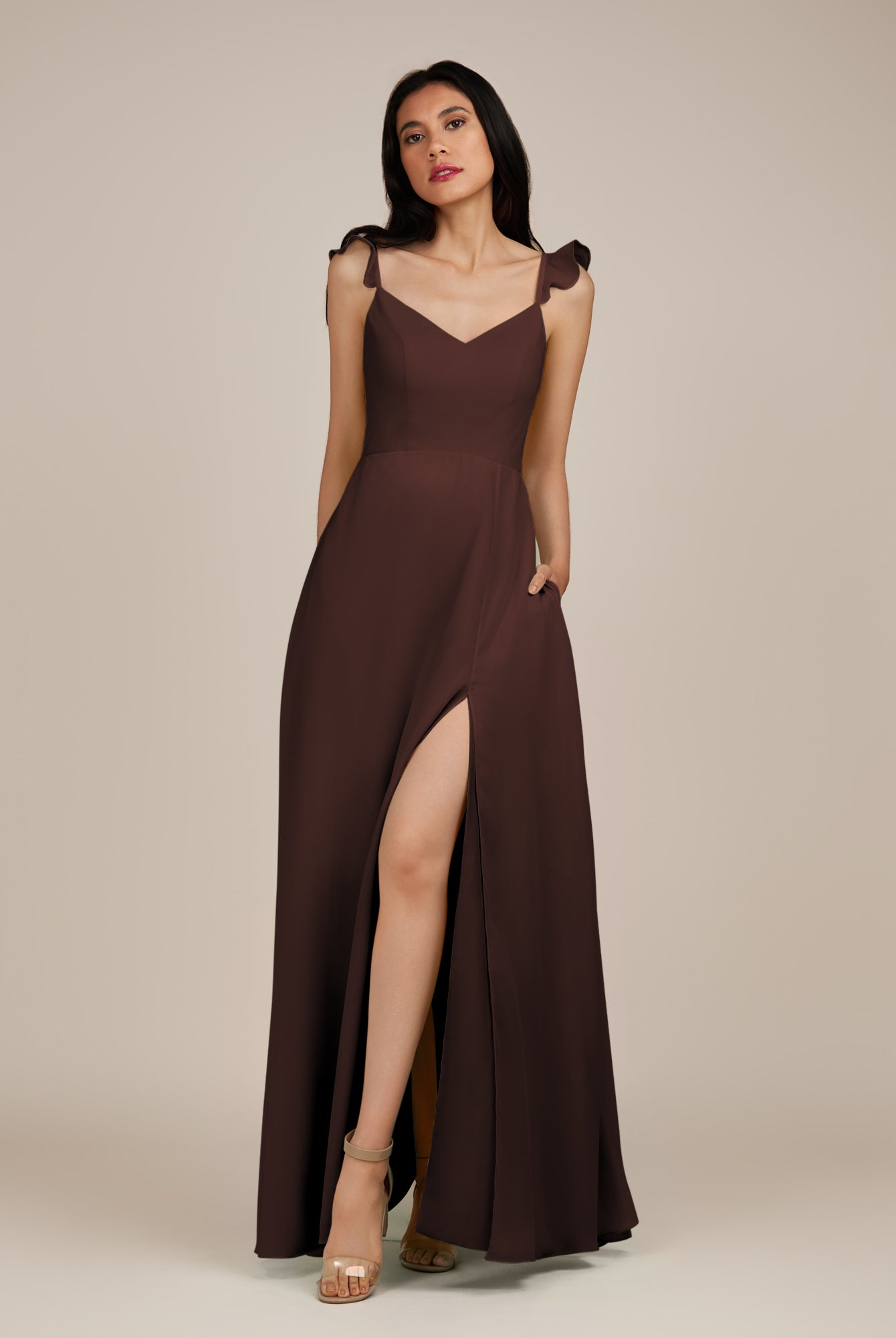 Citrine | Espresso - A Line V Neck Chiffon Ruffled Long Bridesmaid Dress with Slit
