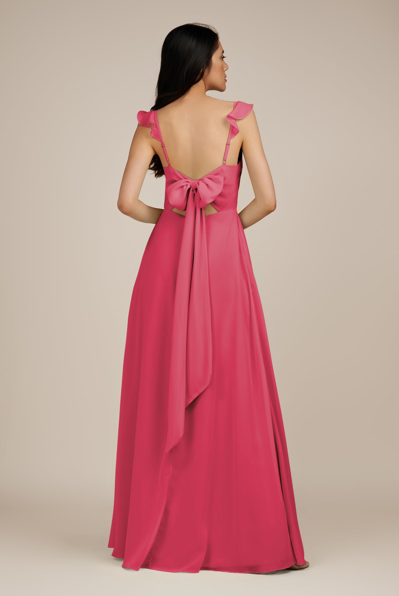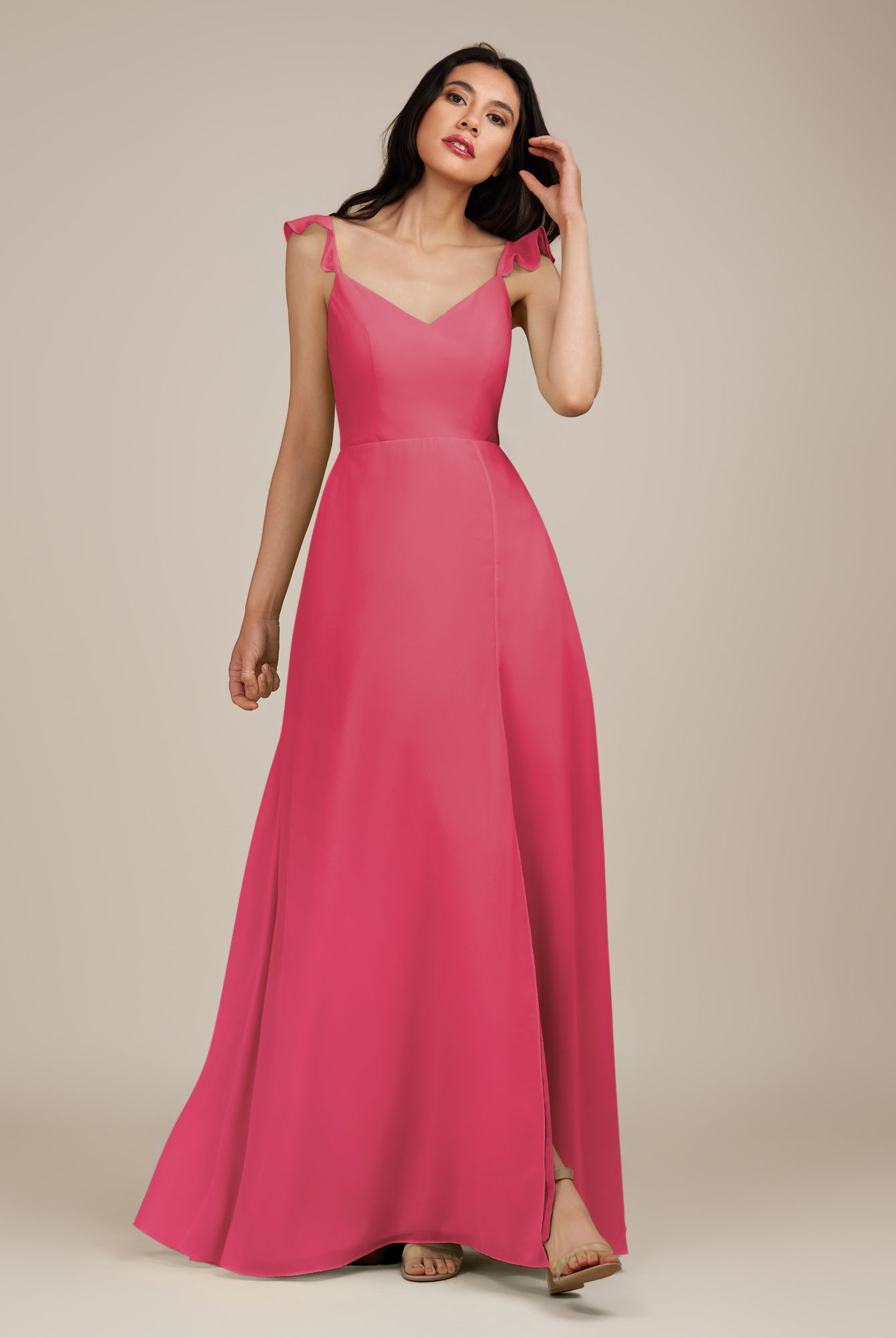Citrine | Candy Pink - A Line V Neck Chiffon Ruffled Long Bridesmaid Dress with Slit