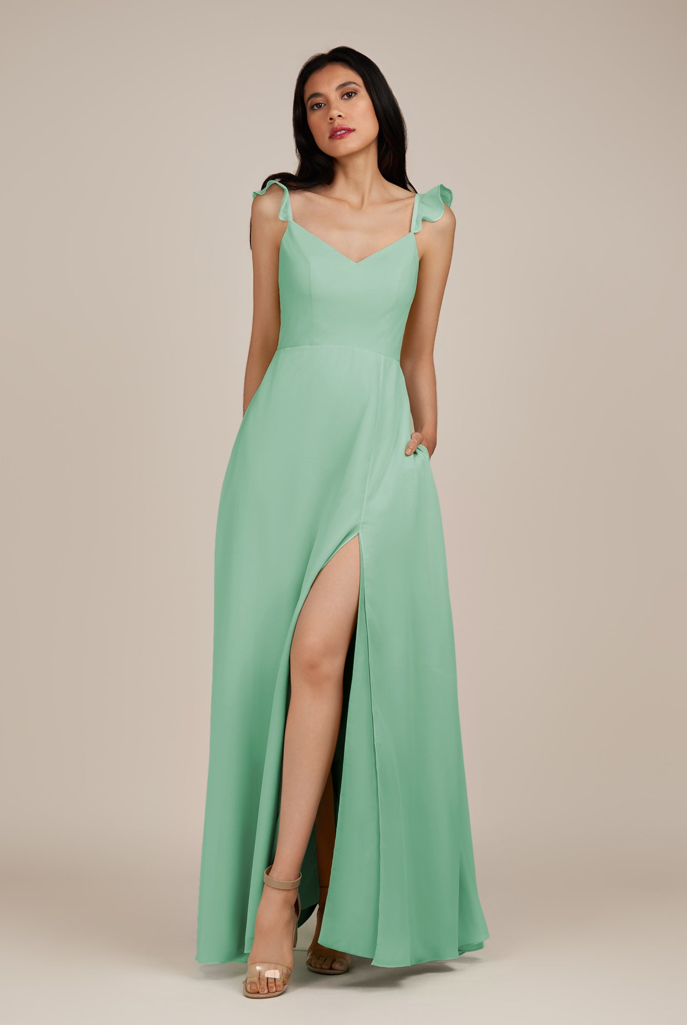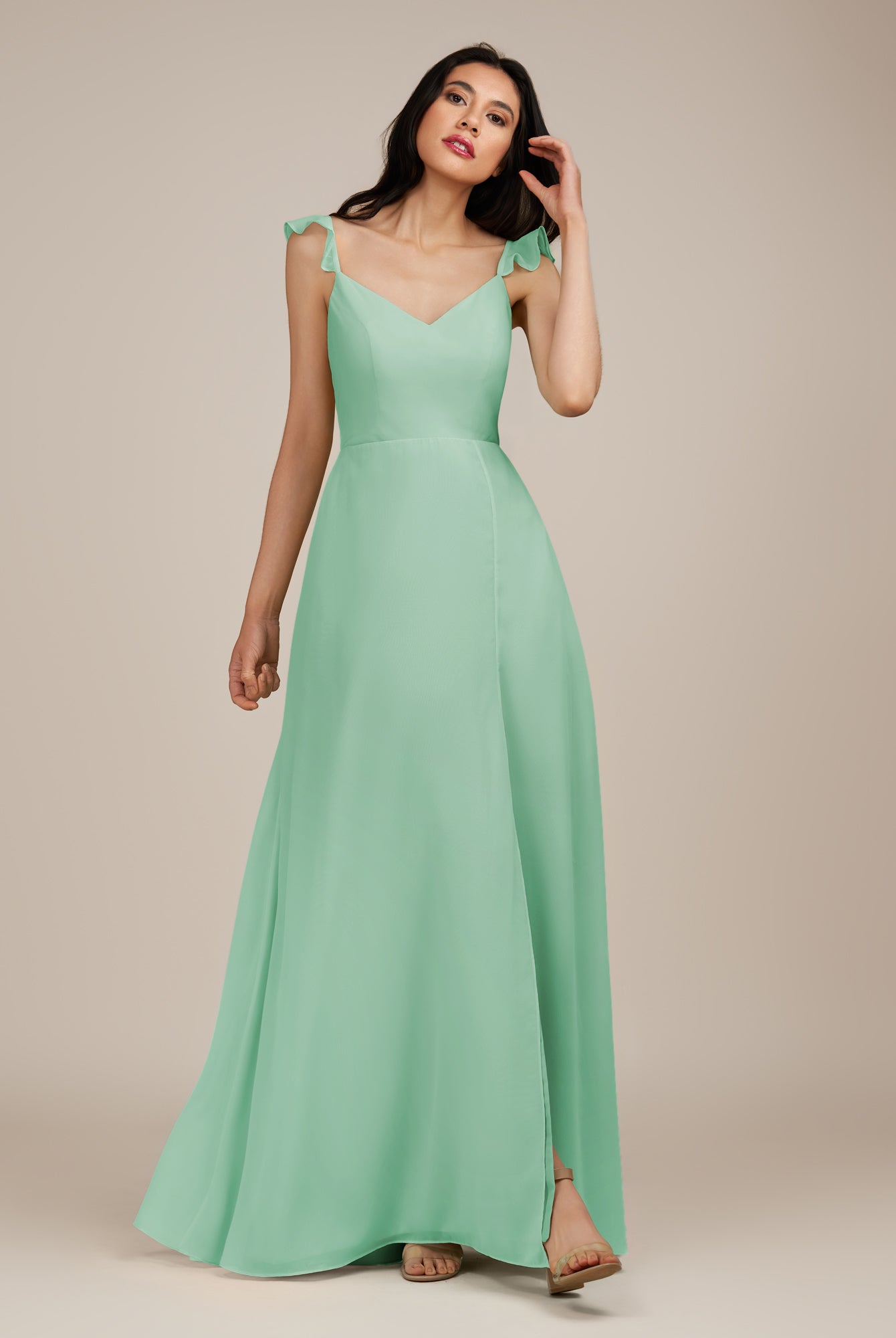 Citrine | Pale Pistachio - A Line V Neck Chiffon Ruffled Long Bridesmaid Dress with Slit