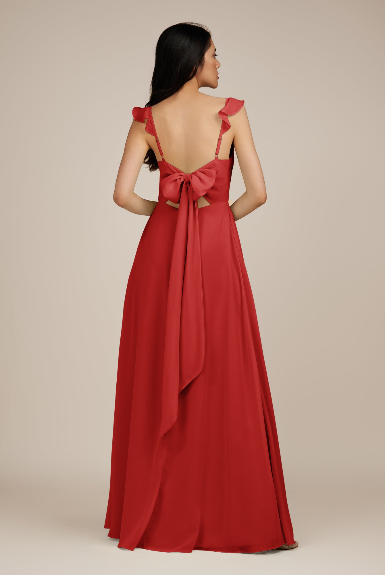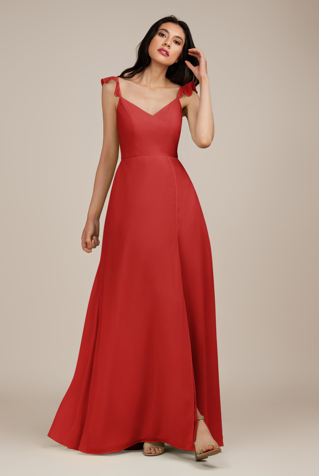 Citrine | Ruby Red - A Line V Neck Chiffon Ruffled Long Bridesmaid Dress with Slit