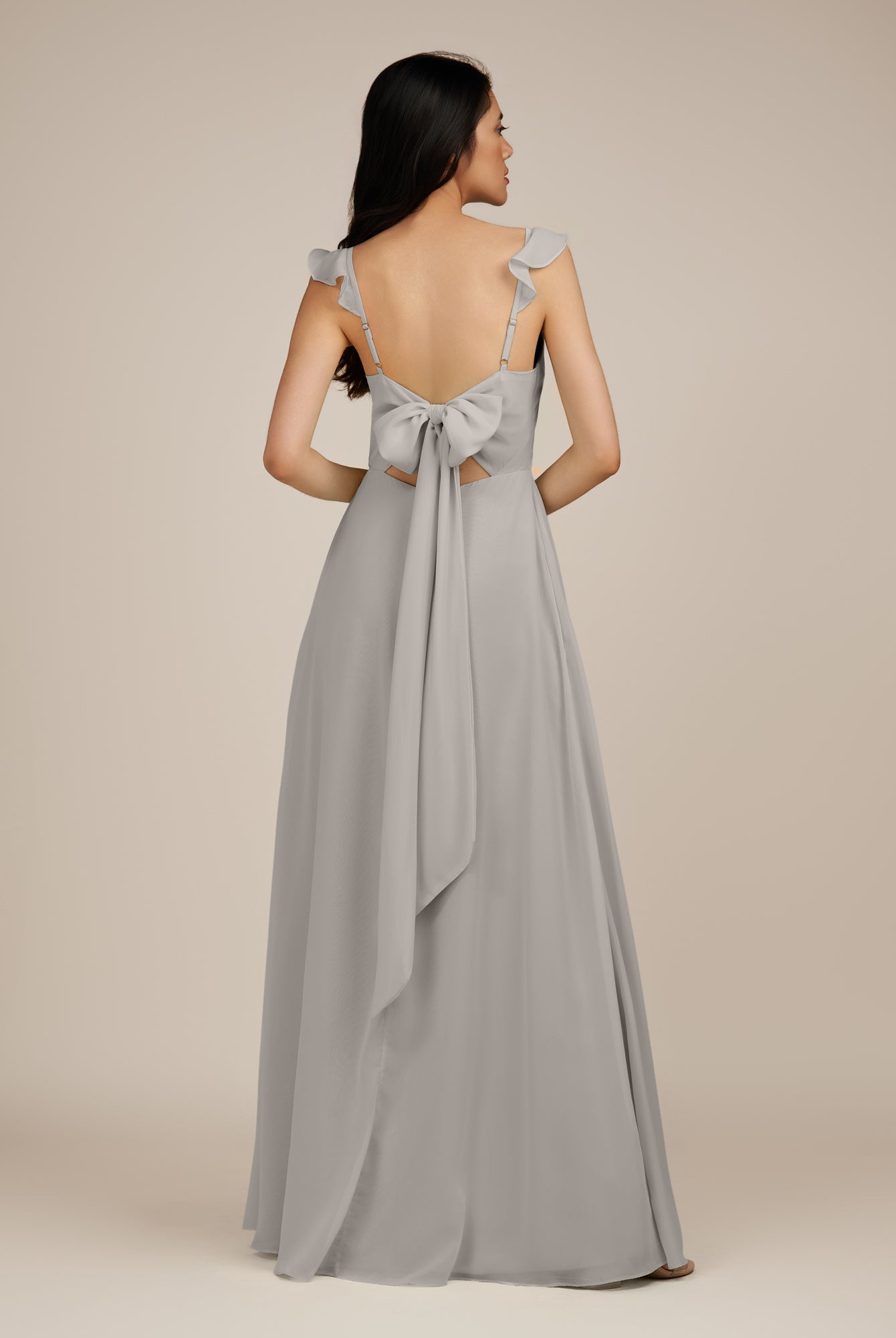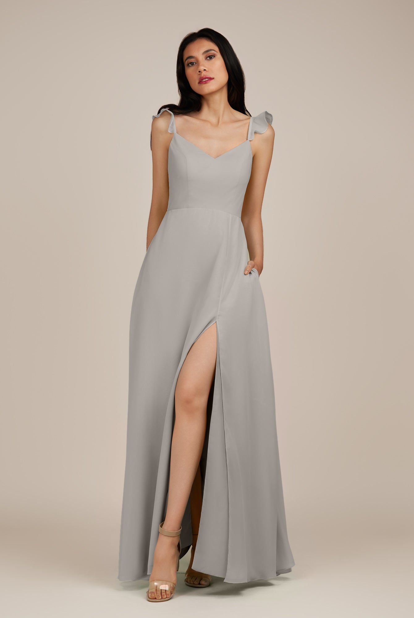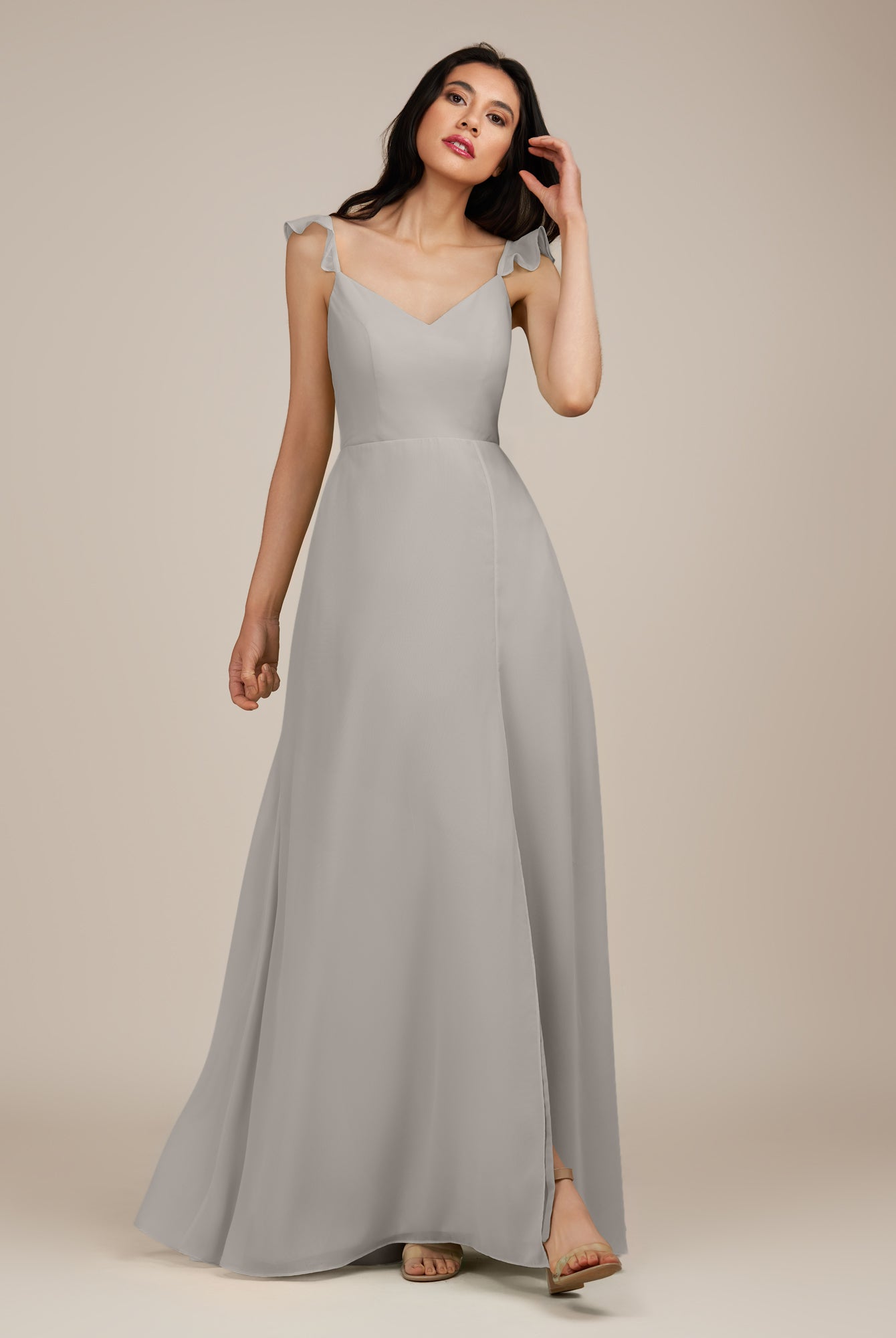 Citrine | Dove Gray - A Line V Neck Chiffon Ruffled Long Bridesmaid Dress with Slit