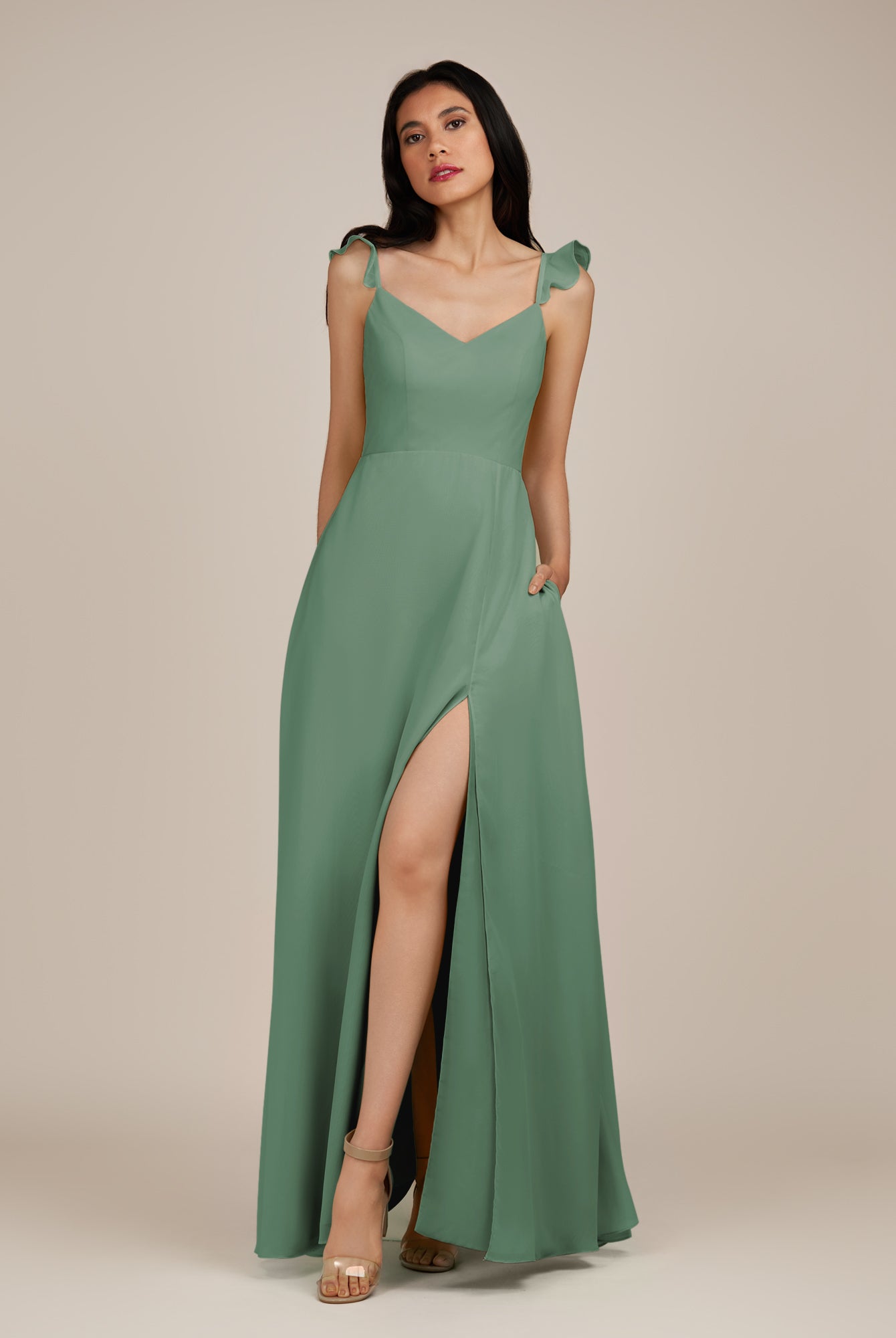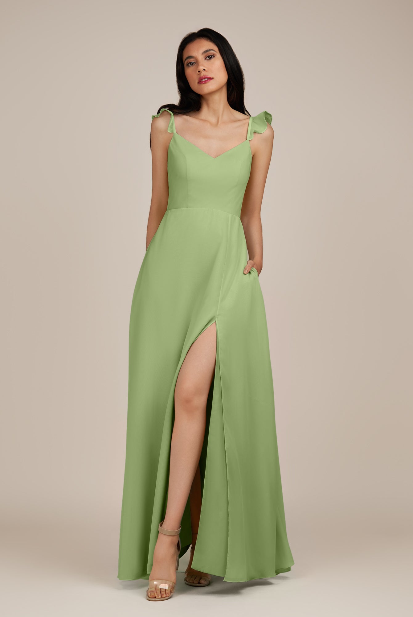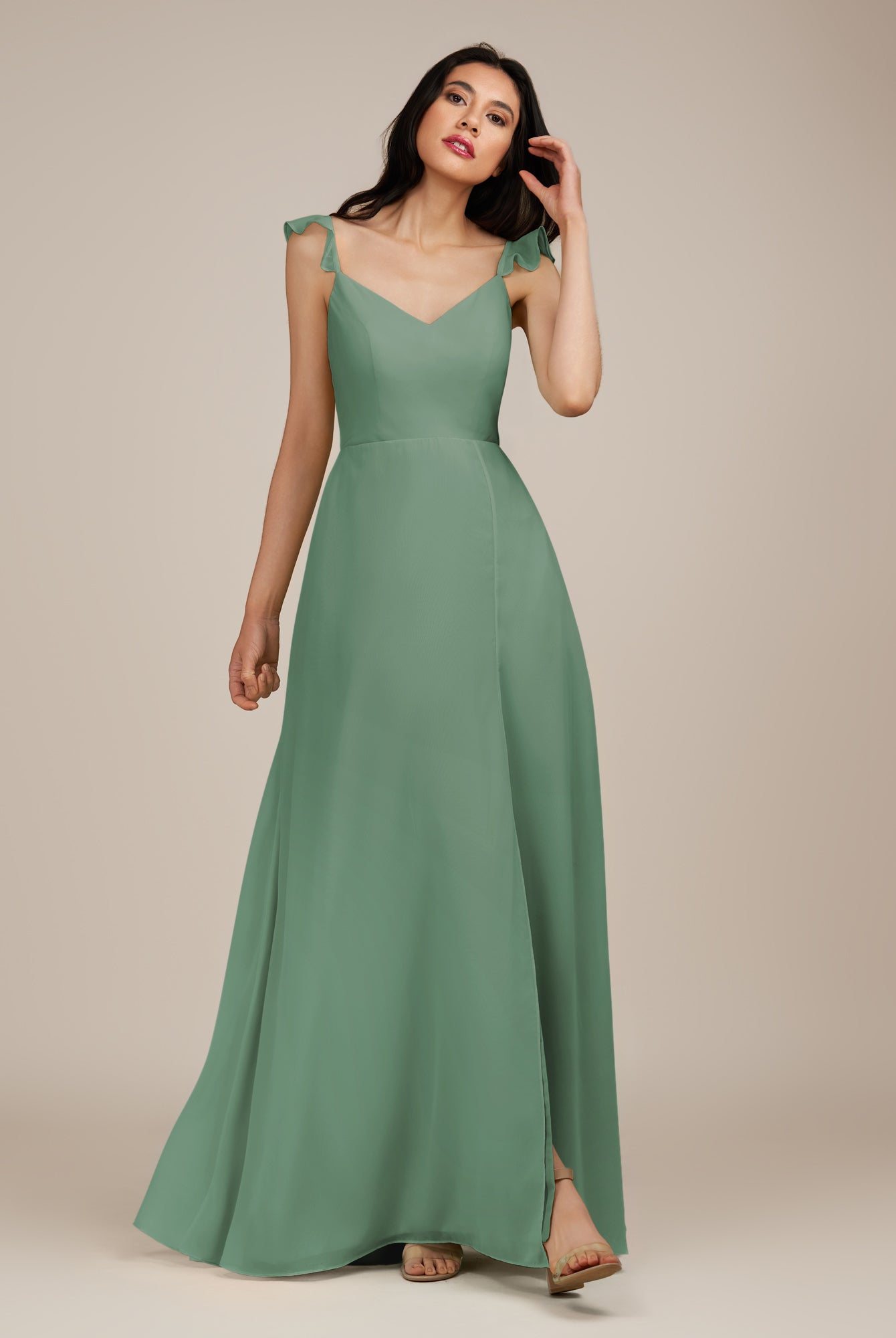 Citrine | Sage - A Line V Neck Chiffon Ruffled Long Bridesmaid Dress with Slit