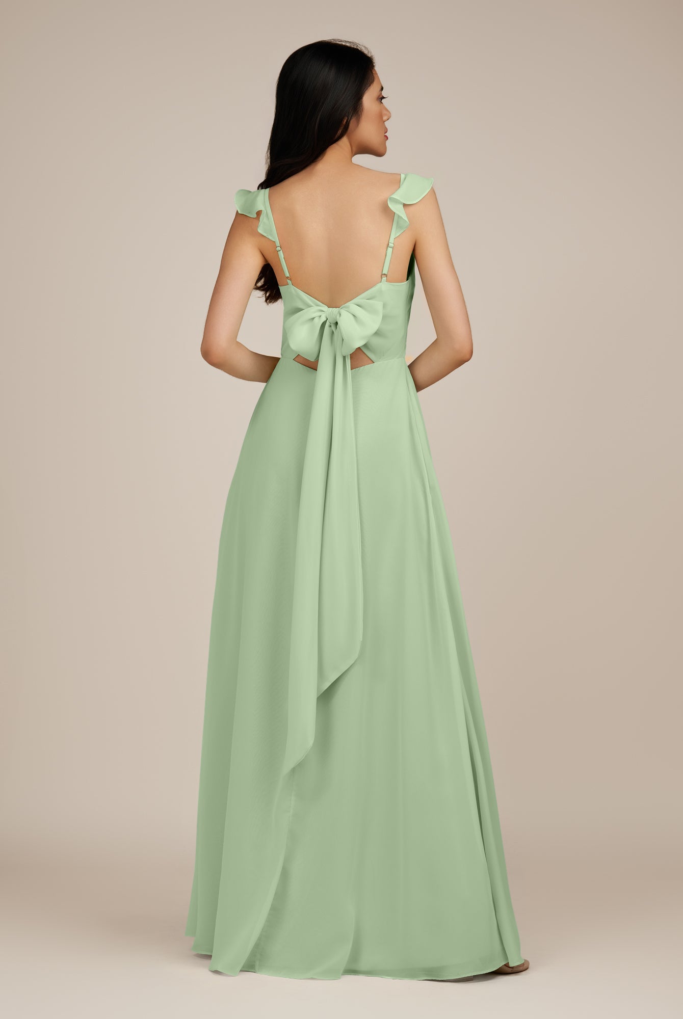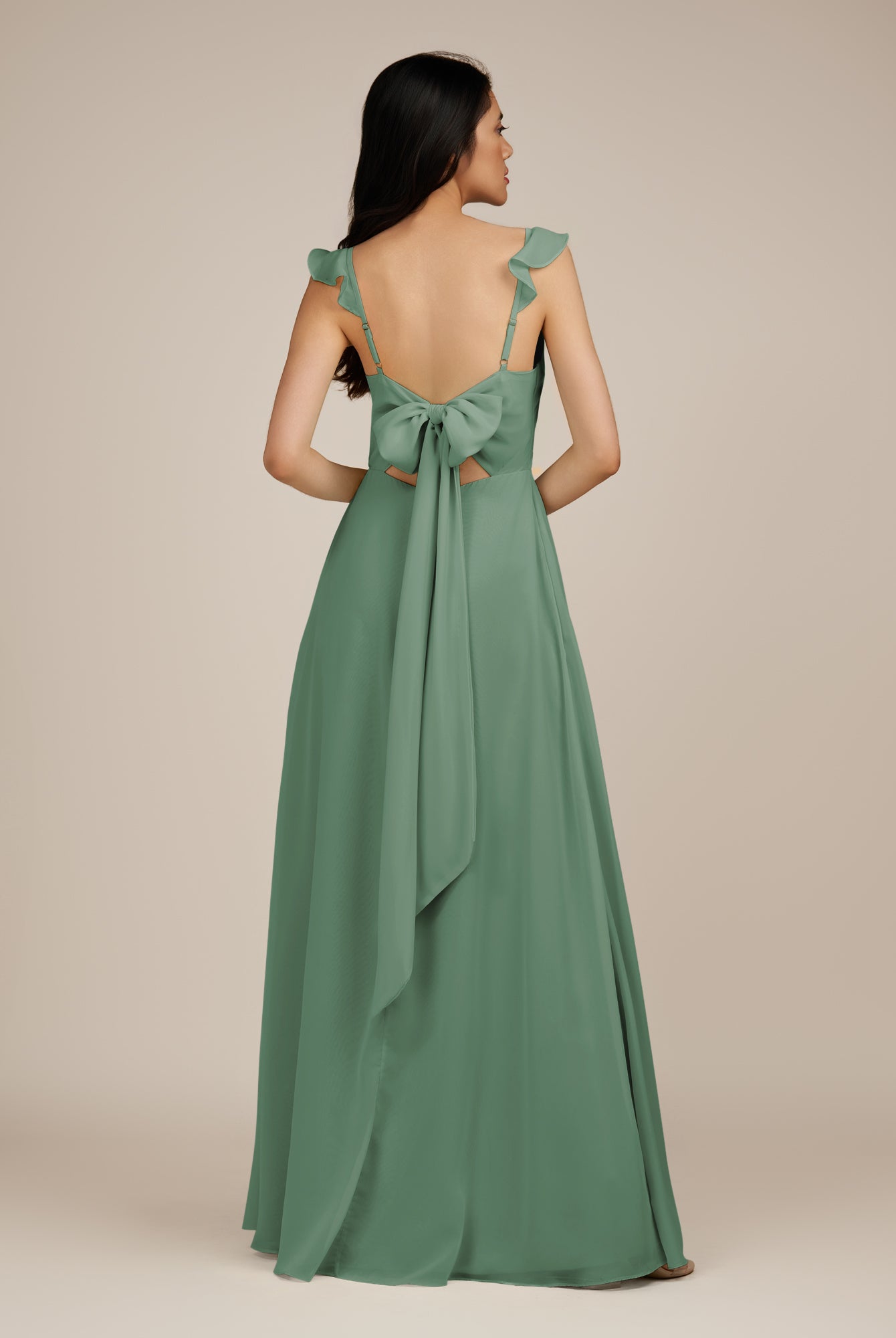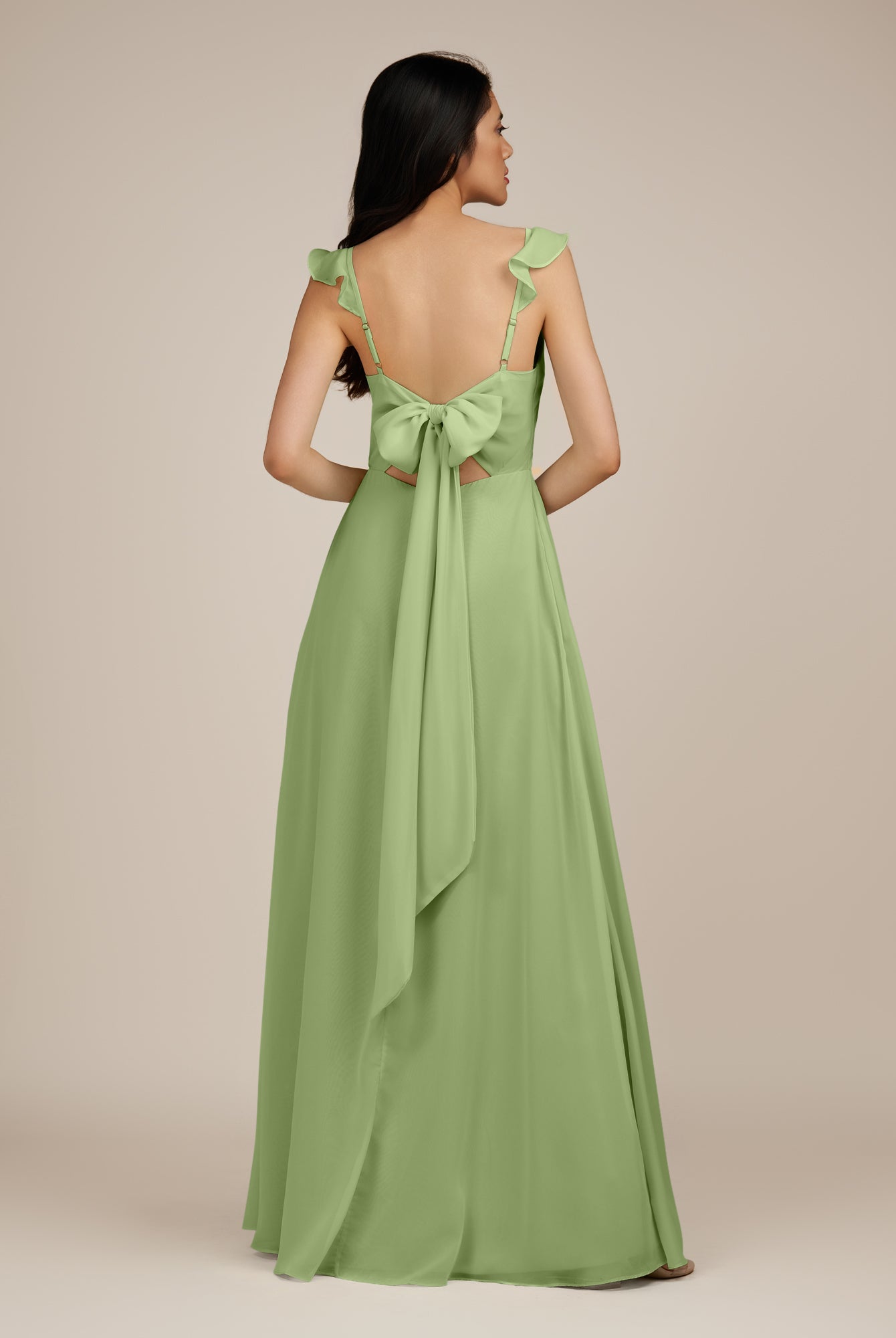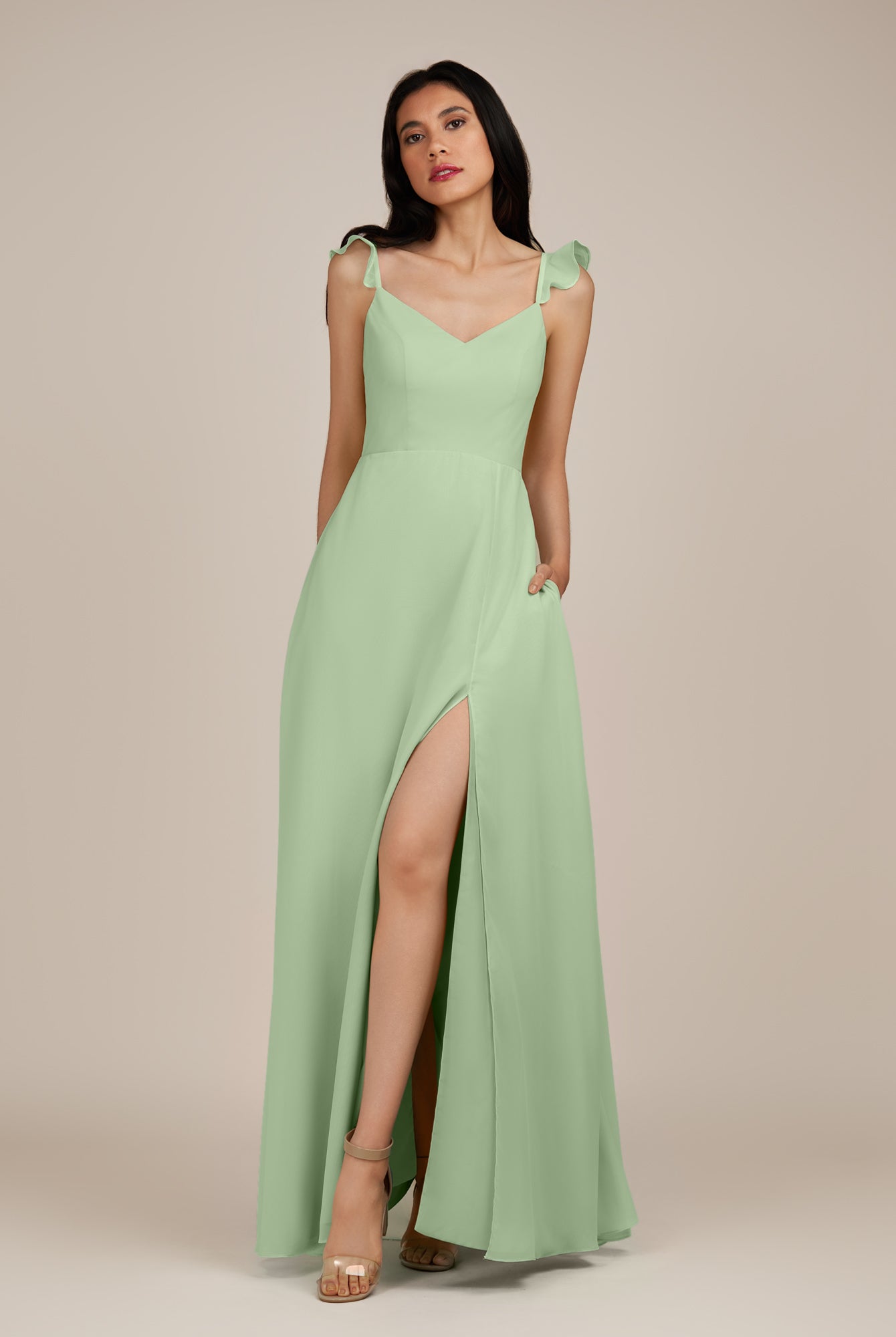 Citrine | Sage - A Line V Neck Chiffon Ruffled Long Bridesmaid Dress with Slit