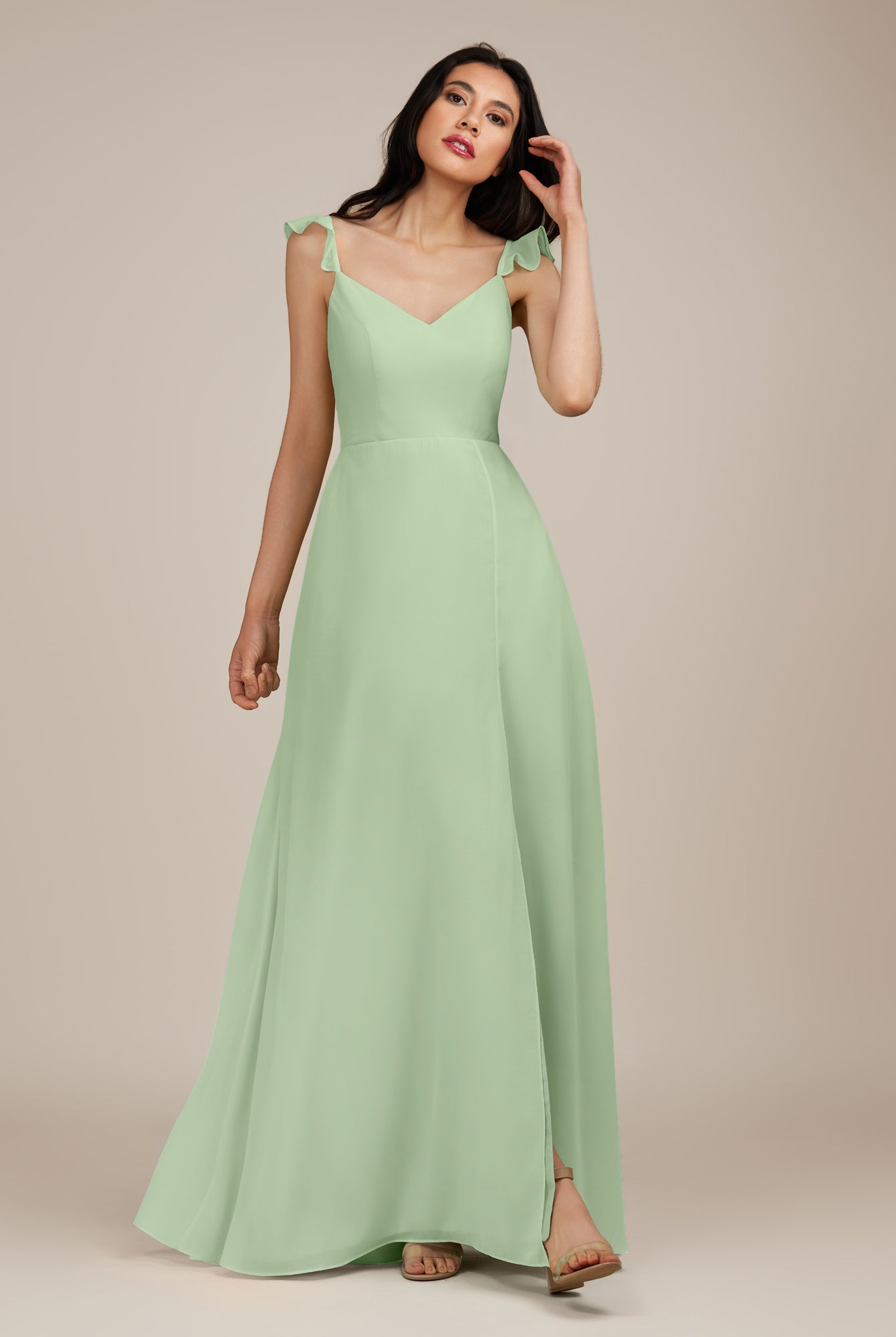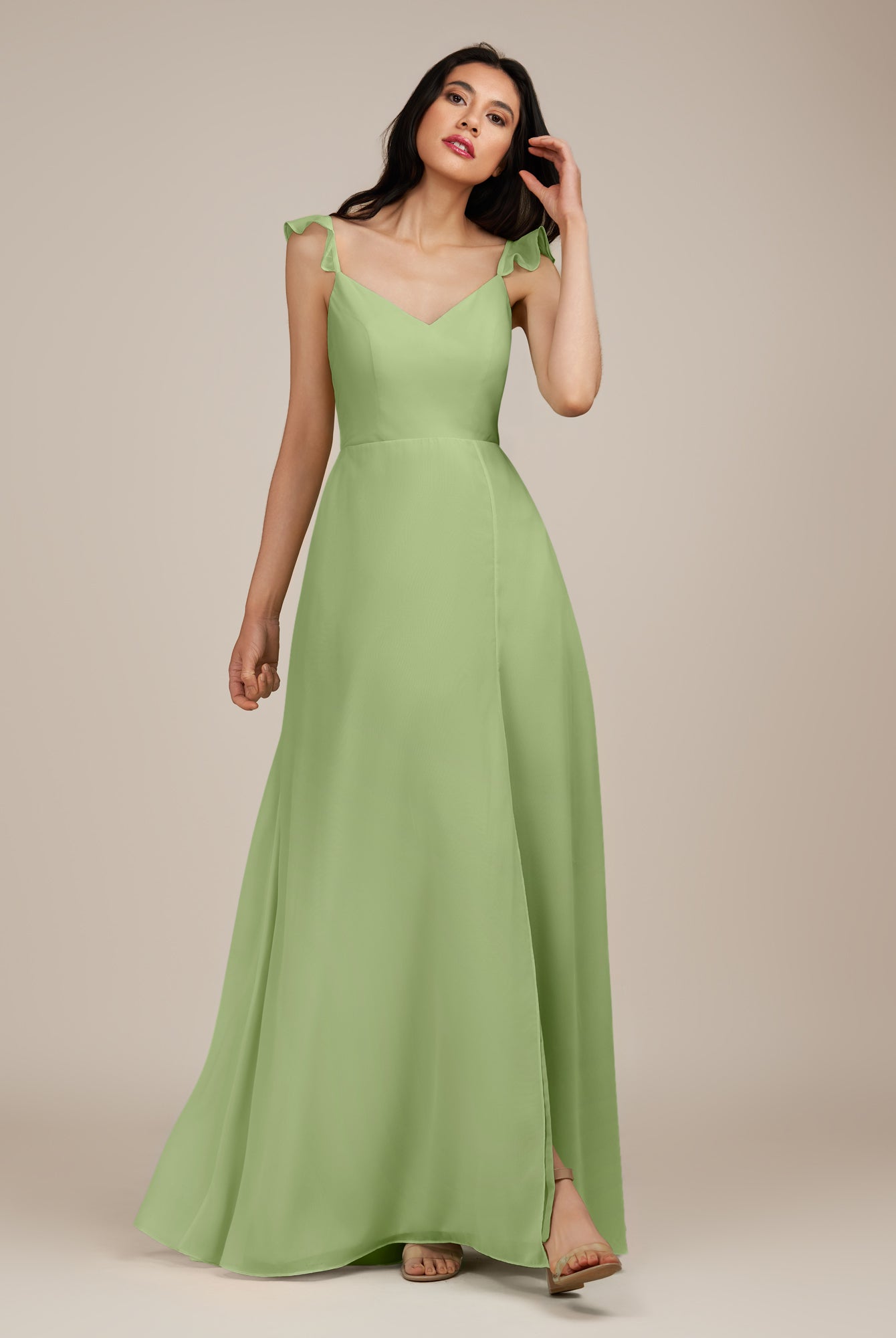 Citrine | Matcha - A Line V Neck Chiffon Ruffled Long Bridesmaid Dress with Slit