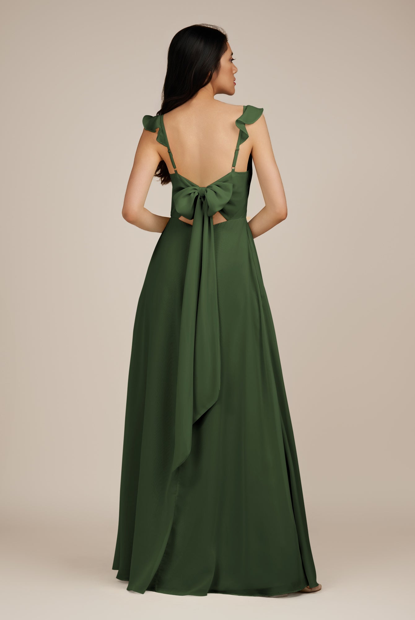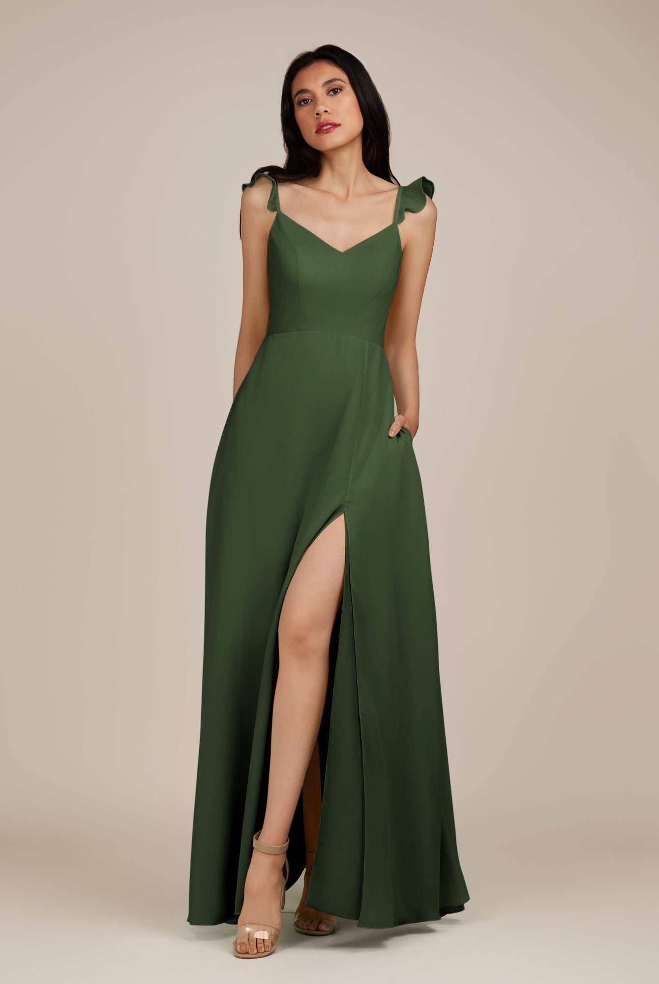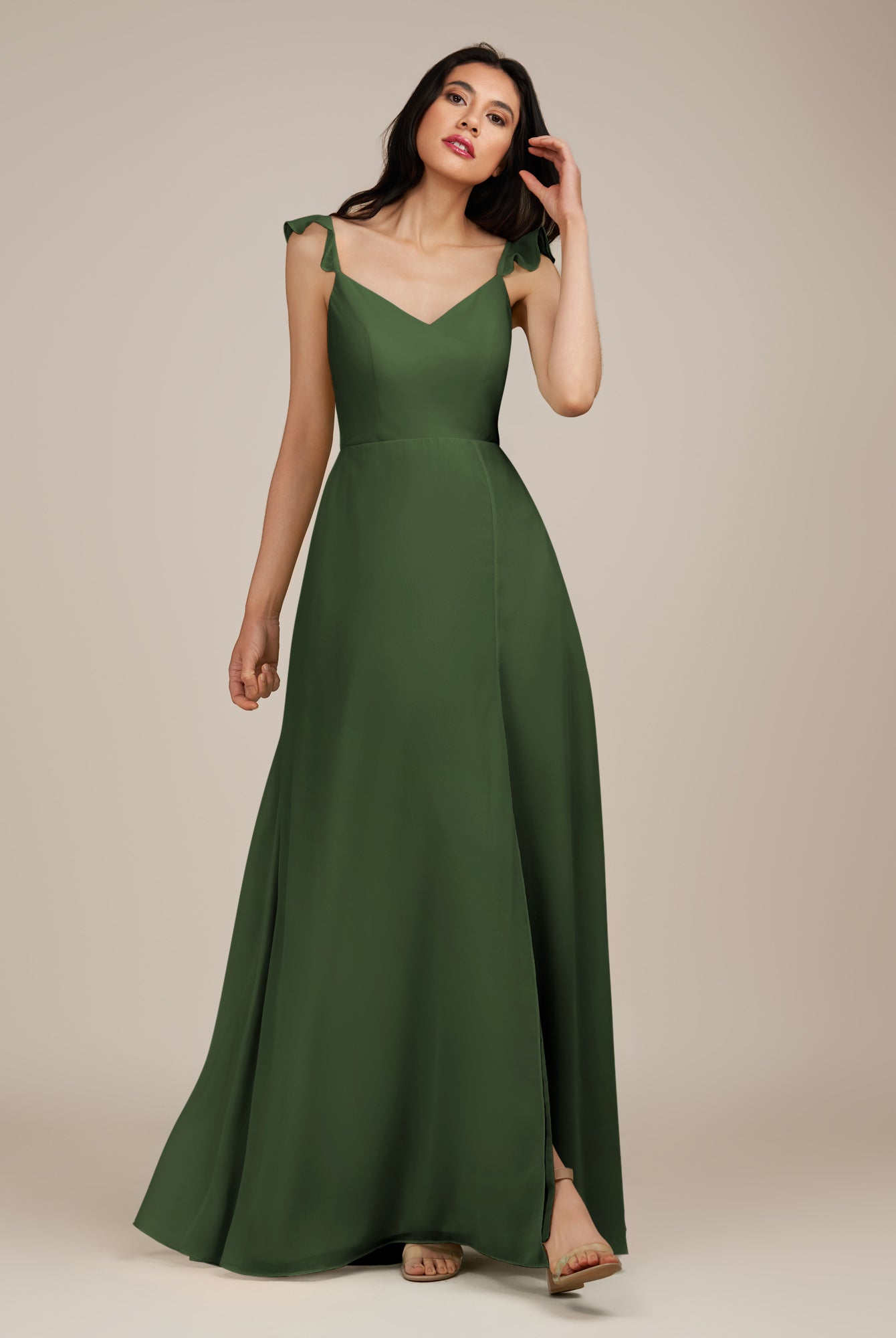 Citrine | Moss - A Line V Neck Chiffon Ruffled Long Bridesmaid Dress with Slit