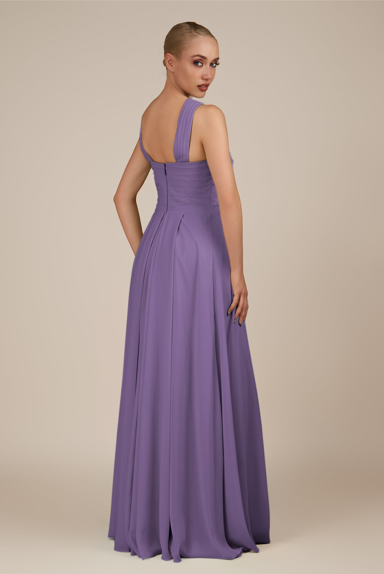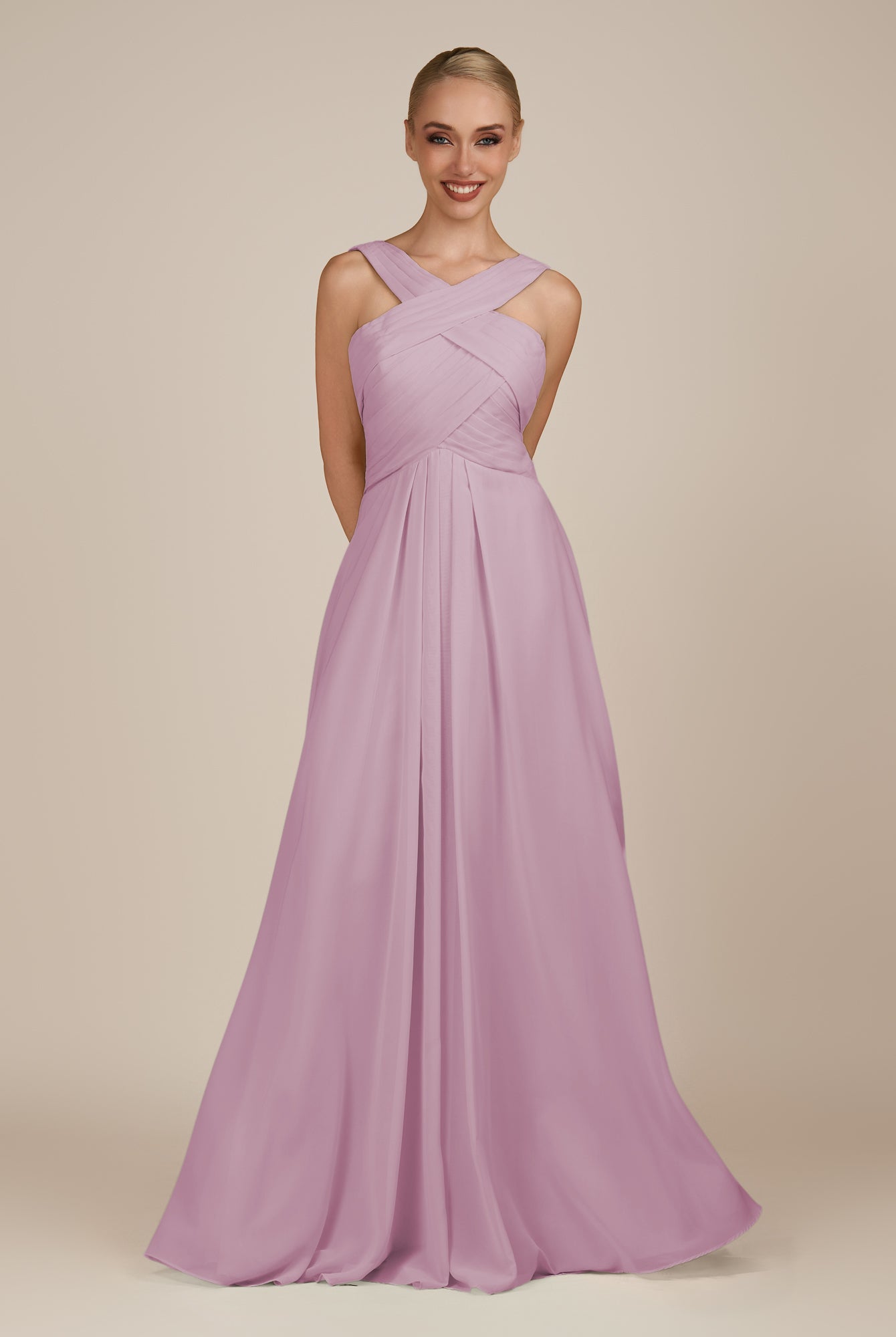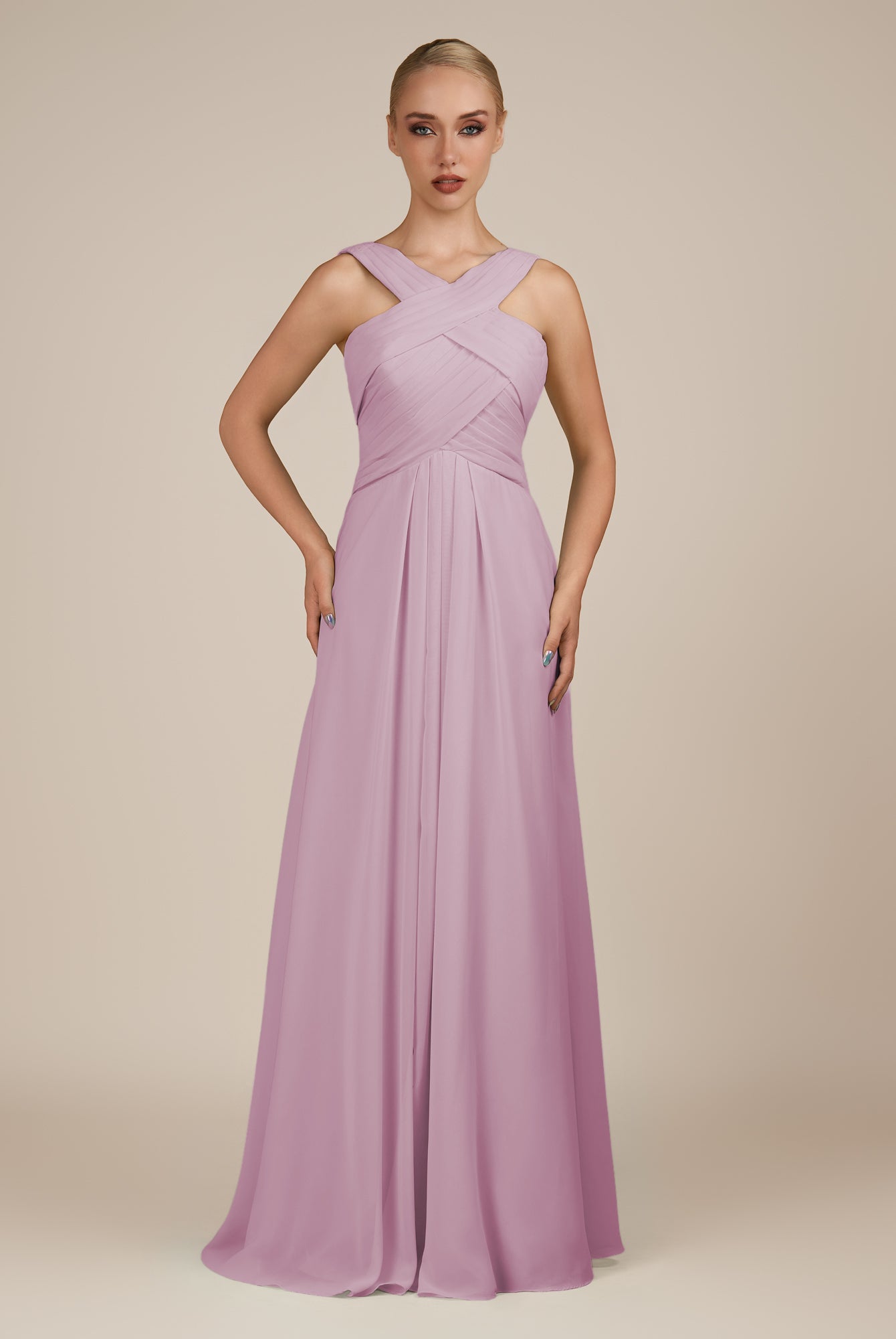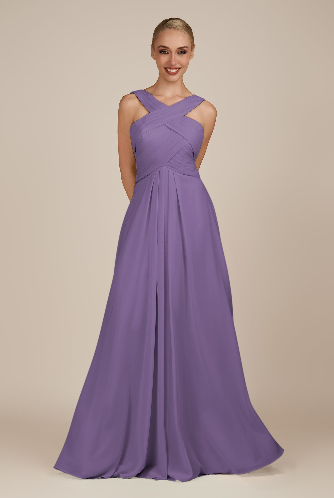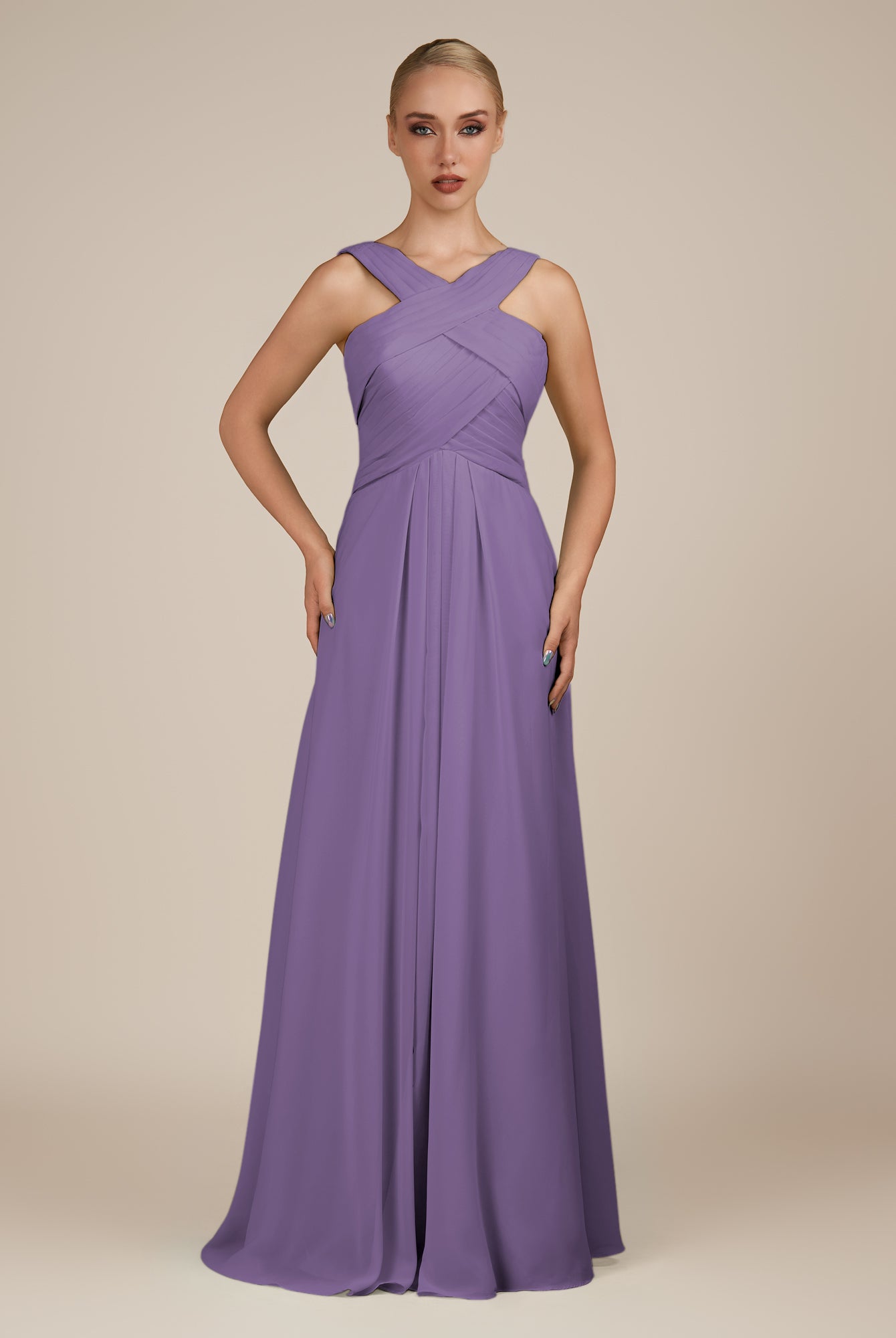 Sharlie | Wisteria - A Line Chiffon Halter Neck Long Bridesmaid Dress with Pleats