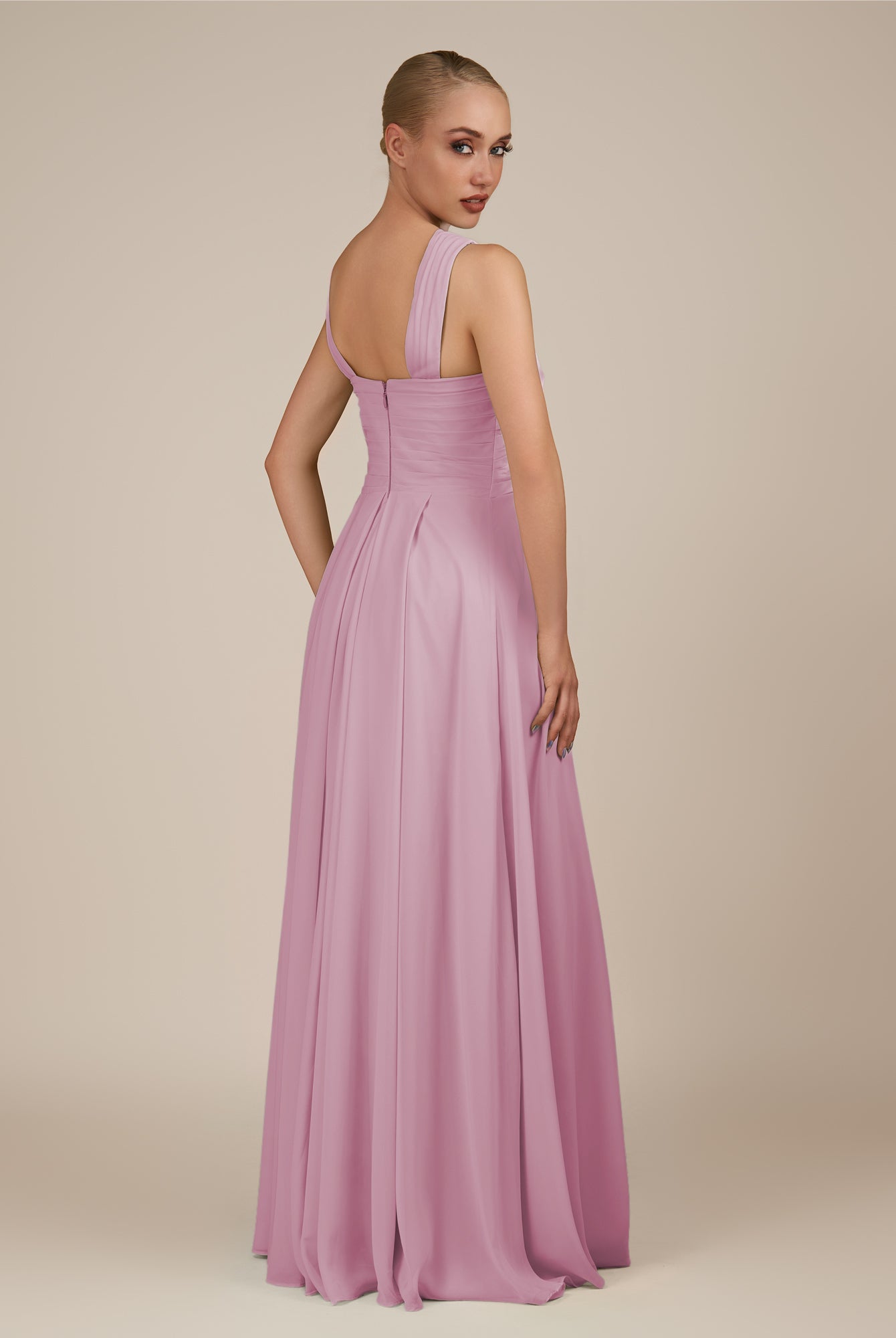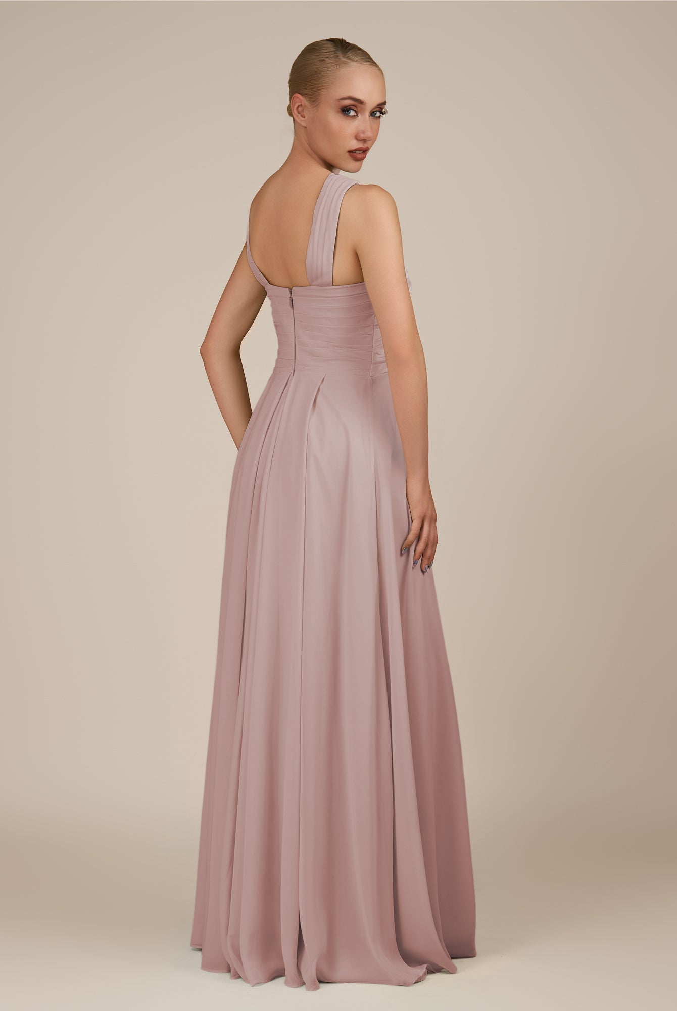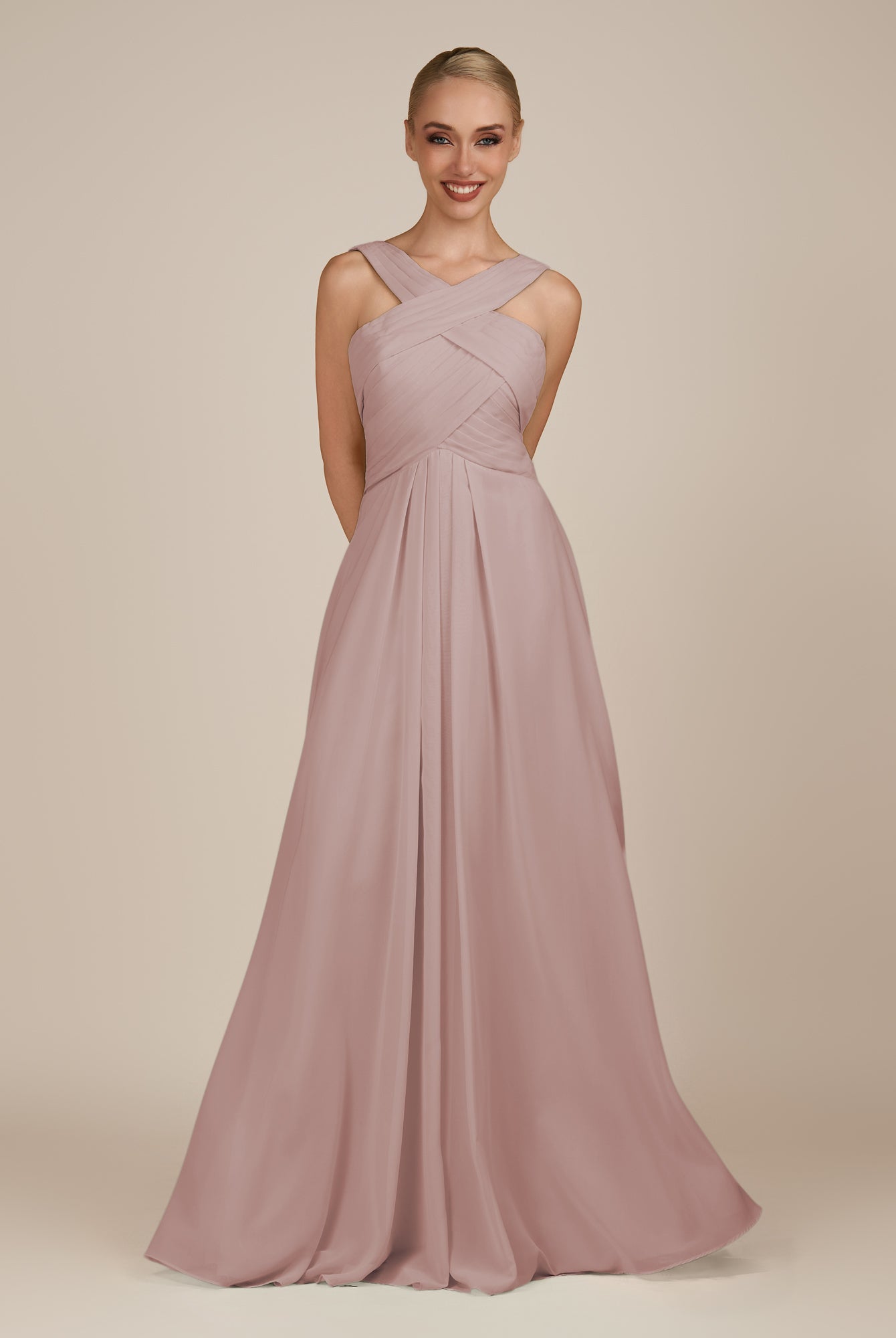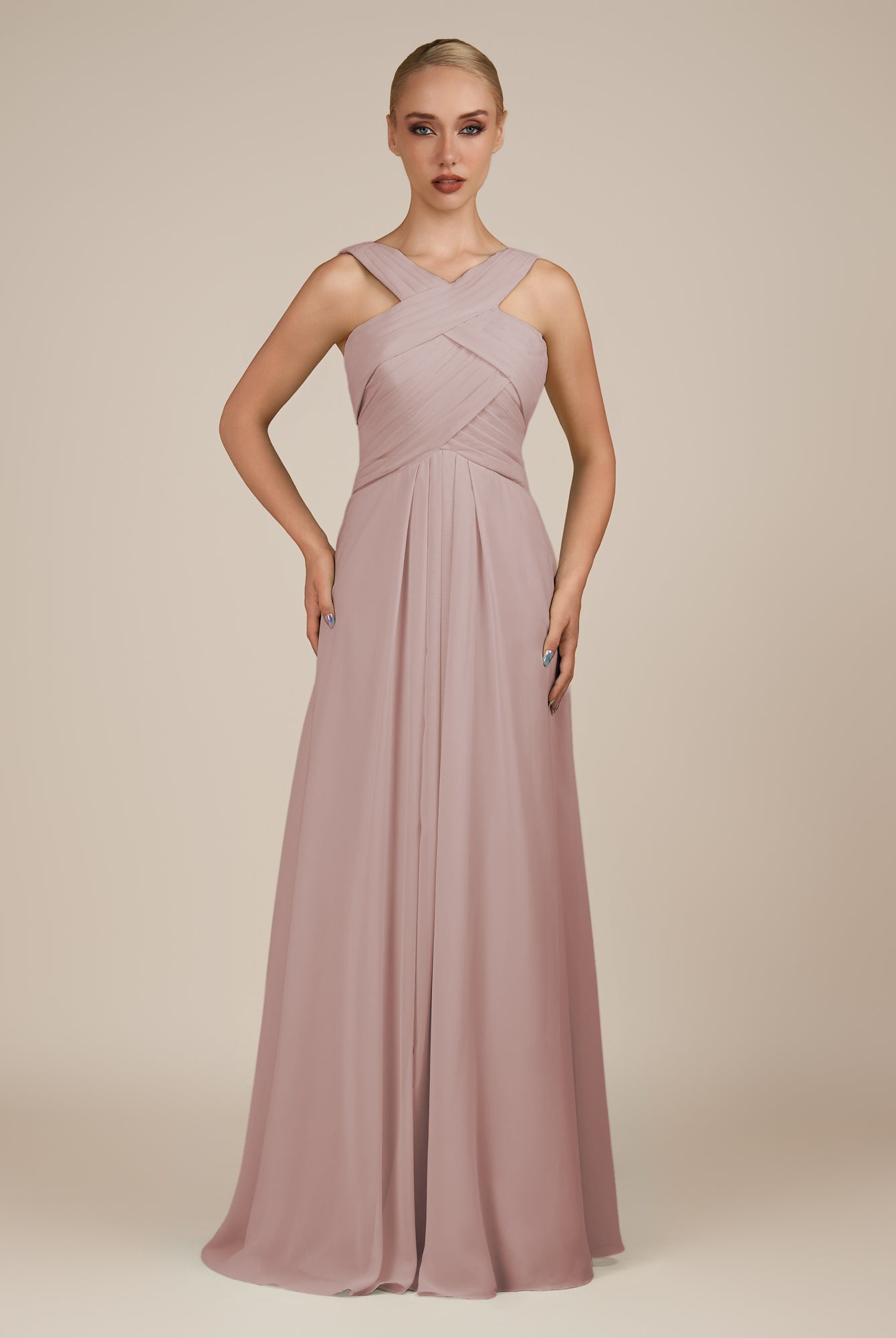 Sharlie | Vintage Mauve - A Line Chiffon Halter Neck Long Bridesmaid Dress with Pleats