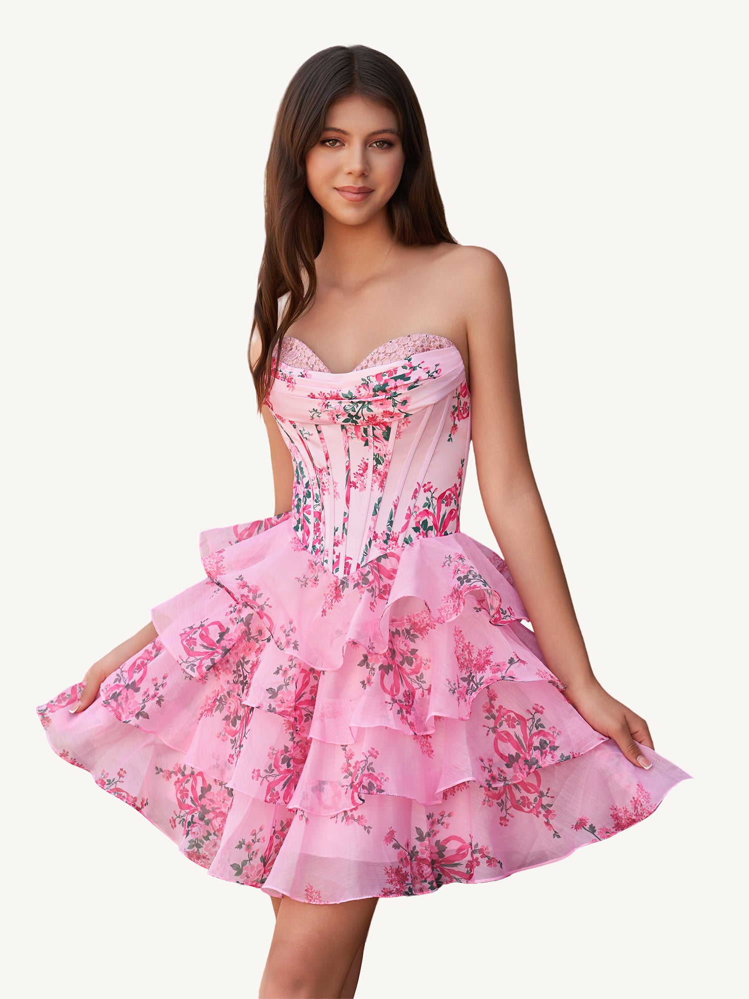 Veloria | Pink - A-line Strapless Floral Printed Chiffon Ruffles Short Homecoming Dresses