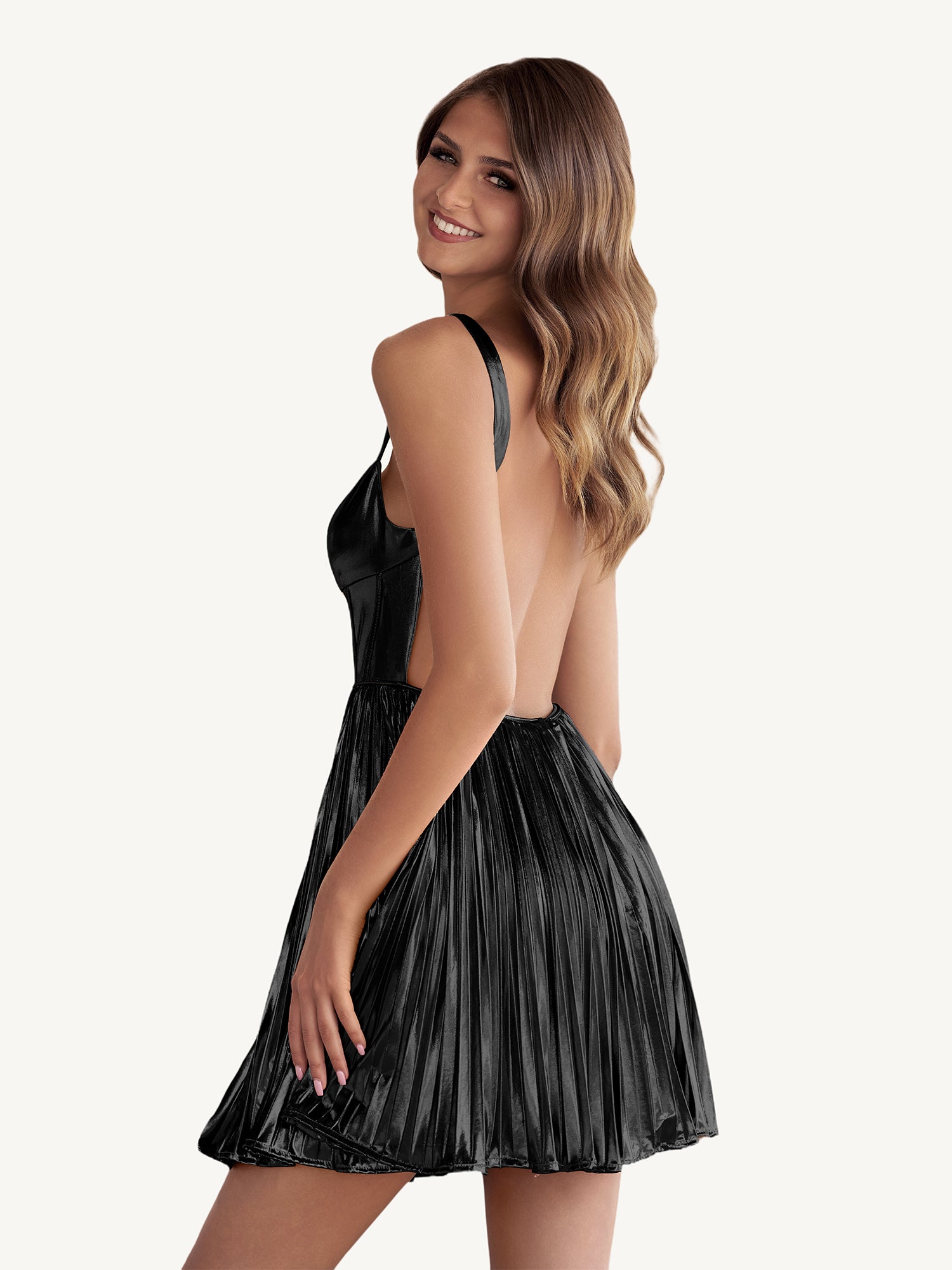 Xeni | Gold - V Neck A-Line Metallic Pleated Short Homecoming Dresses
