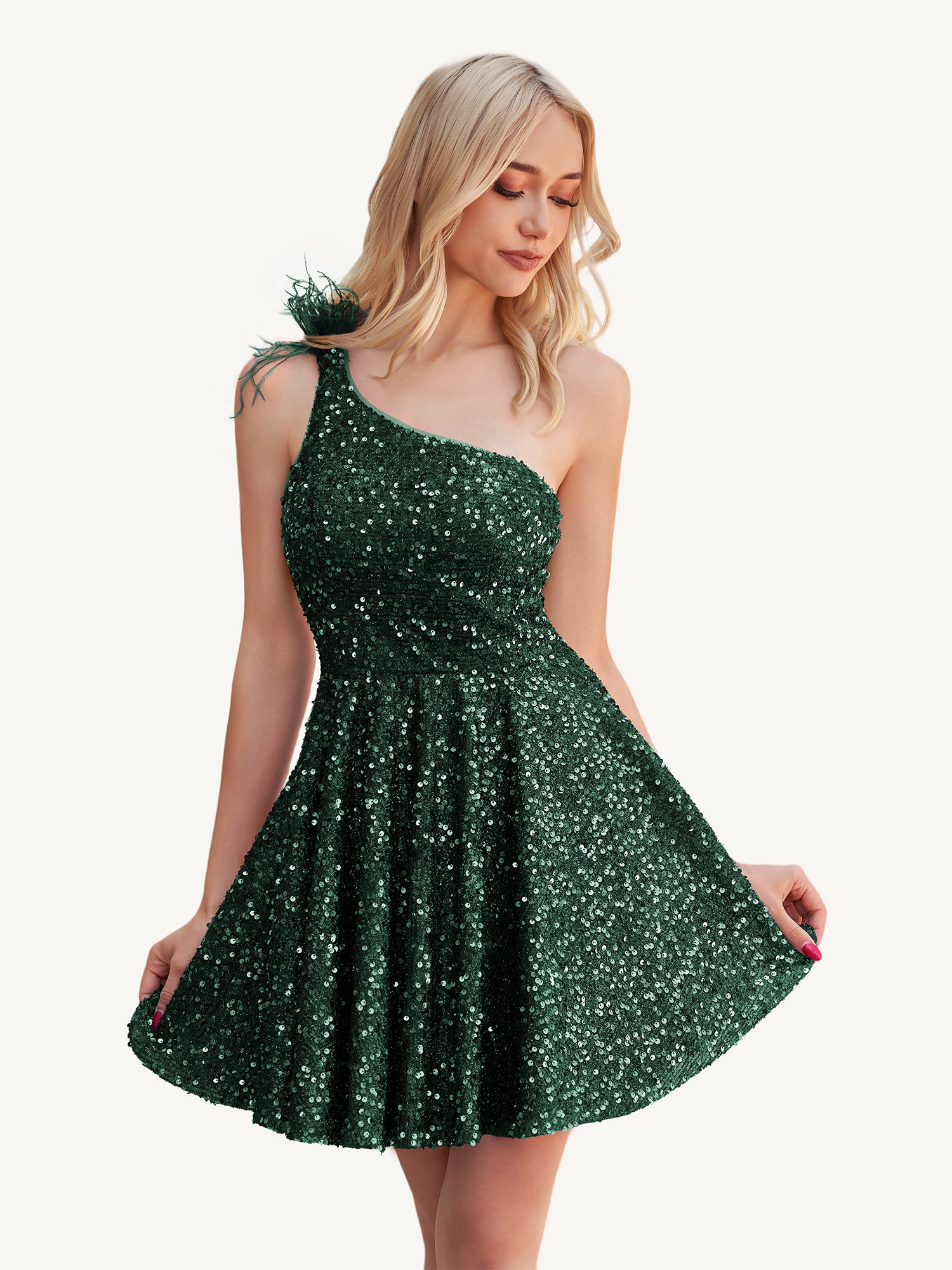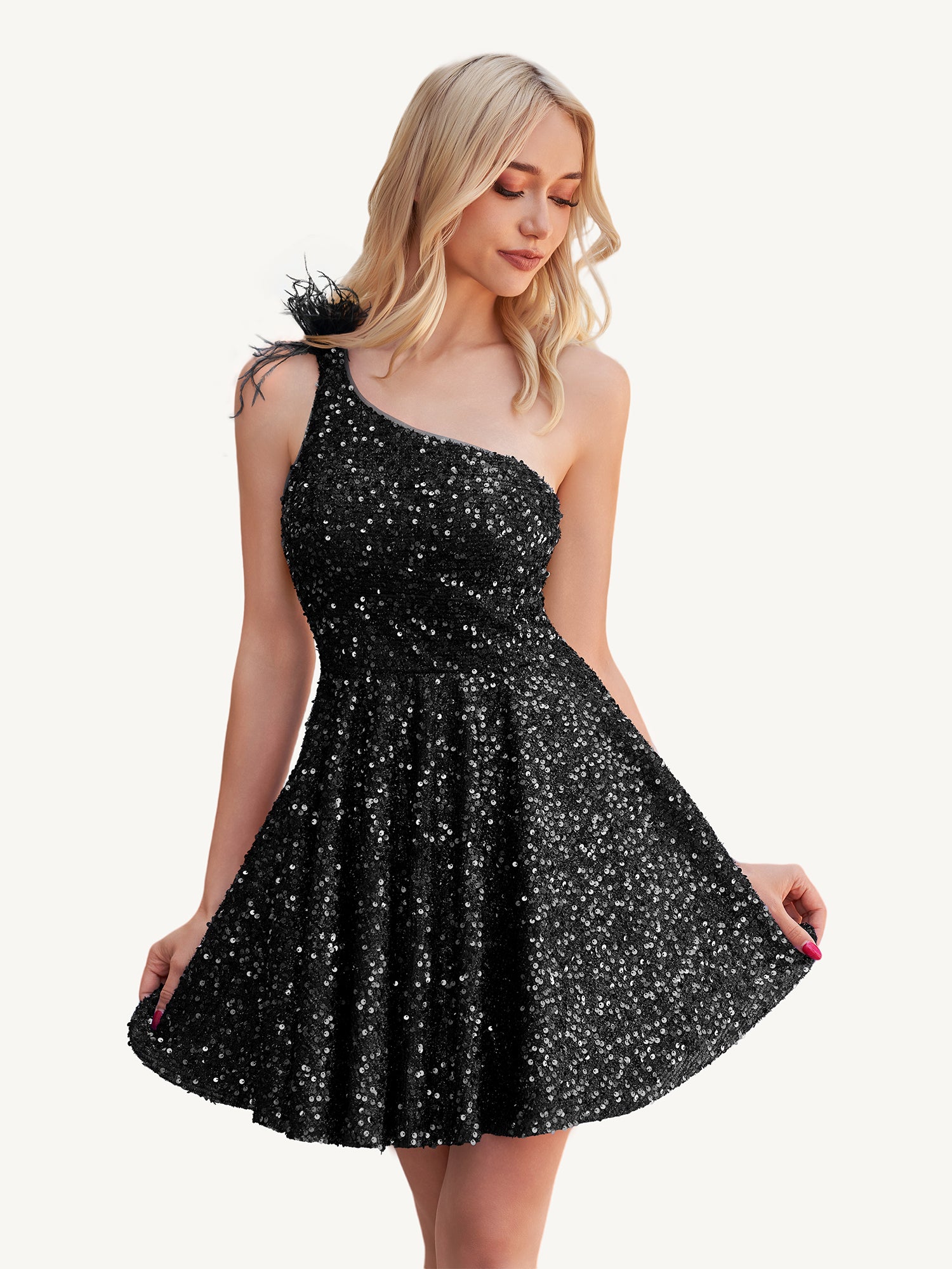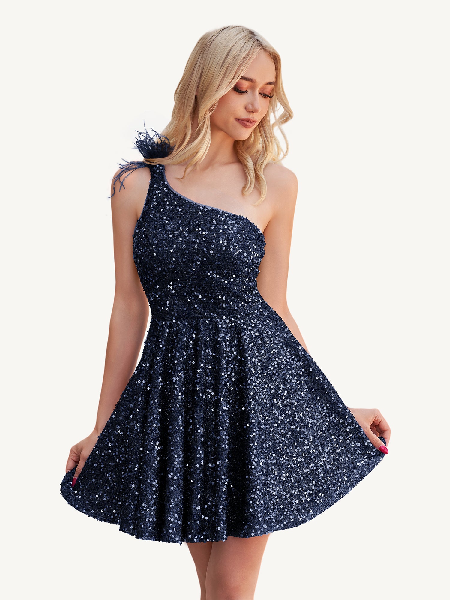 Step into the spotlight with the Holli homecoming dress,  a dazzling one-shoulder A-line design crafted from shimmering royal blue sequins and finished with a touch of dramatic feathers. The flattering silhouette and sparkling details make it a showstopper from every angle. The zipper back ensures a sleek fit, while the feather embellishment adds just the right amount of flair for a look that's unforgettable. Whether you're headed to homecoming, a cocktail party, or a glamorous night out, this dress delivers the perfect mix of elegance and bold fashion.