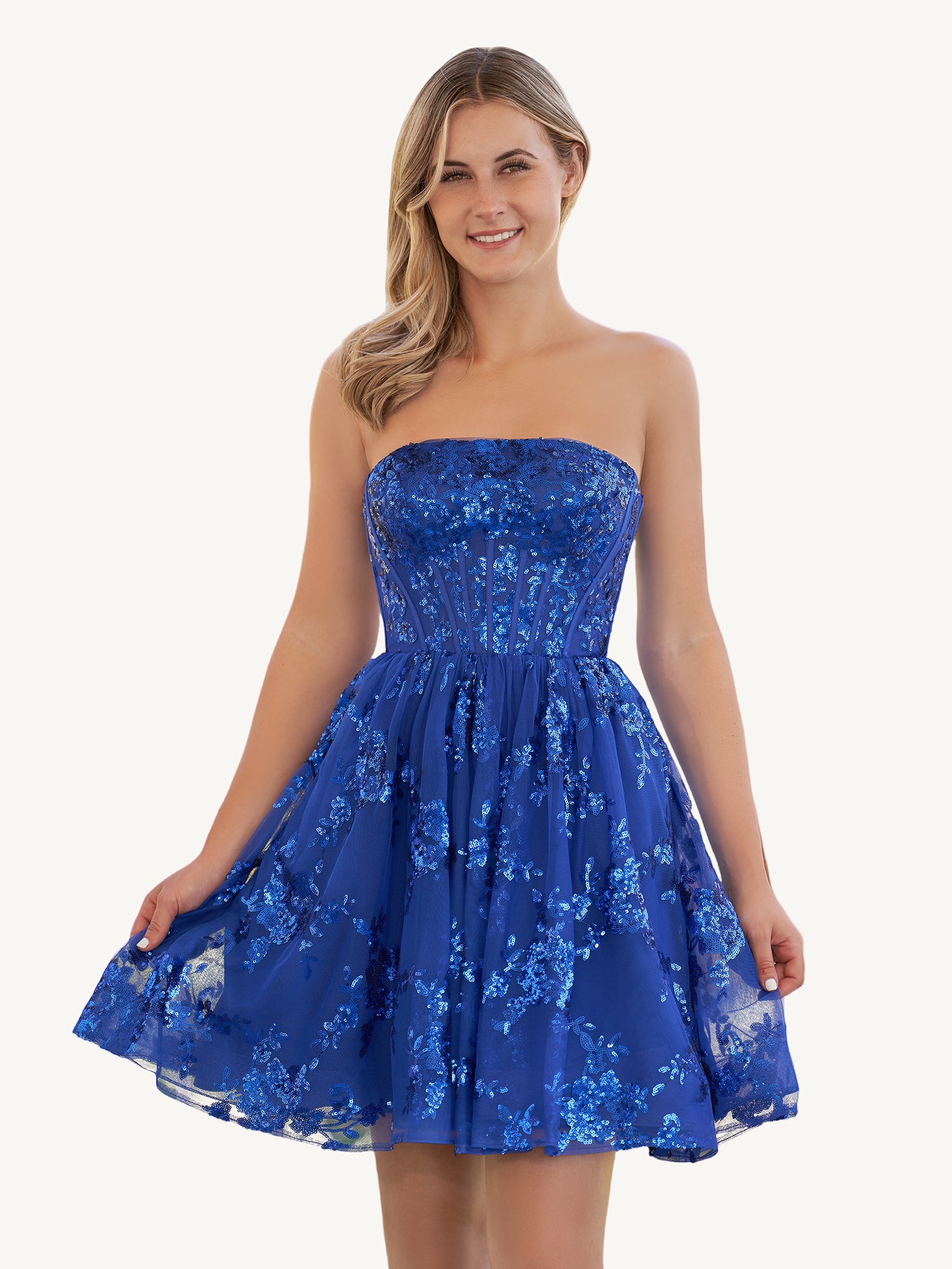 Elevate your evening with the epitome of elegance: "Ivette ." This breathtaking A-line masterpiece showcases a dance between sequined lace and whispery tulle, creating an ocean of shimmer with every step. The strapless neckline is both audacious and sophisticated, revealing just enough while keeping the allure alive. But Ivette holds a secret - functional pockets seamlessly woven into its design, blending utility with artistry. So, as you glide across the ballroom, know that every eye will be captivated not just by the dress's grandeur, but also by the confident spirit wearing it.