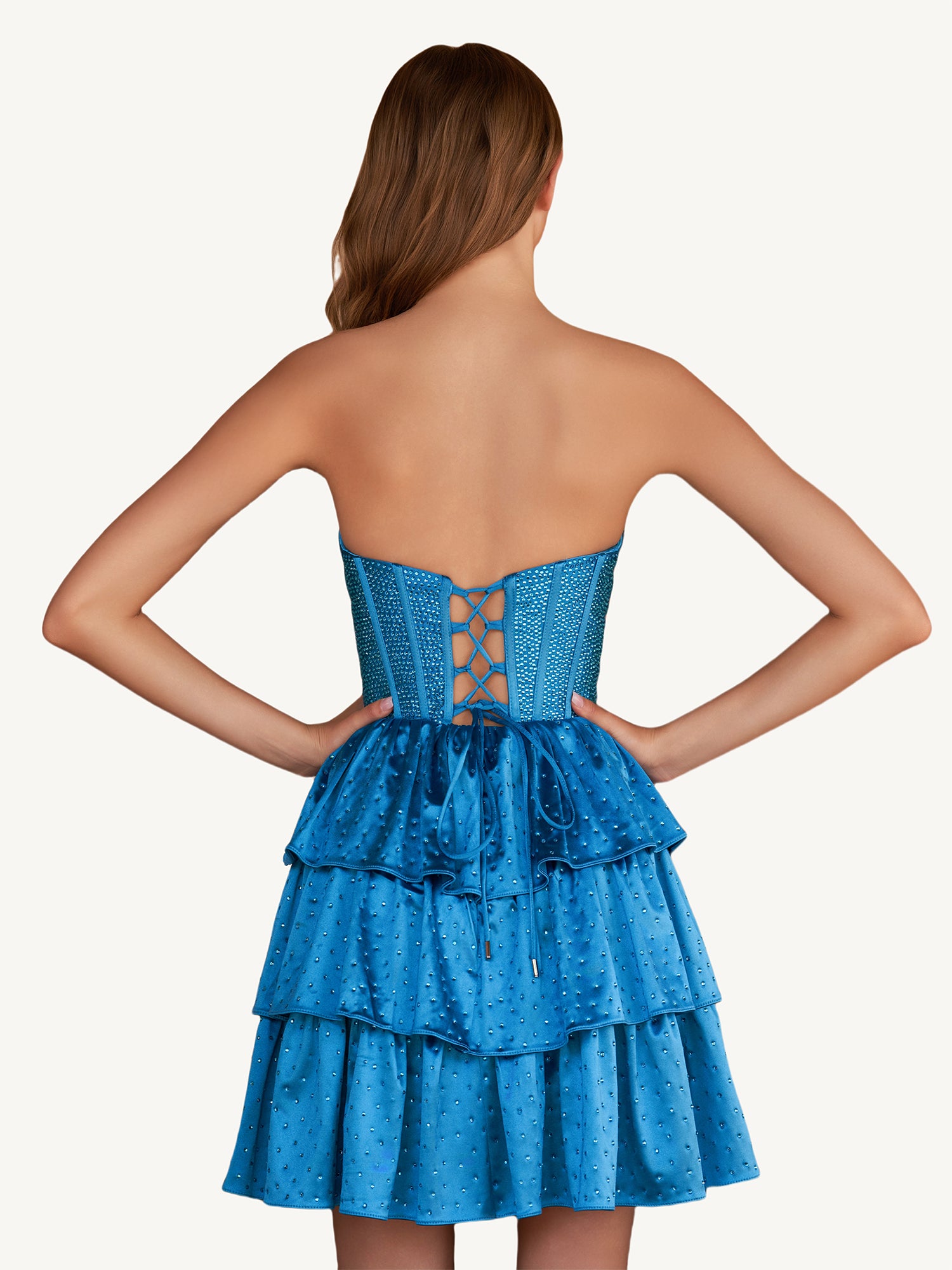 Turn heads and sparkle under the lights with our Peacock Blue Strapless Ruffle Tiered Homecoming Dress. Featuring a flattering A-line silhouette and a sweetheart neckline, this dazzling dress is covered in shimmering beads that catch every angle. The tiered ruffle skirt adds a playful and voluminous flair, while the lace-up back ensures a perfect, adjustable fit. Available in a range of romantic hues, this dress is the perfect blend of fun and elegance for cocktail parties or any special evening event.