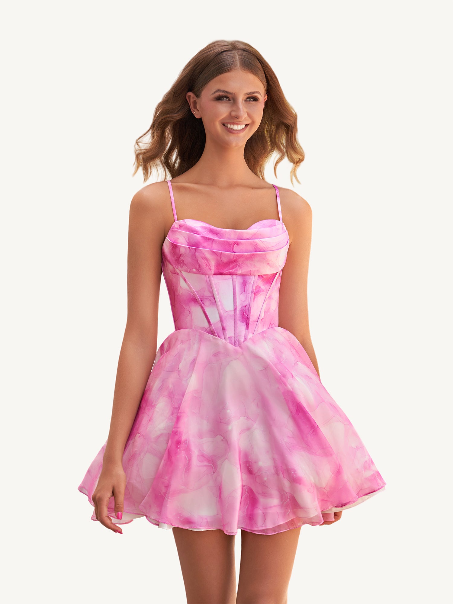 Cyra | Blue - A Line Floral Chiffon Corset Spaghetti Straps Homecoming Dresses