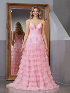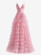 Light Pink A-Line Tiered Spaghetti Straps Tulle Prom Dress