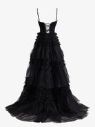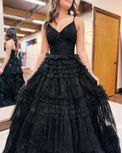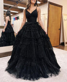 Emerson | Black A-Line Deep V Neck Tiered Long Glitter Tulle Prom Dress