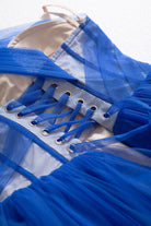 This one-shoulder combination a-line midi dress is made of light blue tulle fabric. The dress has a puffy midi skirt with a short light blue underskirt. The semi-transparent corset bustier has lace-up closure. The heart-shaped neckline is covered with an asymmetrical sheer sleeve.