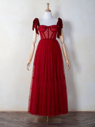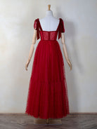 Looking for a unique and beautiful prom dress Look no further than this stunning semi-sweetheart neckline ankle-length tulle red prom dress from kissdress.com! This dress features intricate ruffles, a sleeveless design, and an ankle-length tulle skirt adorned with delicate dots. It's the perfect choice for any formal occasion!