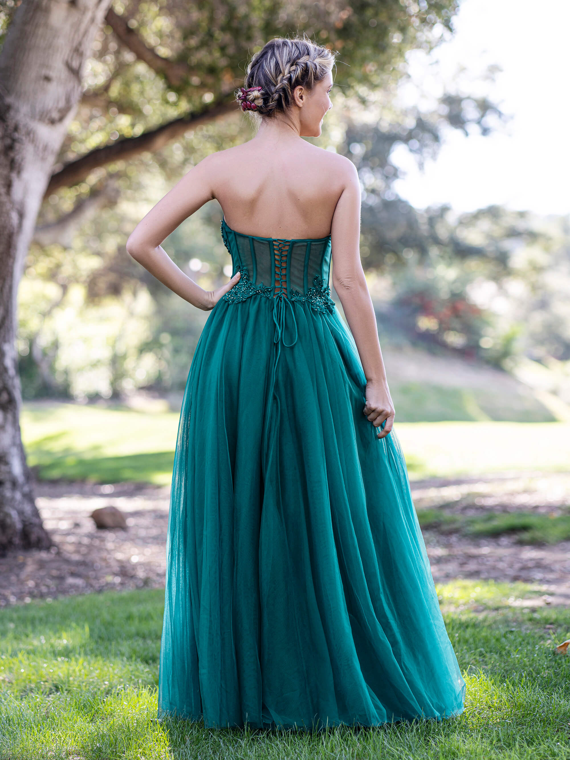 - Embellishment: Illusion corset bodice & lace appliques and beadings
