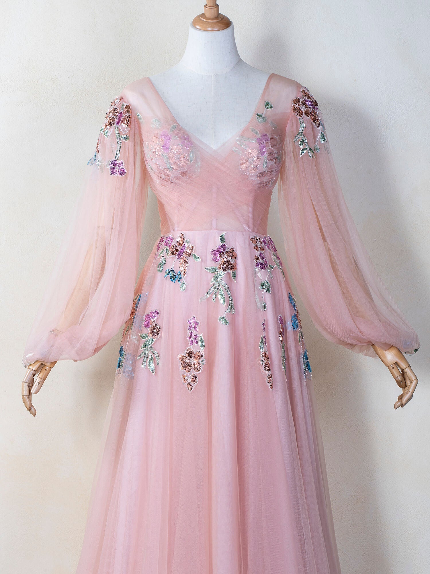 Check out this N-neck floor-length tulle pink prom dress from kissdress! Special for your prom night It's embroidered with delicate details and features long puffy sleeves for a touch of elegance. You'll be sure to turn heads when you walk into the room in this gorgeous dress!