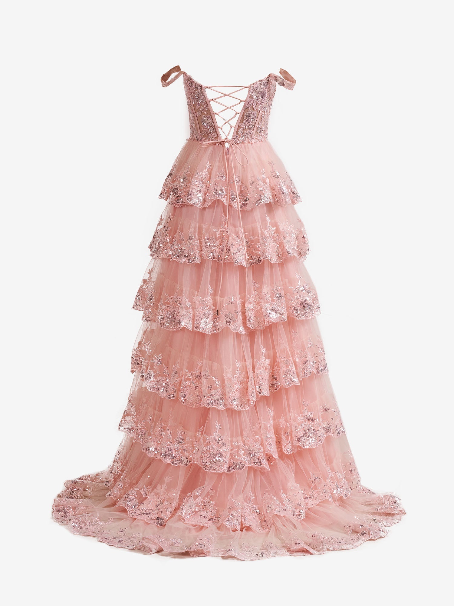 Pink Crystal Sequins Princess A Line Off the Shoulder Prom Dress with Lace Ruffles