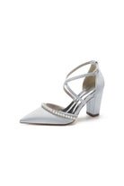 Elevate your style with the timeless sophistication of these Champagne Satin Pumps, featuring delicate pearl and metal accents. The sleek pointed toe and chunky 3.35-inch heels add a modern touch, while the refined cross-strap closure ensures a secure fit. Experience all-day comfort with a soft artificial leather lining and reliable traction from the durable rubber sole. These pumps perfectly combine elegance and practicality for a truly stunning look.