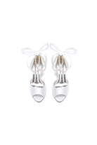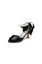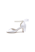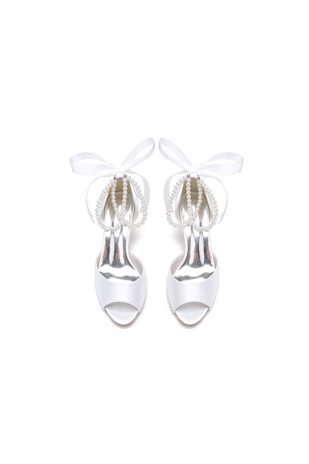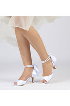 Chic White Satin Heels Featuring a Pearl-Embellished Bow