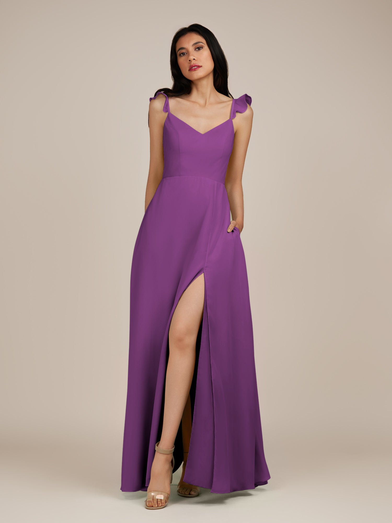 Citrine | Amethyst - A Line V Neck Chiffon Ruffled Long Bridesmaid Dress with Slit