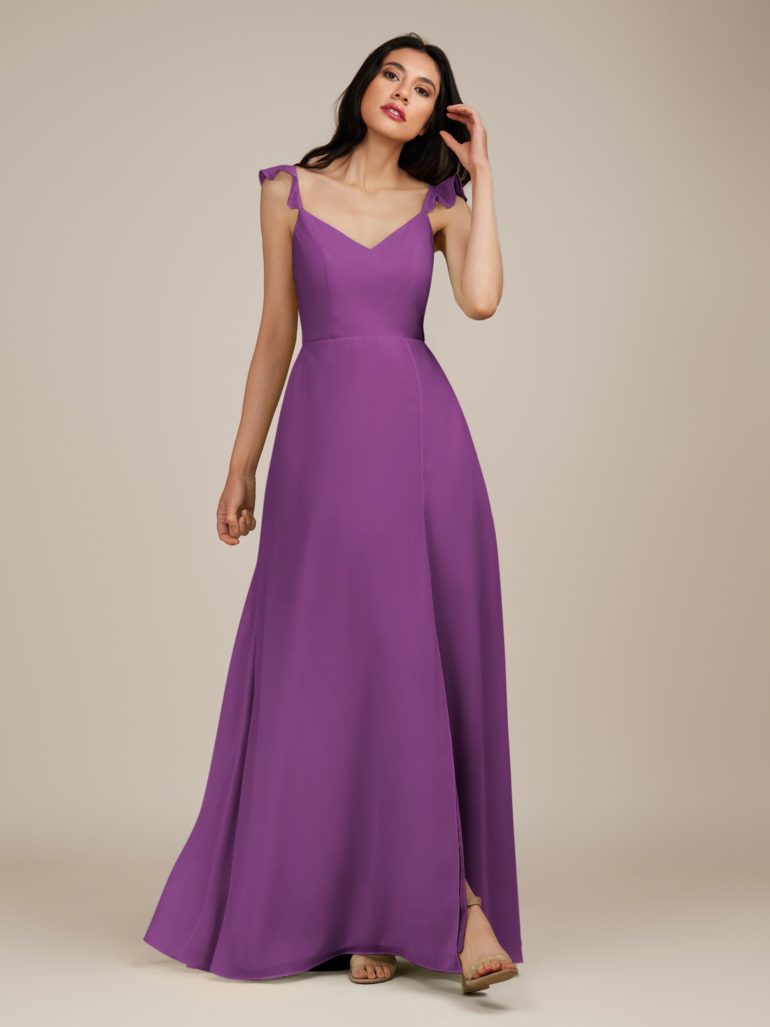 Citrine is a graceful and stylish choice for your bridal party. Crafted from soft chiffon, she features a flattering V-neckline and a sleeveless bodice for a modern, elegant look. Her floor-length A-line skirt flows beautifully with every step, accented by delicate ruffles and a subtle side slit for added movement and charm. Finished with a smooth zipper back, Citrine blends timeless sophistication with contemporary style, perfect for weddings and special occasions.